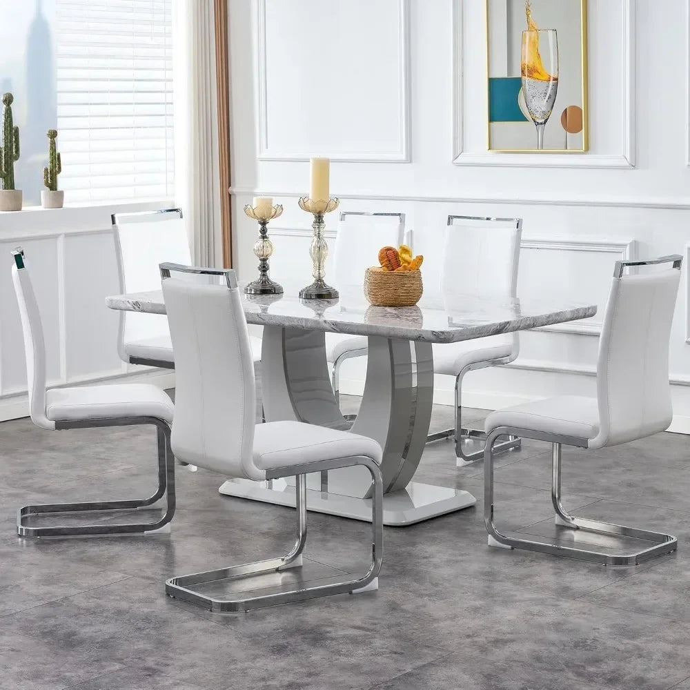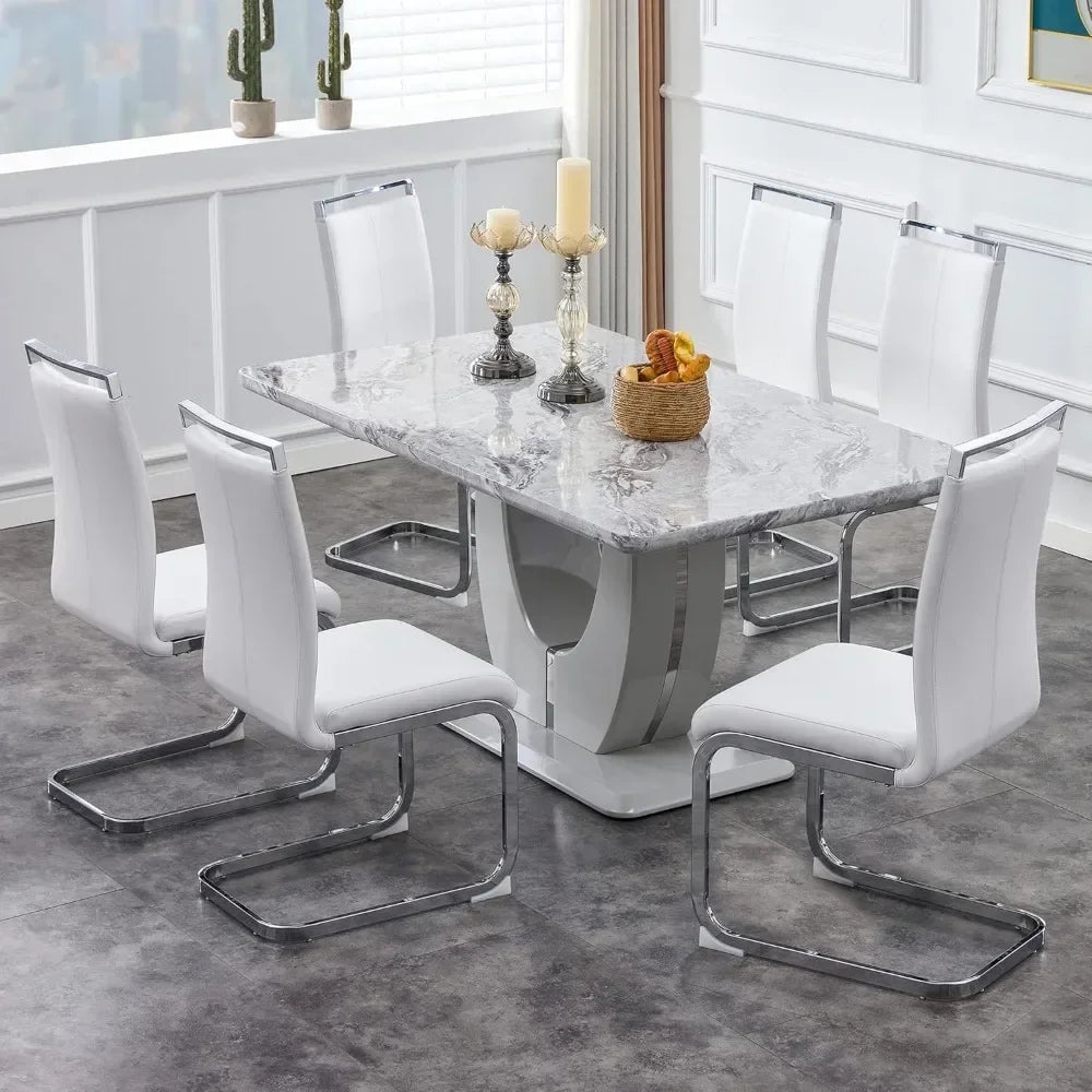 63" 7-Piece Dining Table Set, Faux Marble Table with 6 White PU Leather Dining Chairs, Dining Table and Chairs Set