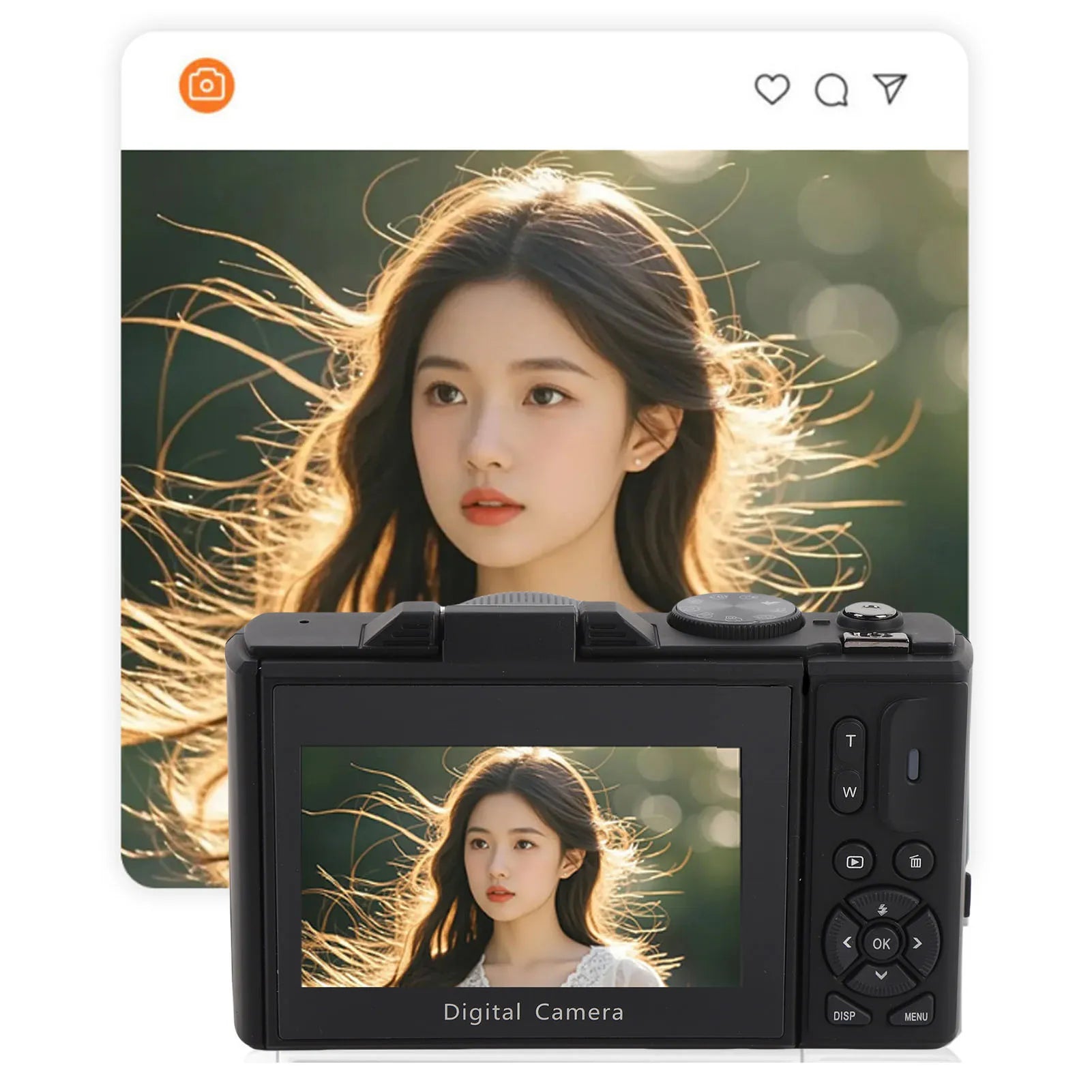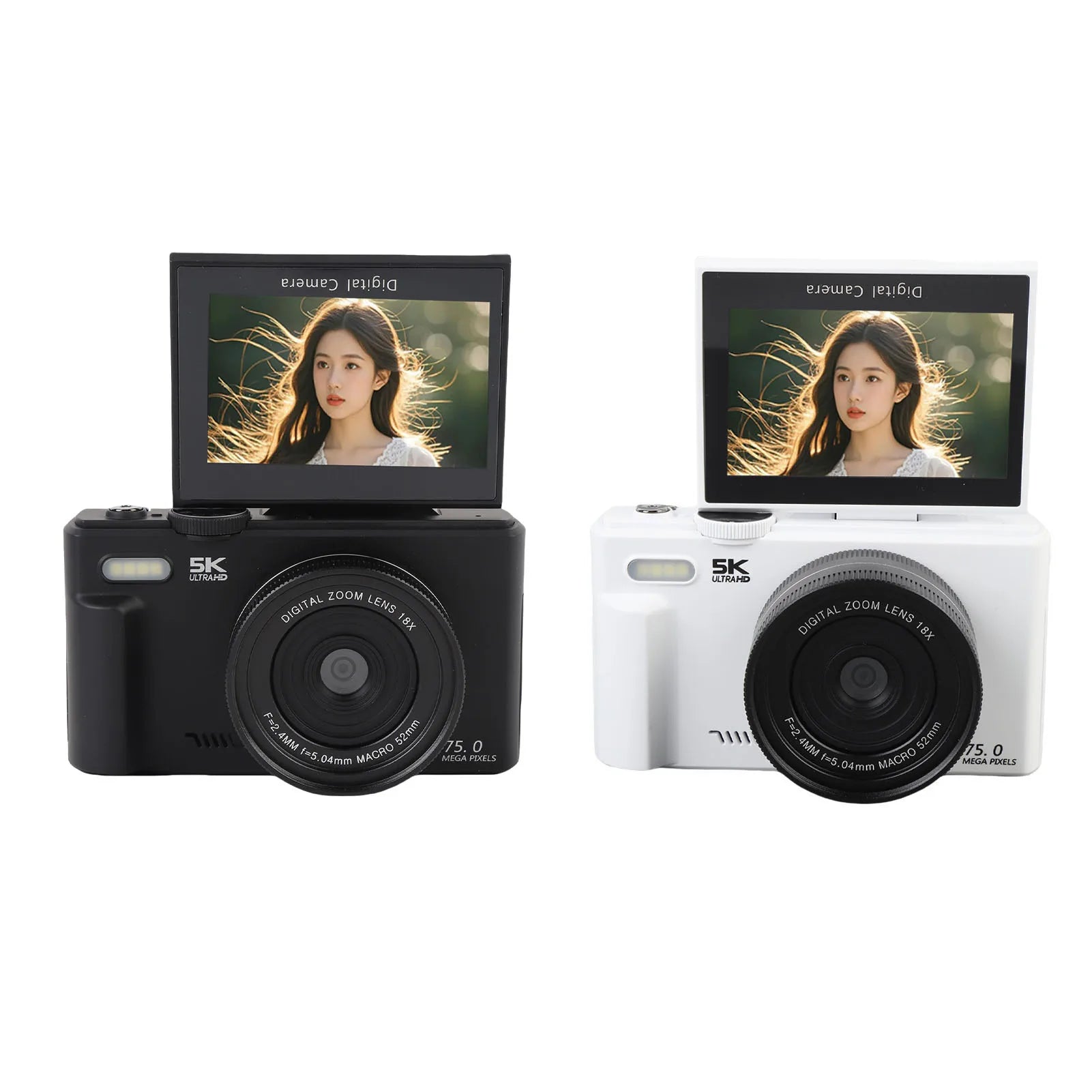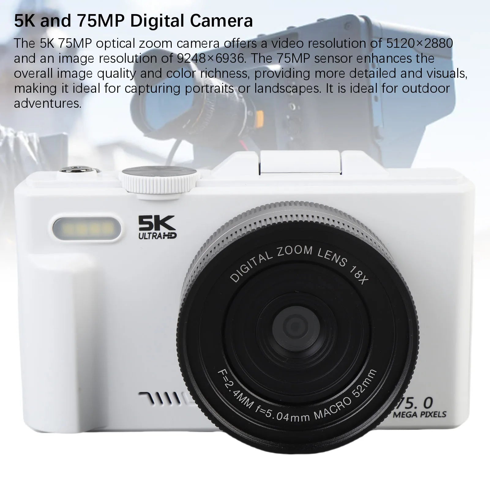 1. 5K and 75MP Digital Camera: The 5K 75MP optical zoom camera offers a video resolution of 5120×2880 and an image resolution of 9248×6936. The 75MP sensor enhances the overall image quality and color richness, providing more detailed and visuals, making it ideal for capturing portraits or landscapes. It is ideal for outdoor adventures.2. 18x Optical Zoom: This camera provides up to 18x zoom, ideal for parties, travel, and everyday moments. Digital zoom enlarges the image using the sensor, which often results in blurriness, while optical zoom adjusts the lens to magnify distant objects, ensuring high image quality. Paired with a 180° flip 3 inch HD screen, it makes selfies stand out even more.