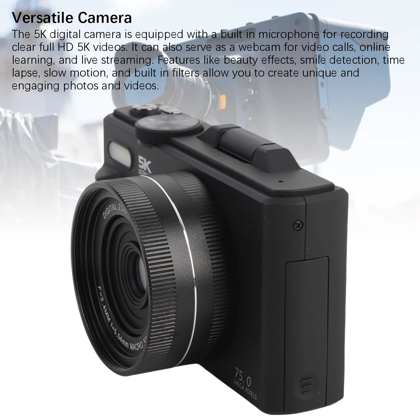 5. Versatile Camera: The 5K digital camera is equipped with a built in microphone for recording clear full HD 5K videos. It can also serve as a webcam for video calls, online learning, and live streaming. Features like beauty effects, smile detection, time lapse, slow motion, and built in filters allow you to create unique and engaging photos and videos.
