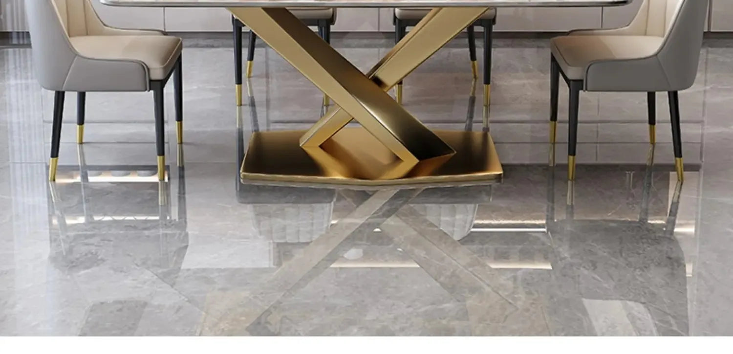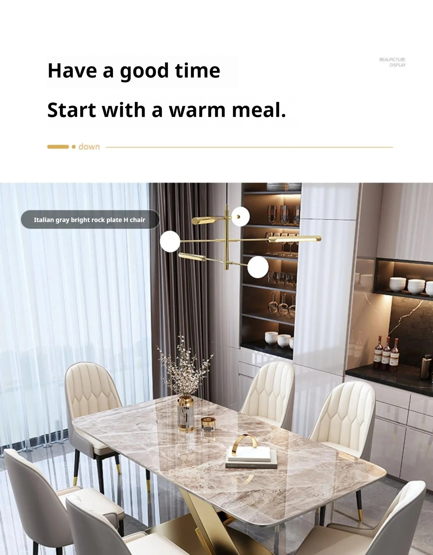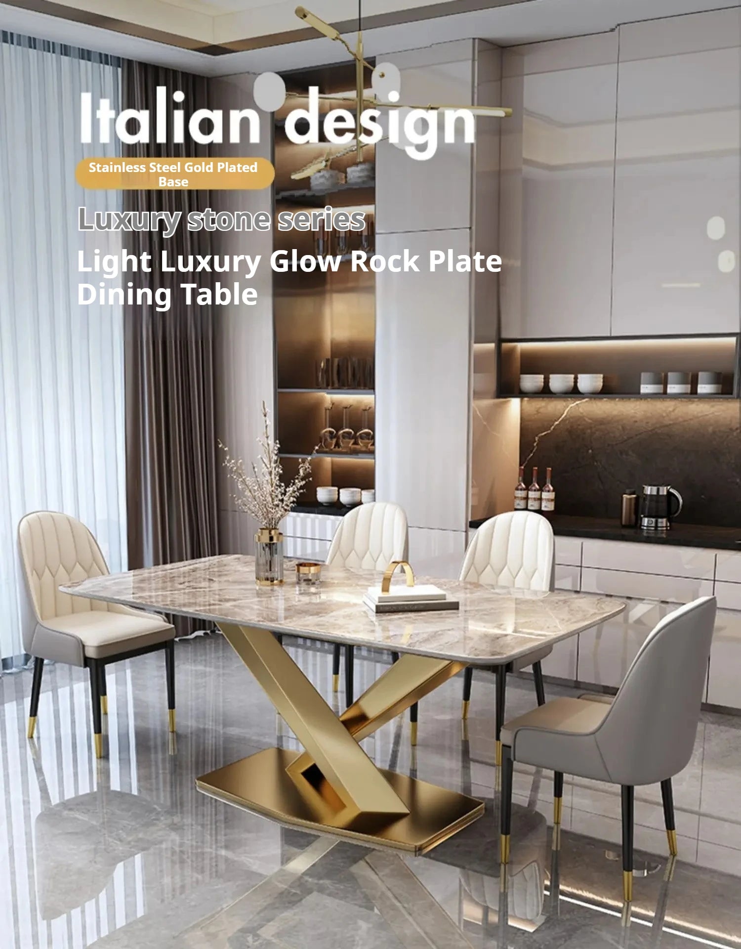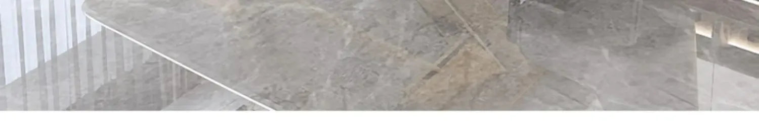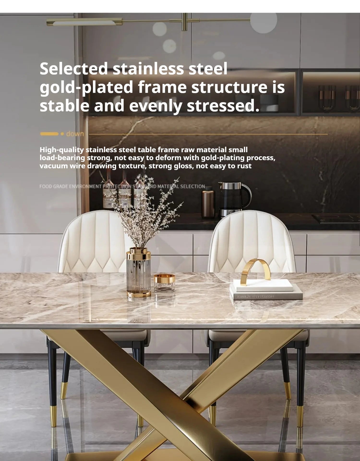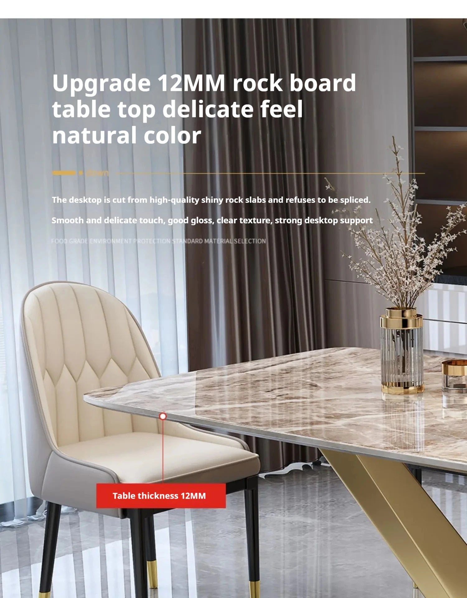 providing strong support and giving the dining table a light yet stable visual effect. The cold luster of metal contrasts sharply with the warm texture of rock slabs, yet harmoniously coexists,