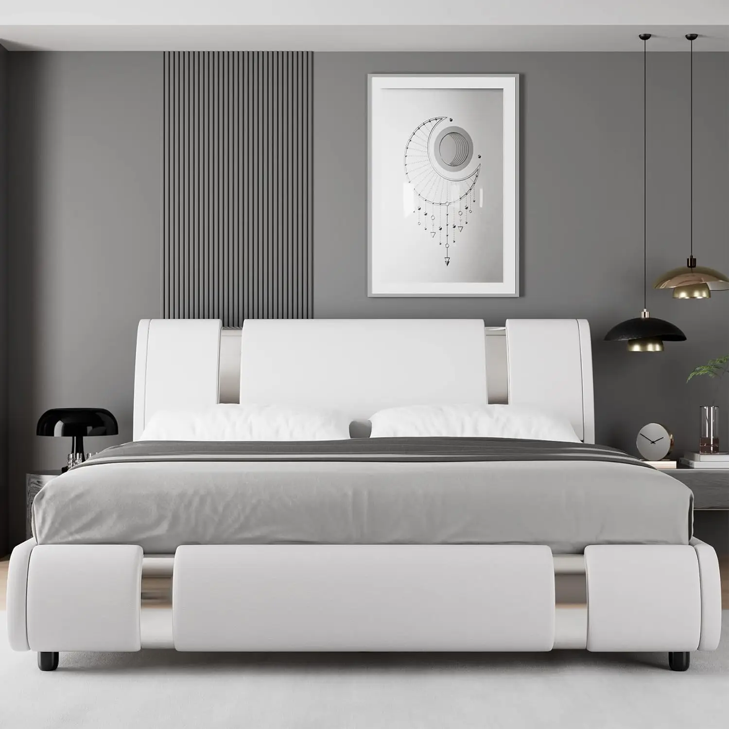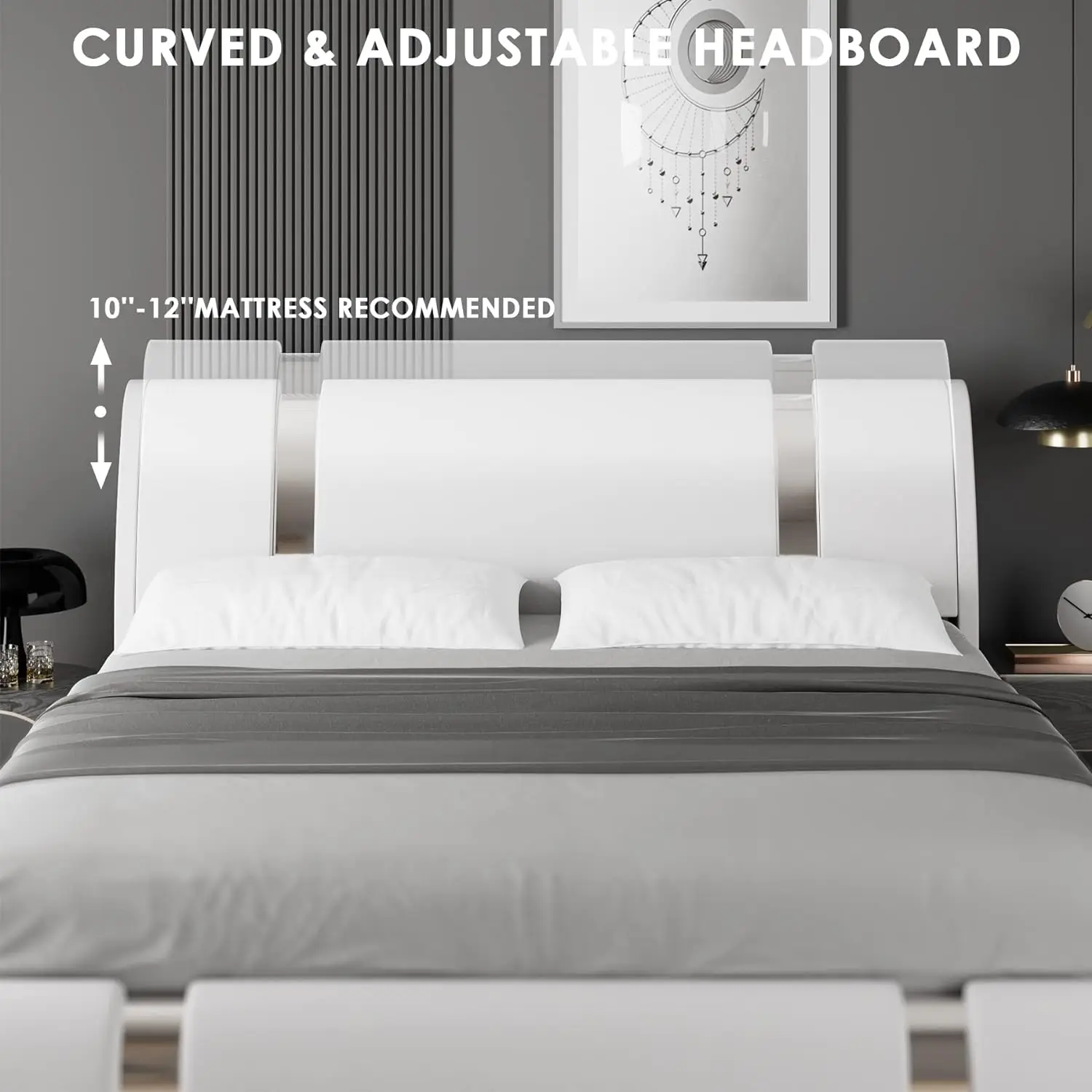 Modern Faux Leather Upholstered Platform Bed Frame with Golden Iron Metal Decor, Adjustable Curved Headboard, Queen Size, White