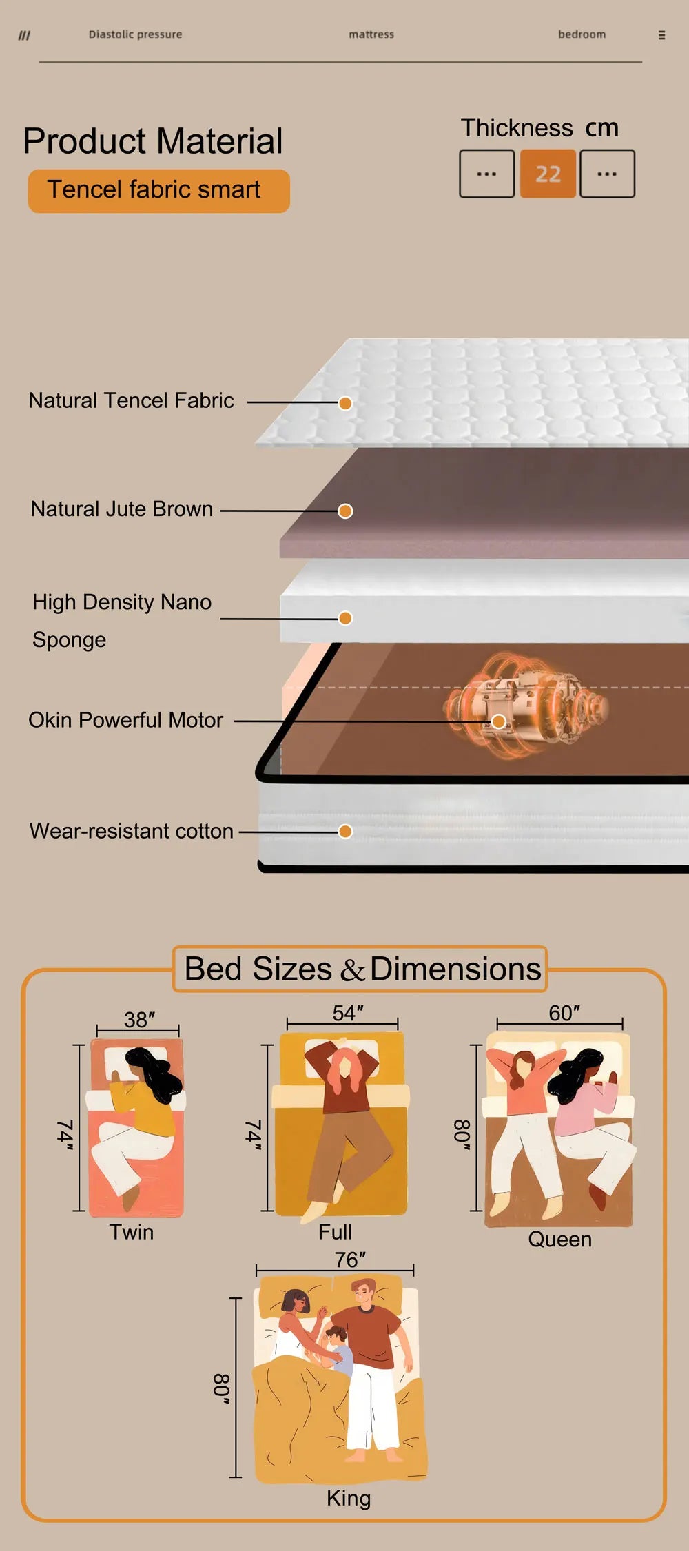 Material: Knitted Fabric+ Foam+Pocket Spring+Latex