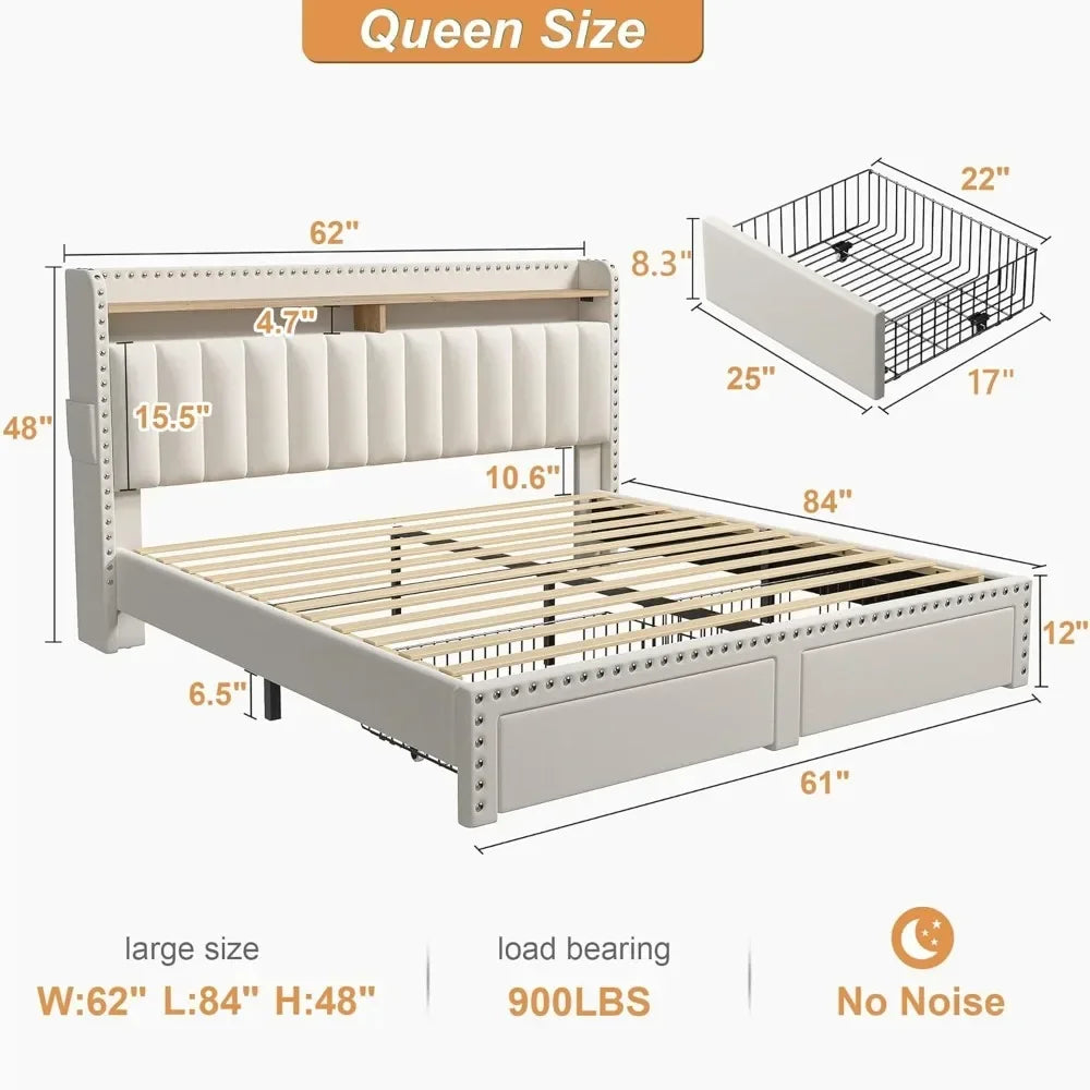 Queen Bed Frame with Headboard and Storage, Upholstered Queen Bed Frame with Storage, Queen Size Bed Frame with 2 Drawers