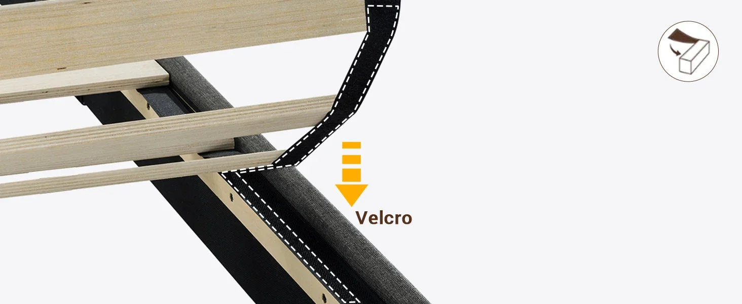 Attach one side of the Velcro to the slat and the other to the bed frame. Easy to setup a quiet bed!