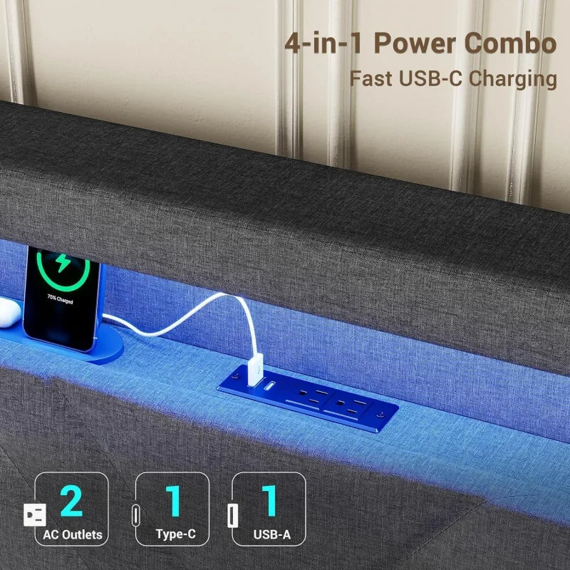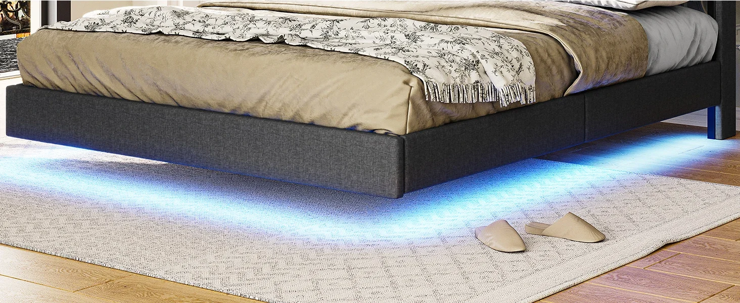 Queen Floating Frame RGB LED Lights ,USB-C/A Power Combo,Linen Upholstered Platform Bed with Storage Headboard
