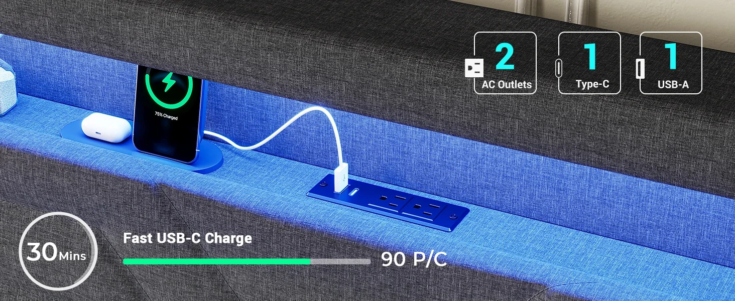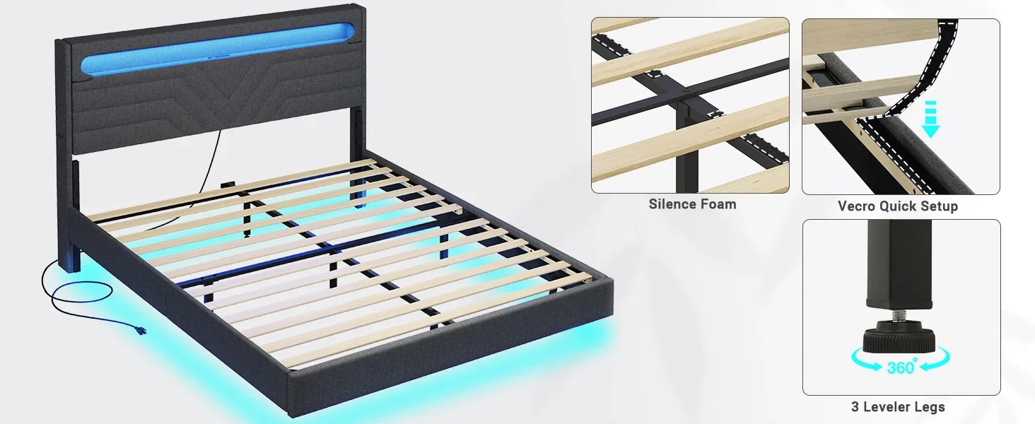 | Features | Floating Structure; RGB light; USB-C Fast Charge; Hidden Storage Headboard |
