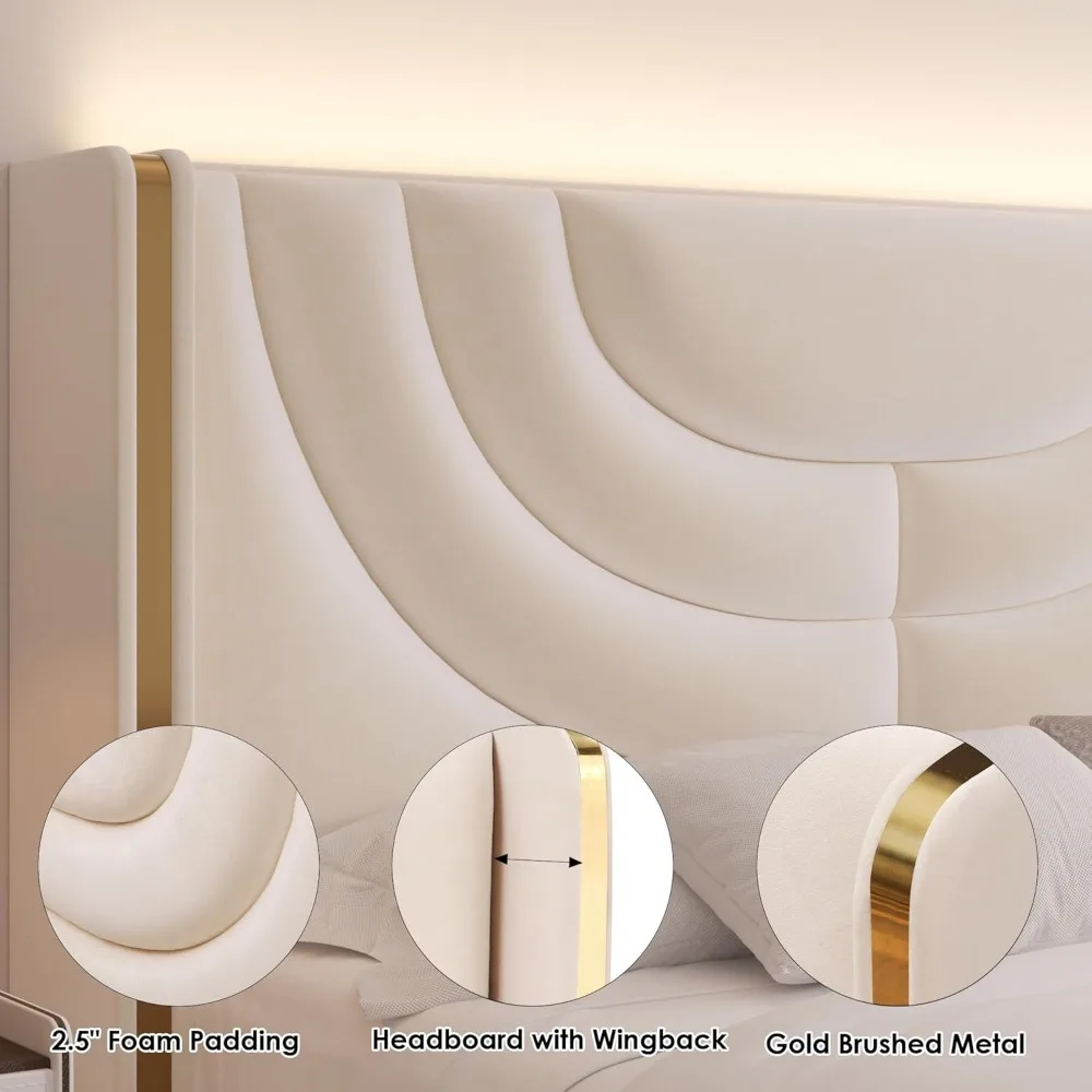 - Lavish and Modern Style: This upholstered platform bed frame is perfect for any modern bedroom, stylish and functional. Unique wingback with stainless steel striped headboard and curved splicing design gives any room a spark of style that's both modern and timeless