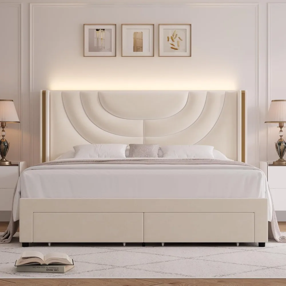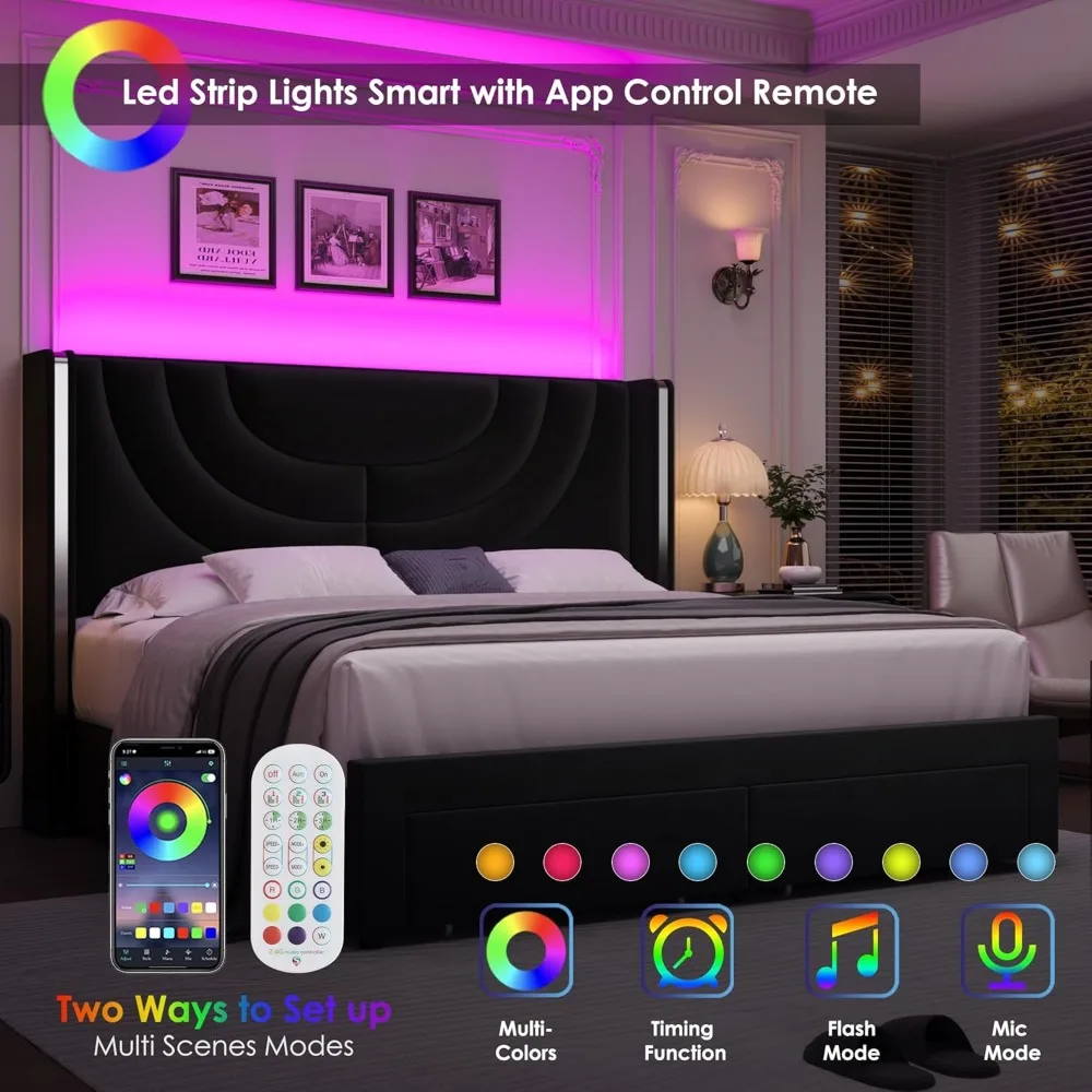Queen Upholstered LED Bed Frame with 2 Storage Drawers, Velvet Platform Bed with Wingback Headboard, Solid Wooden Slats Support