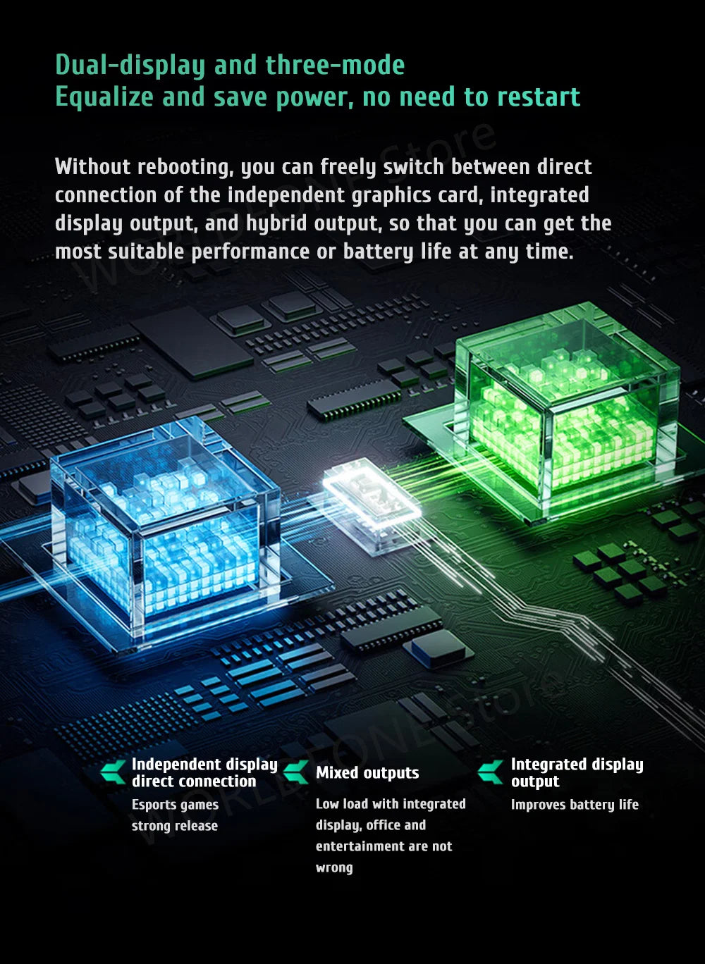 Without rebooting, you can frely switch between direct connection of the independent graphics card, integrated display output, and hybrid output, So that you can get the most suitable performance or battery life at any time.