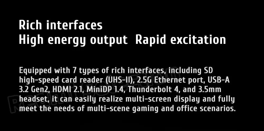 Equipped with 7 types of rich interfaces, including SD High-speed card reader (UHS-I). 2.5G Ethernet port, USB-A 3.2 Gen2 HDMI 2.1, MiniDP 1.4, Thunderbolt 4, and 3.5mm headset, it can easily realize multi-screen display and fully meet the needs of multi-scene Gaming and office scenarios.