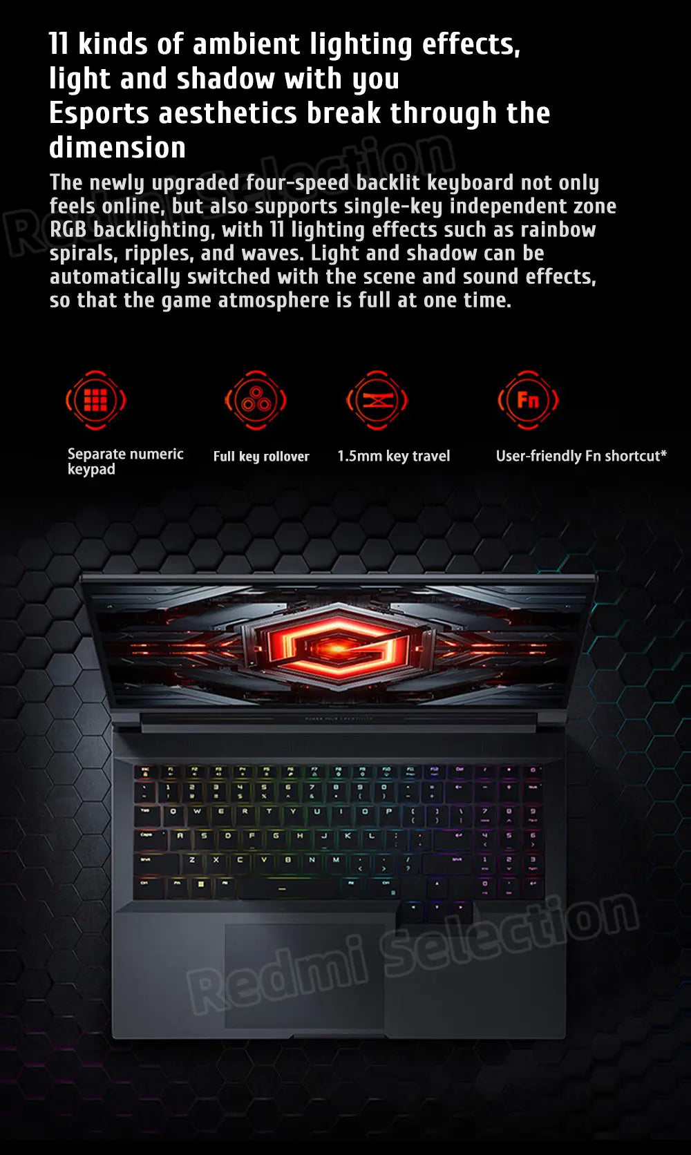 Full-size four-level adjustable RGB backlit keyboard, 1.5mm key travel, full key rollover