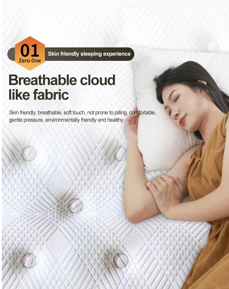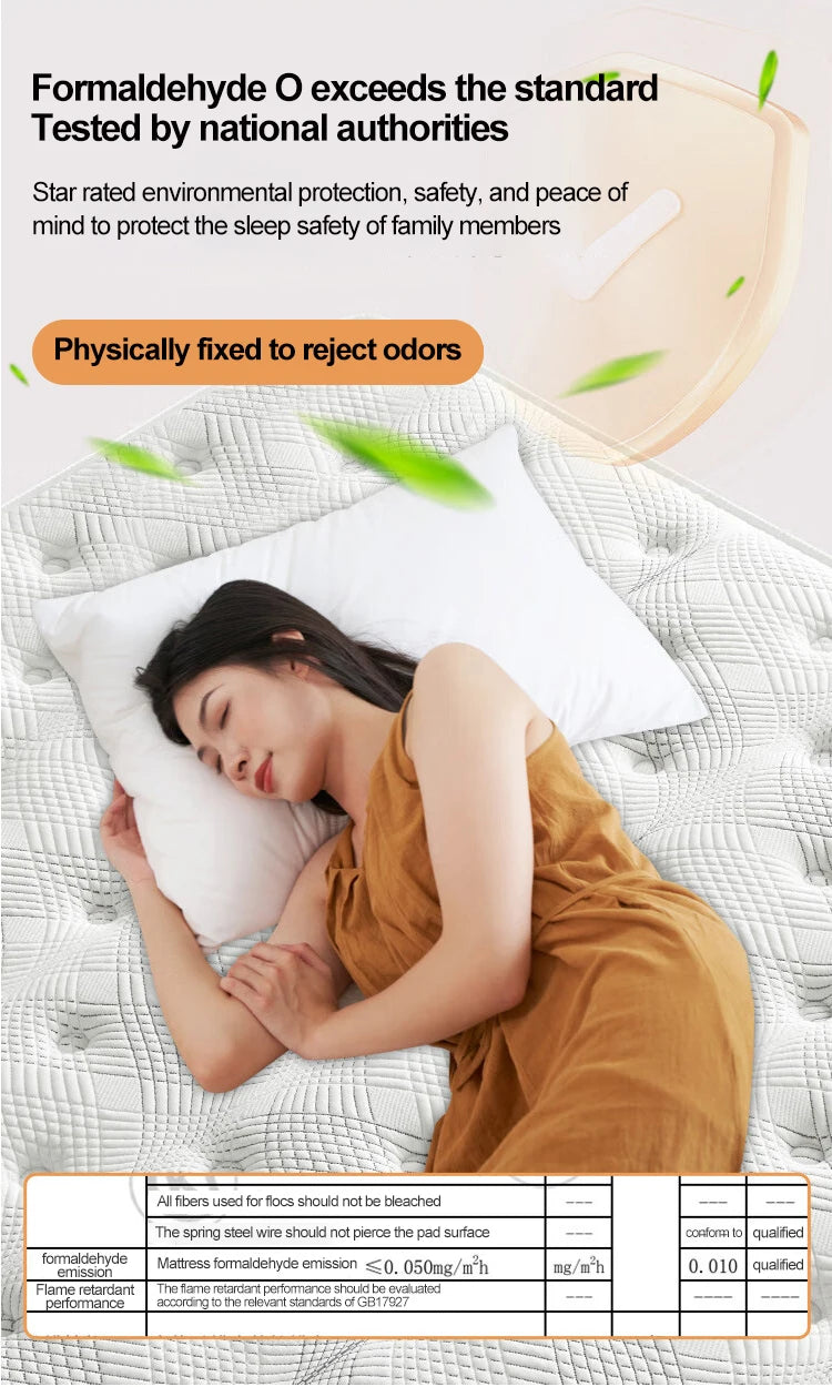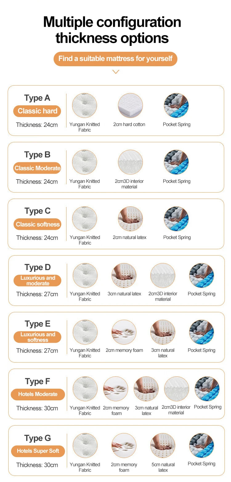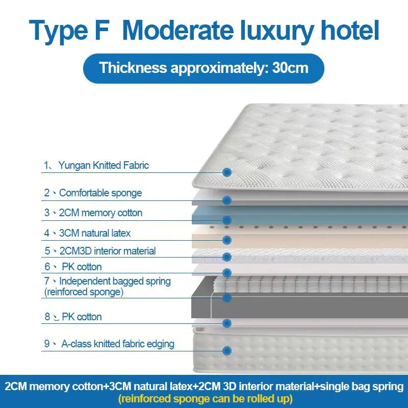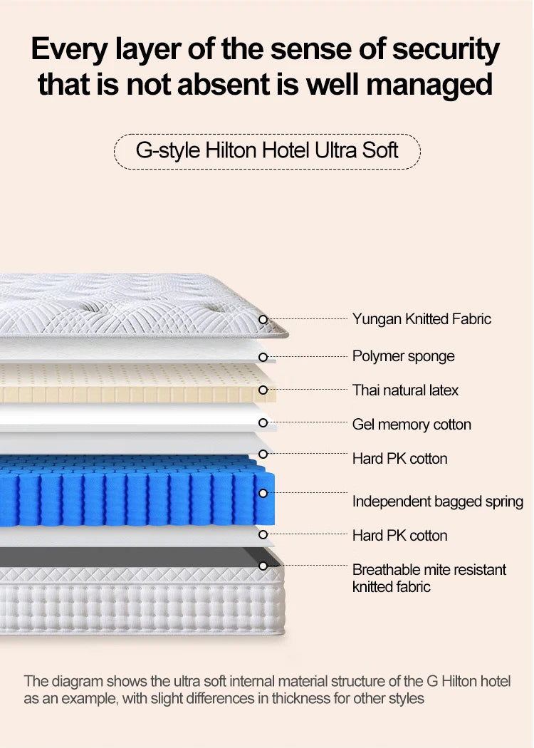 Knitted fabric (300g, including tucks 2CM) + 2CM memory foam + 3CM latex + 2CM 3D inner material + 20CM independent pocket spring