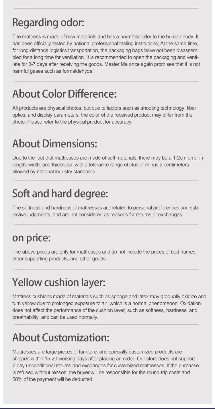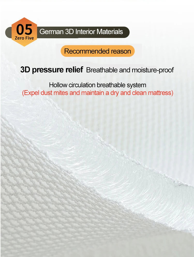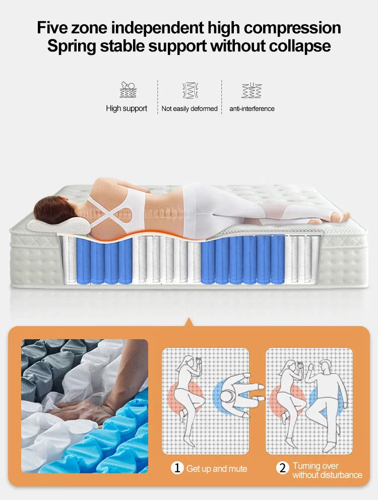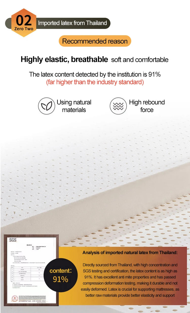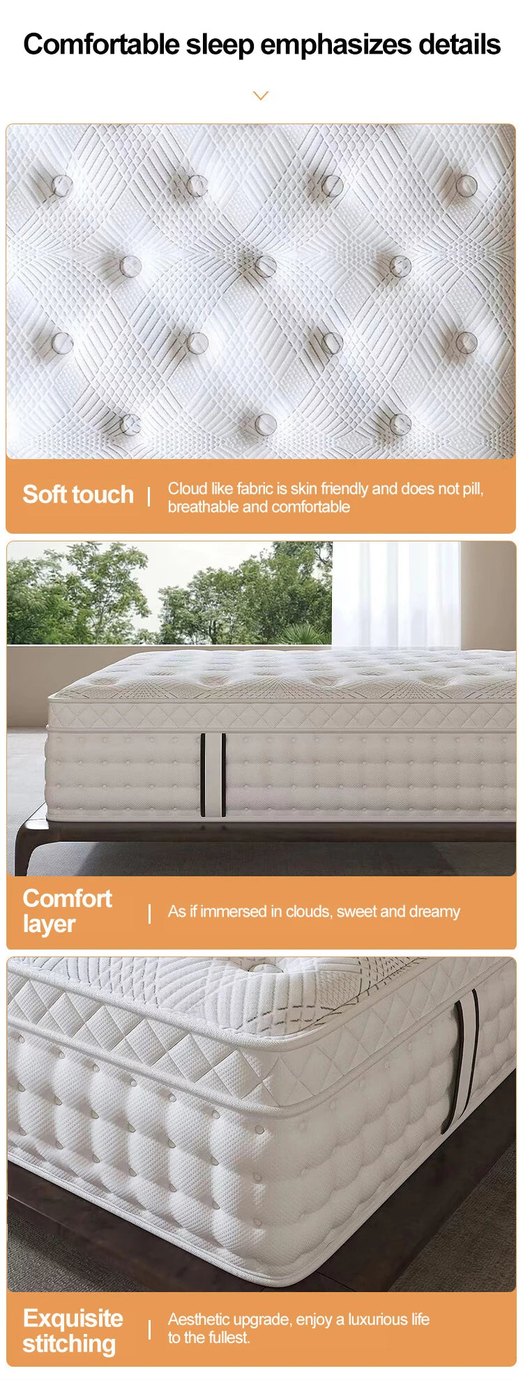 Knitted fabric (300g, including tucks 2CM) + 2CM memory foam + 3CM latex + 2CM 3D inner material + 20CM independent pocket spring
