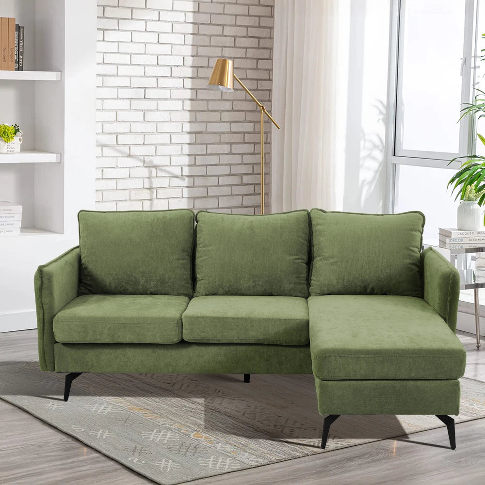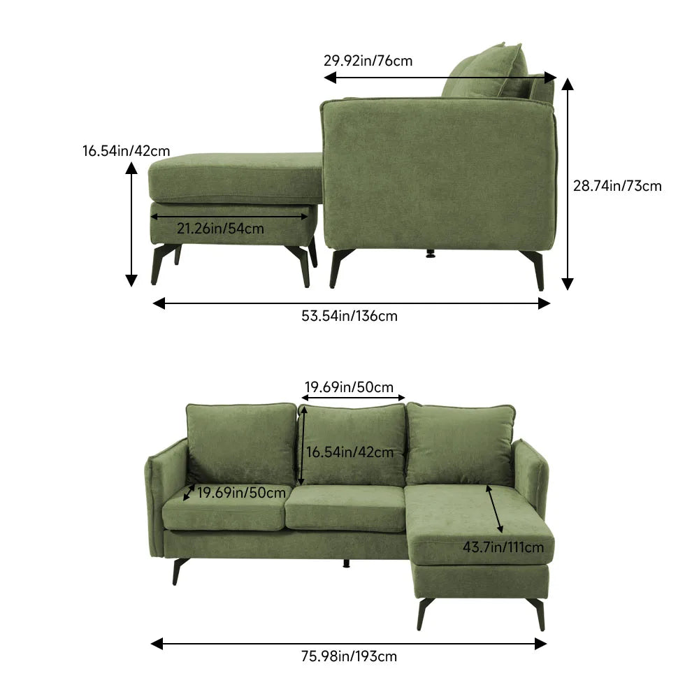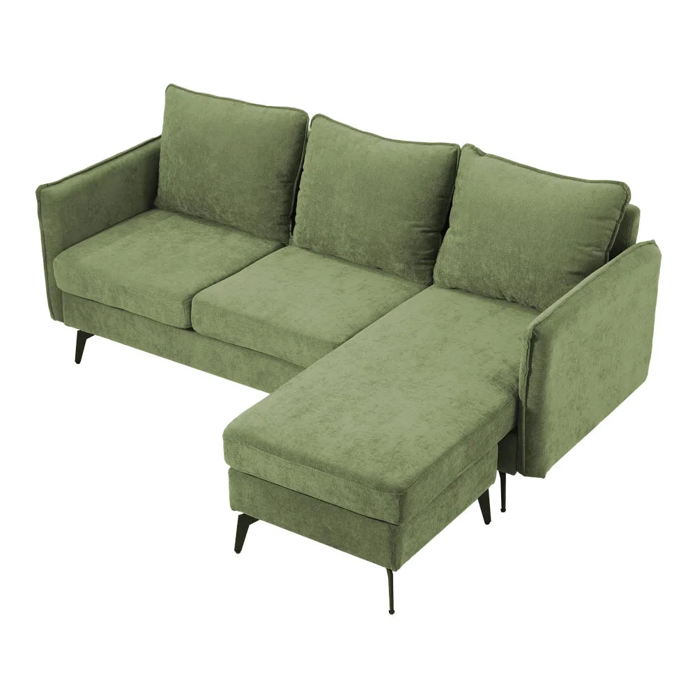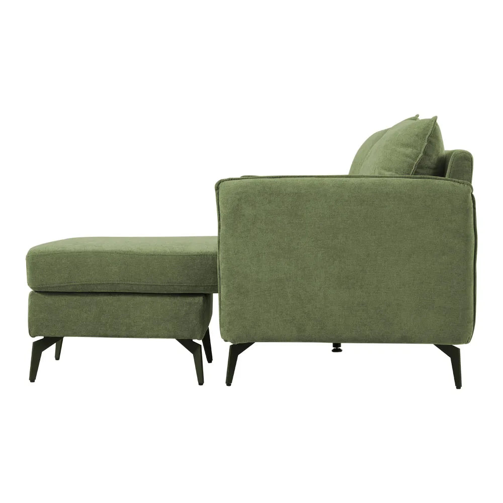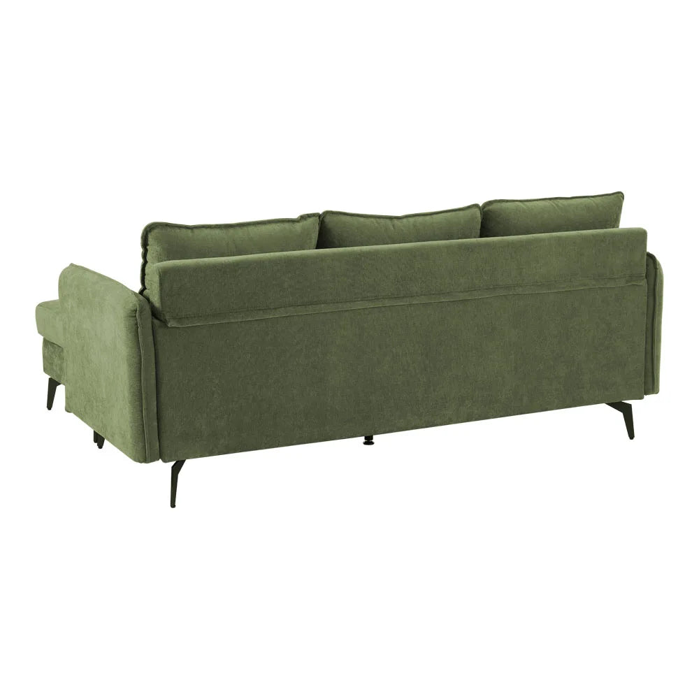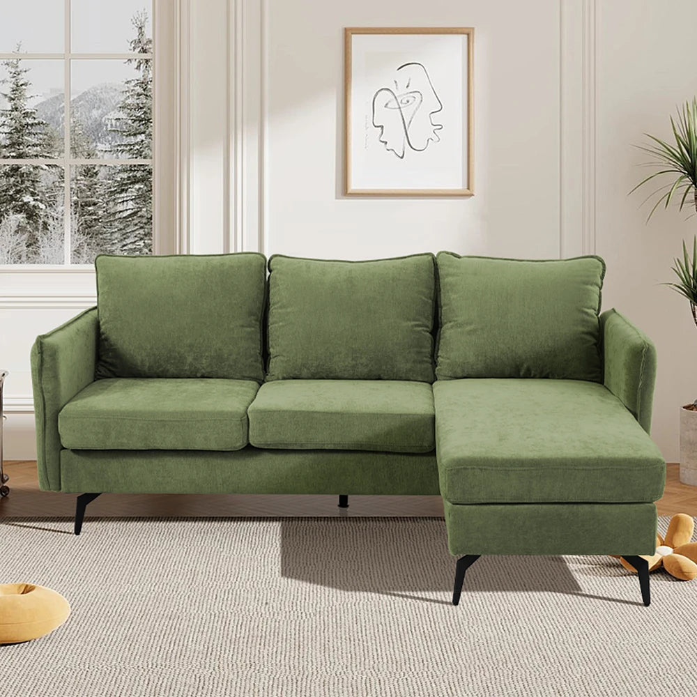 Elevated on black and coated metal legs, this sectional sofa is wrapped in luxurious green polyester fabric, offering a soft yet refined touch. The L-shaped extended seating area not only provides additional space for lounging but can also serve as a versatile ottoman or daybed. Moreover, its interchangeable direction feature allows you to freely adjust its placement according to different room layouts, particularly suited for open-plan living rooms or households requiring flexible arrangements. Its bold design effortlessly combines modern aesthetics with comfort, ensuring it becomes the focal point of any room.