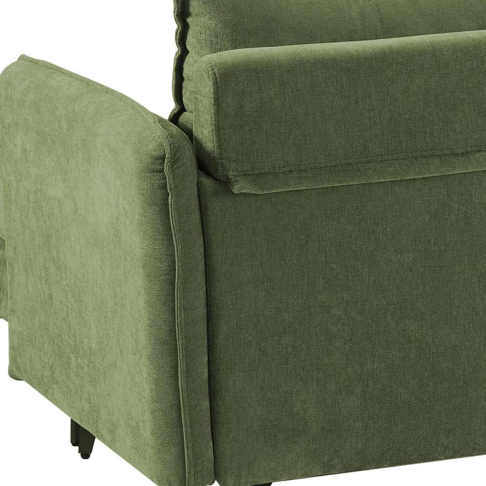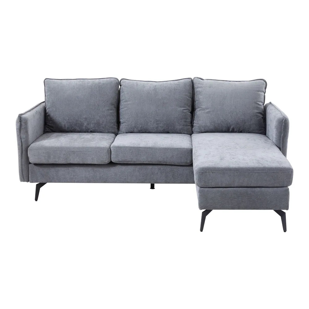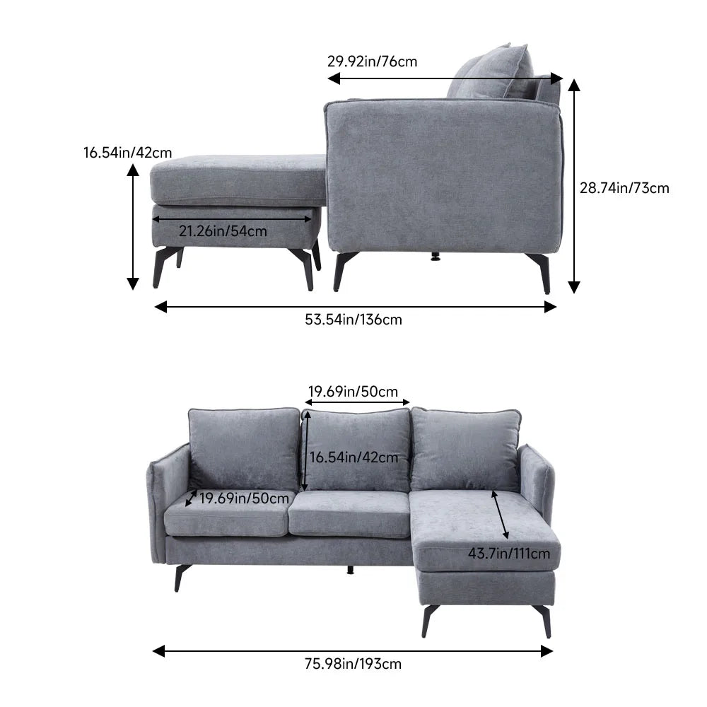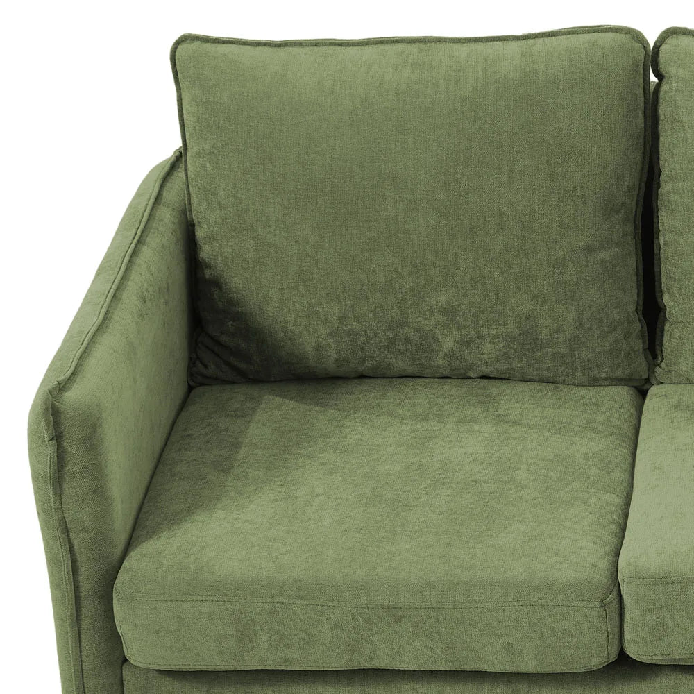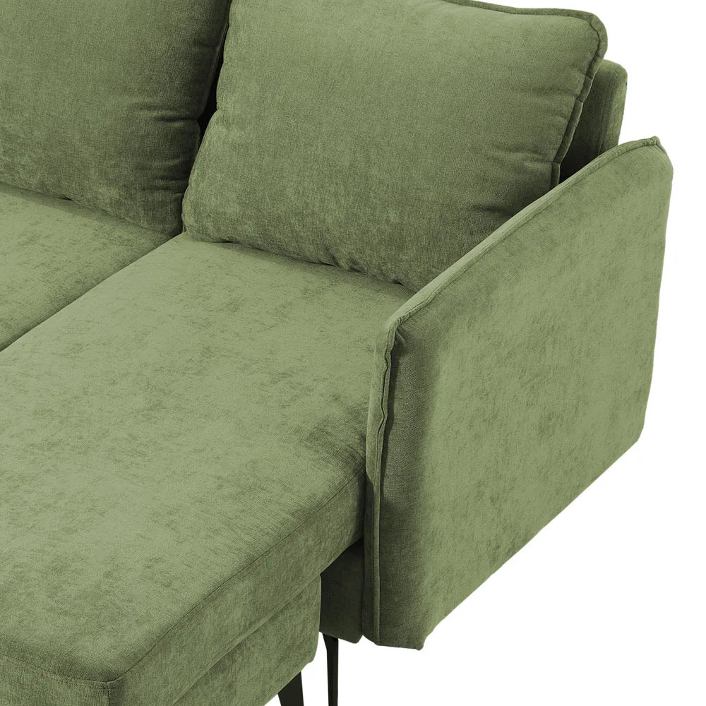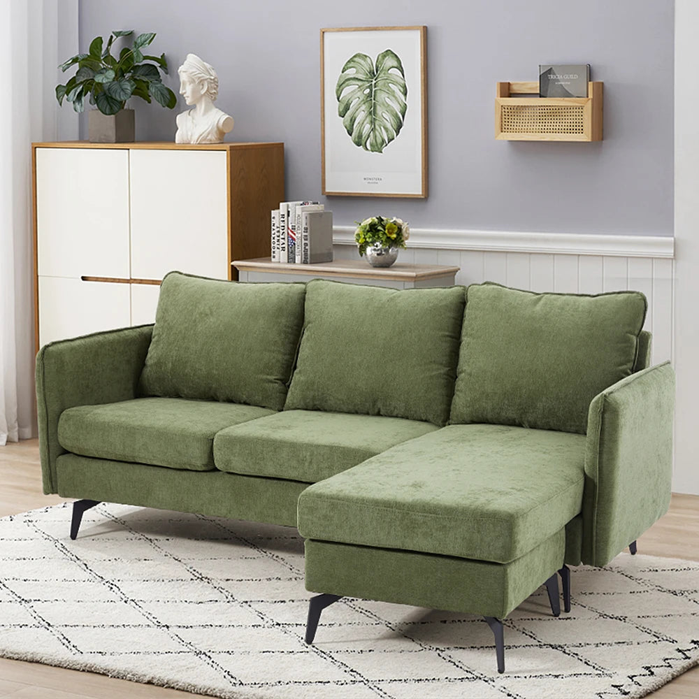 Elevated on black and coated metal legs, this sectional sofa is wrapped in luxurious green polyester fabric, offering a soft yet refined touch. The L-shaped extended seating area not only provides additional space for lounging but can also serve as a versatile ottoman or daybed. Moreover, its interchangeable direction feature allows you to freely adjust its placement according to different room layouts, particularly suited for open-plan living rooms or households requiring flexible arrangements. Its bold design effortlessly combines modern aesthetics with comfort, ensuring it becomes the focal point of any room.