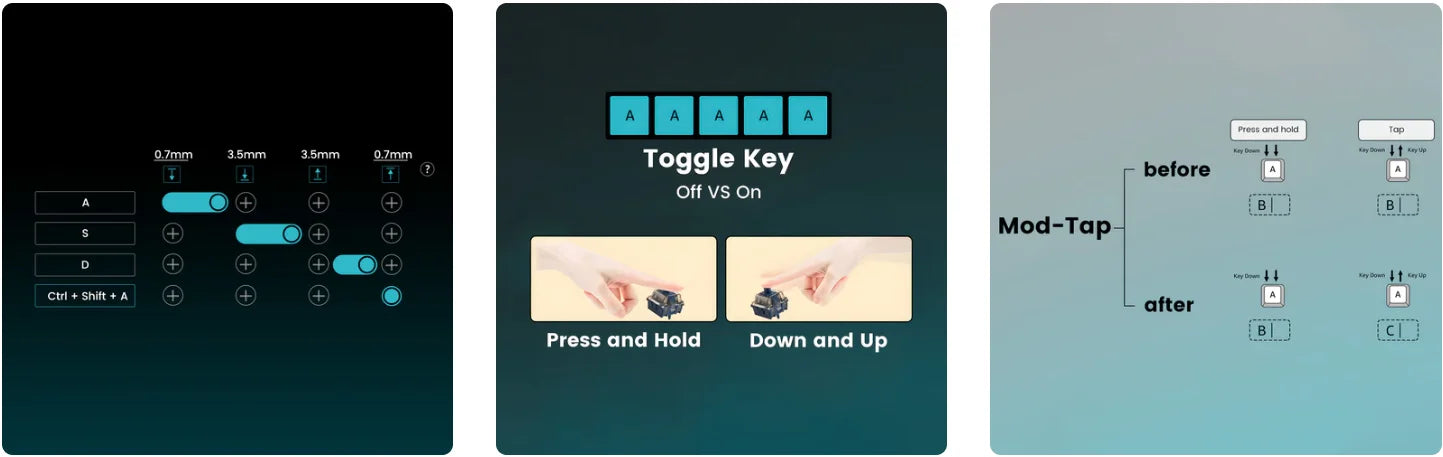 Depending on your keypress force: a light press triggers action 1, a deeper press activates action 2, and releasing the key also supports a two-stage key setting.