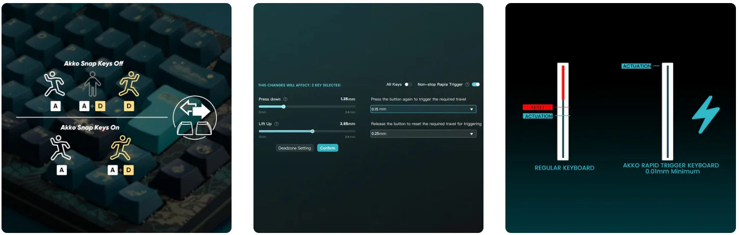 These magnetic switches allow users to adjust every key’s actuation point from 0.1mm to 3.4mm, which offers different kinds of pressing for gaming or typing.