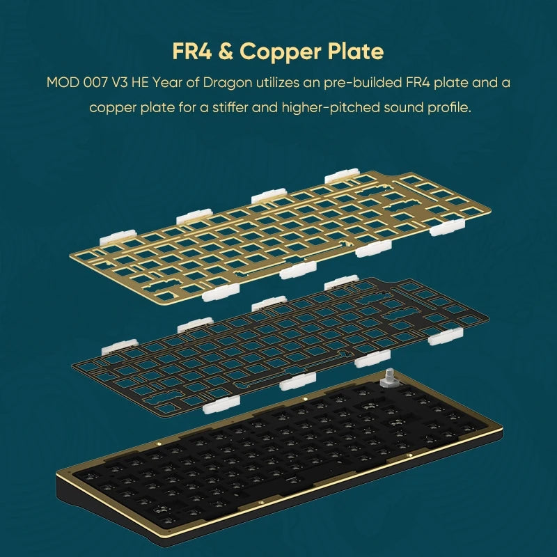 MOD 007 HE Year of Dragon utilizes an pre-builded Aluminum plate and a FR4 plate (V2 Astrolink Switch) for a stiffer and higher-pitched sound profile.