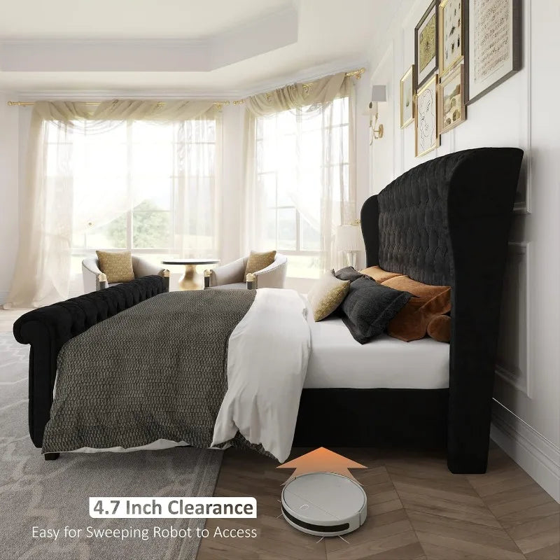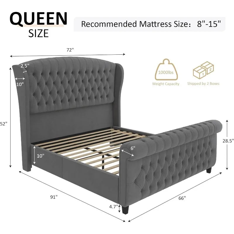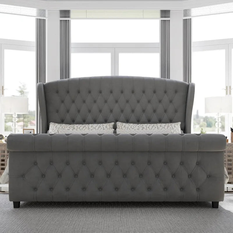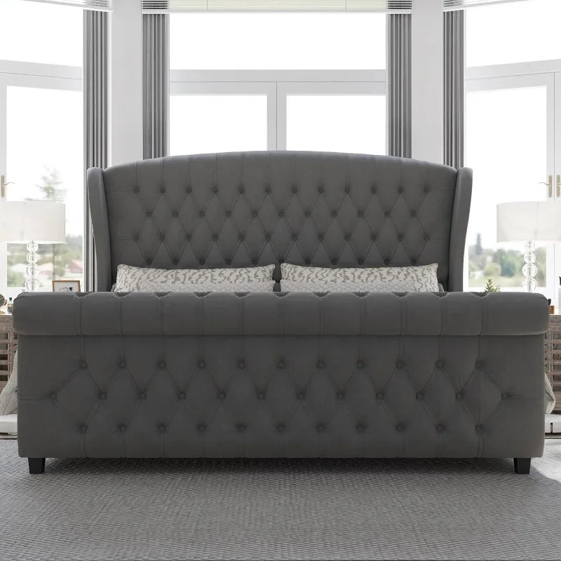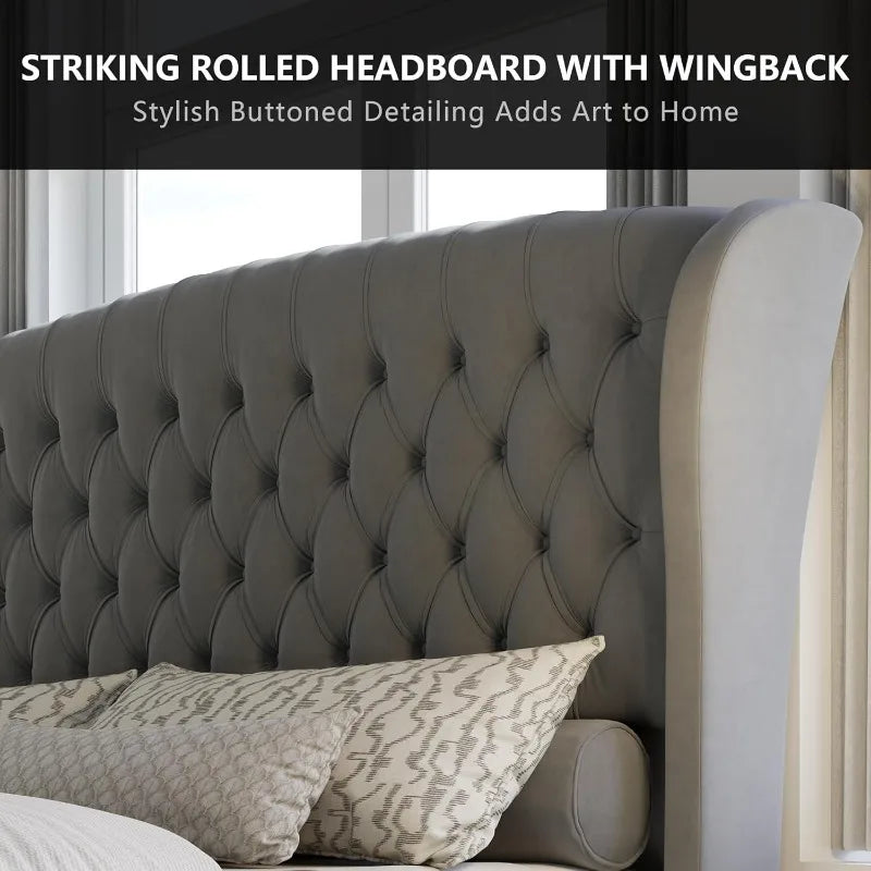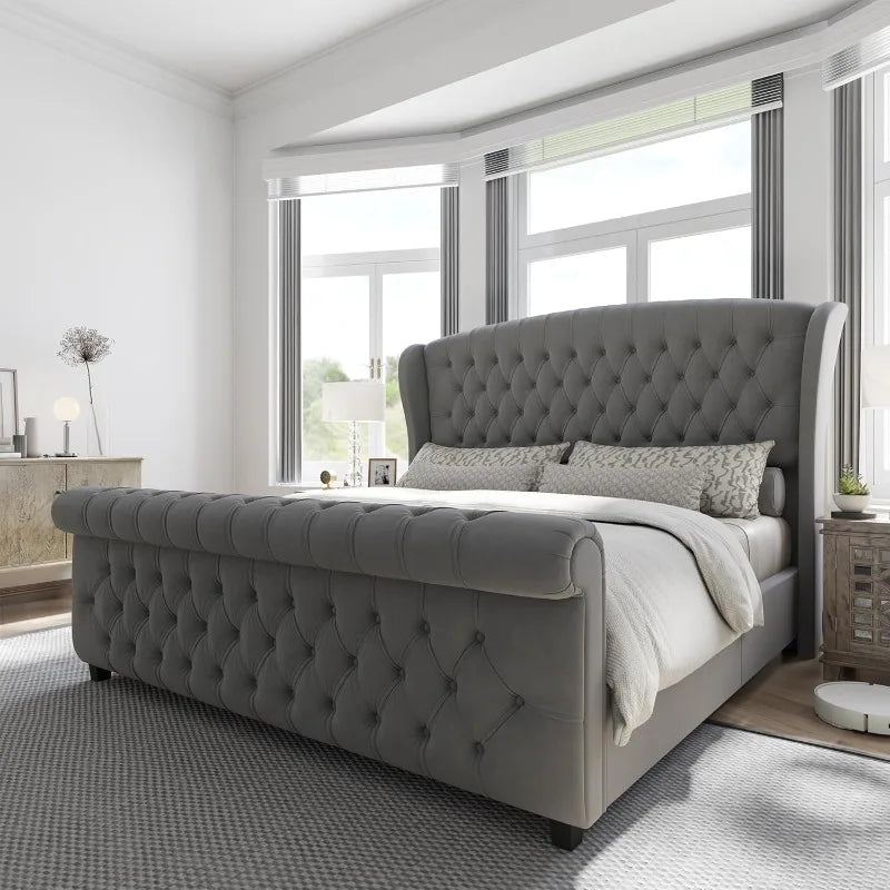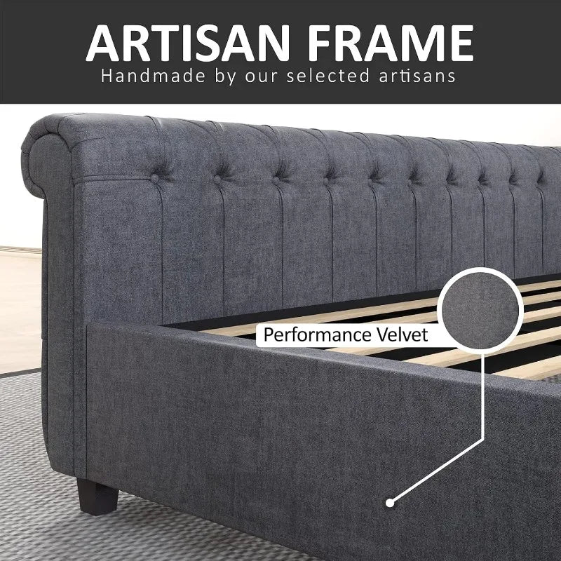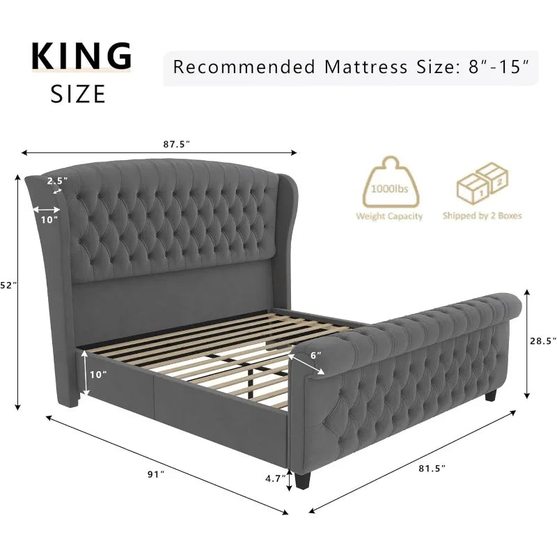 - CONTEMPORARY & LUXURY - Combines stylish buttoned detailing with striking rolled headboard & footboard design, this king size sleigh bed is easily mixed with any bedroom style or color scheme.