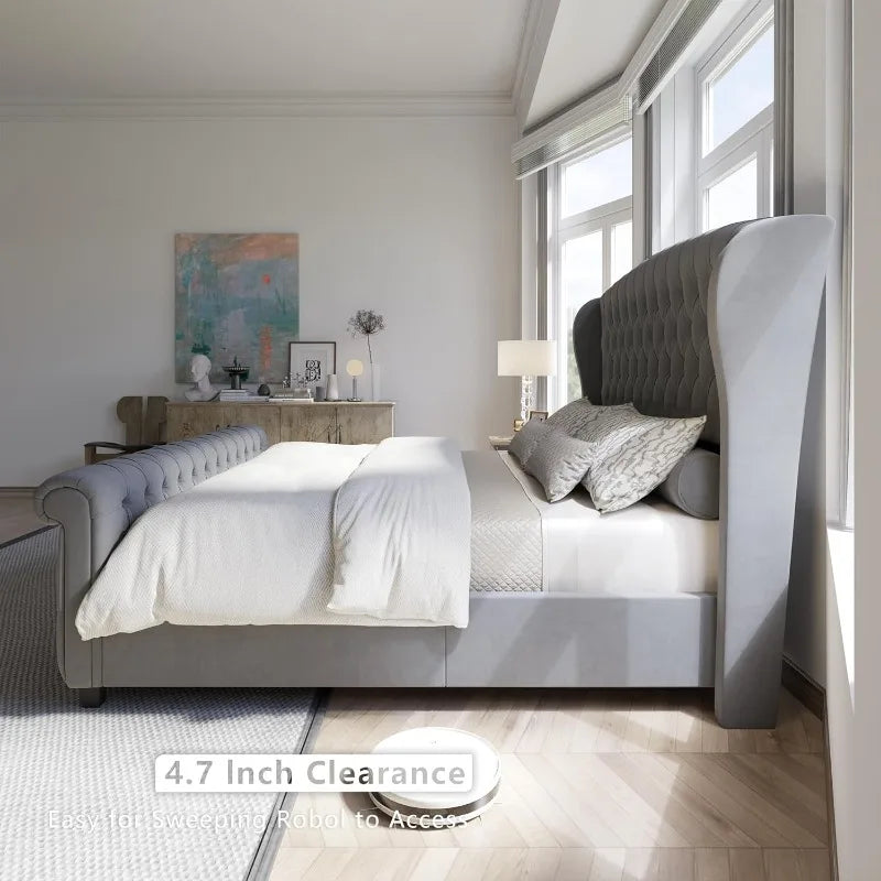 AMERLIFE King Size Platform Bed Frame, Chenille Upholstered Sleigh Bed with Scroll Wingback Headboard & Footboard/Button Tufted