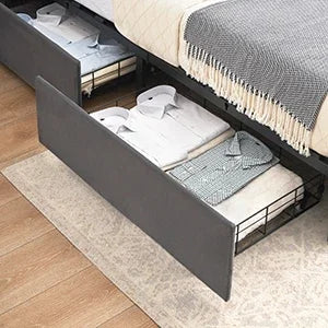 Upgrade your bedroom with our stylish and functional King Bed Frame. It features 4 under-bed drawers for ample storage, with rolling wheels for easy access. The sturdy steel frame and strong wood slat support ensure durability and a maximum load capacity of 1000 lbs. Enjoy a clutter-free space and enhanced comfort with this modern bed frame.