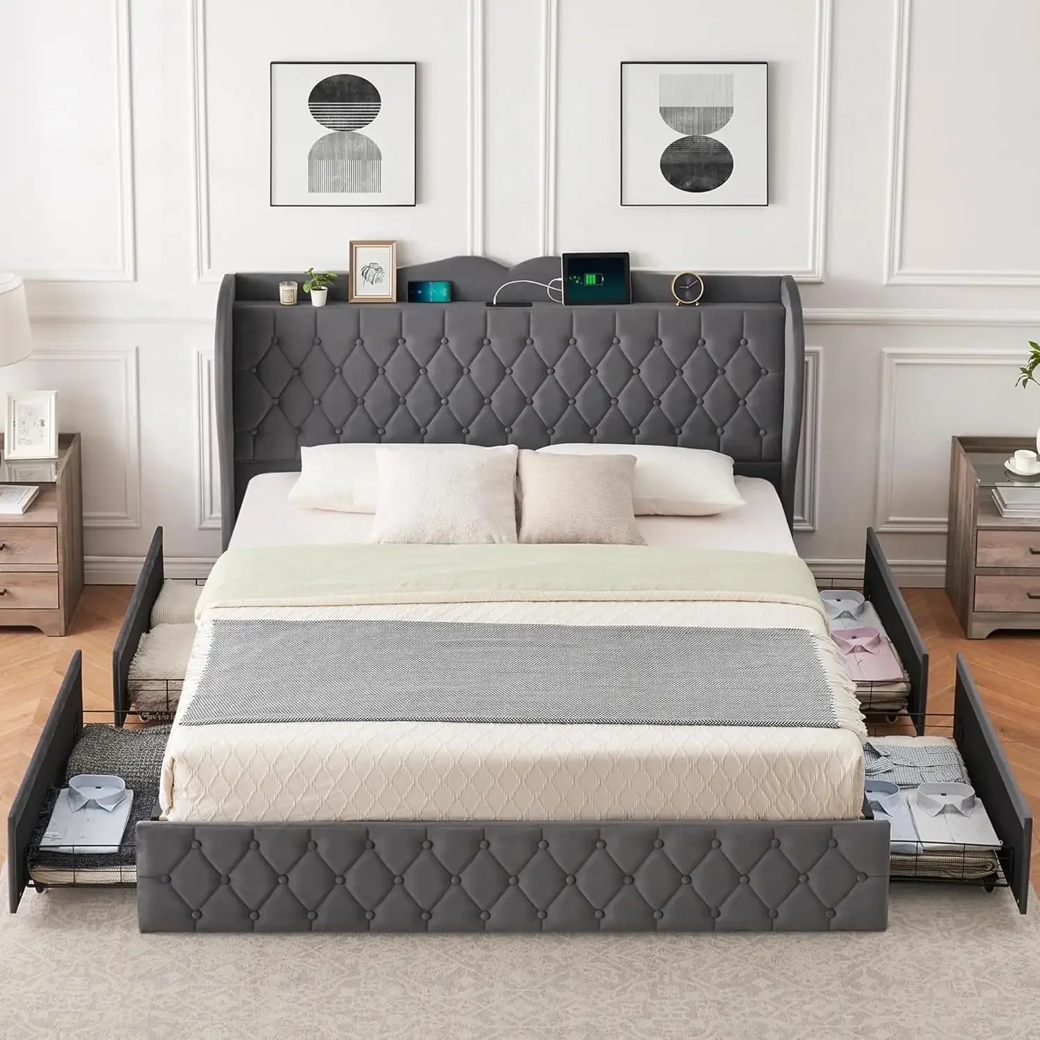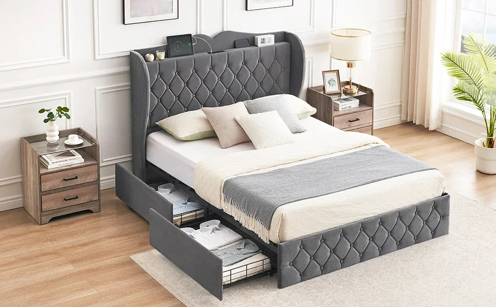 Bed Frame, 4 Storage Drawers and Charging Station Velvet Upholstered Bed with Tall Headboard and Storage Shelf, Bedroom Furnture