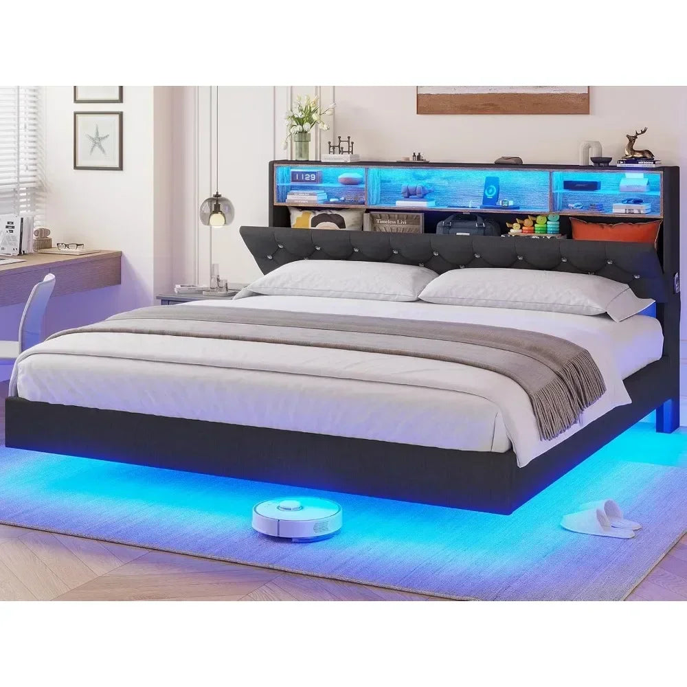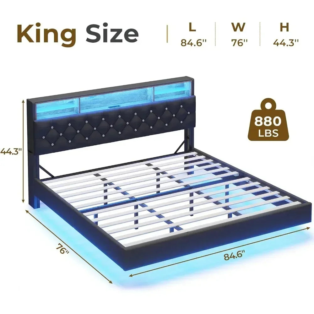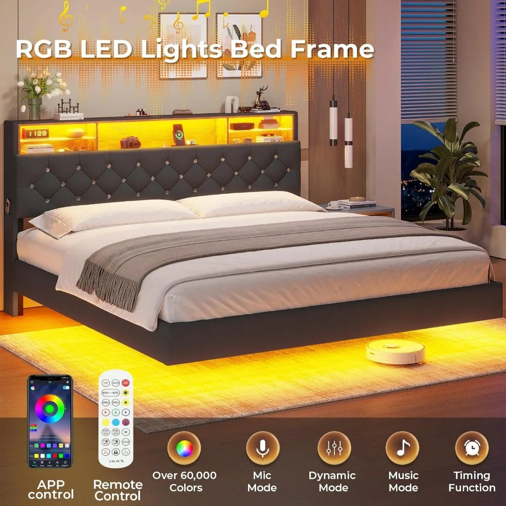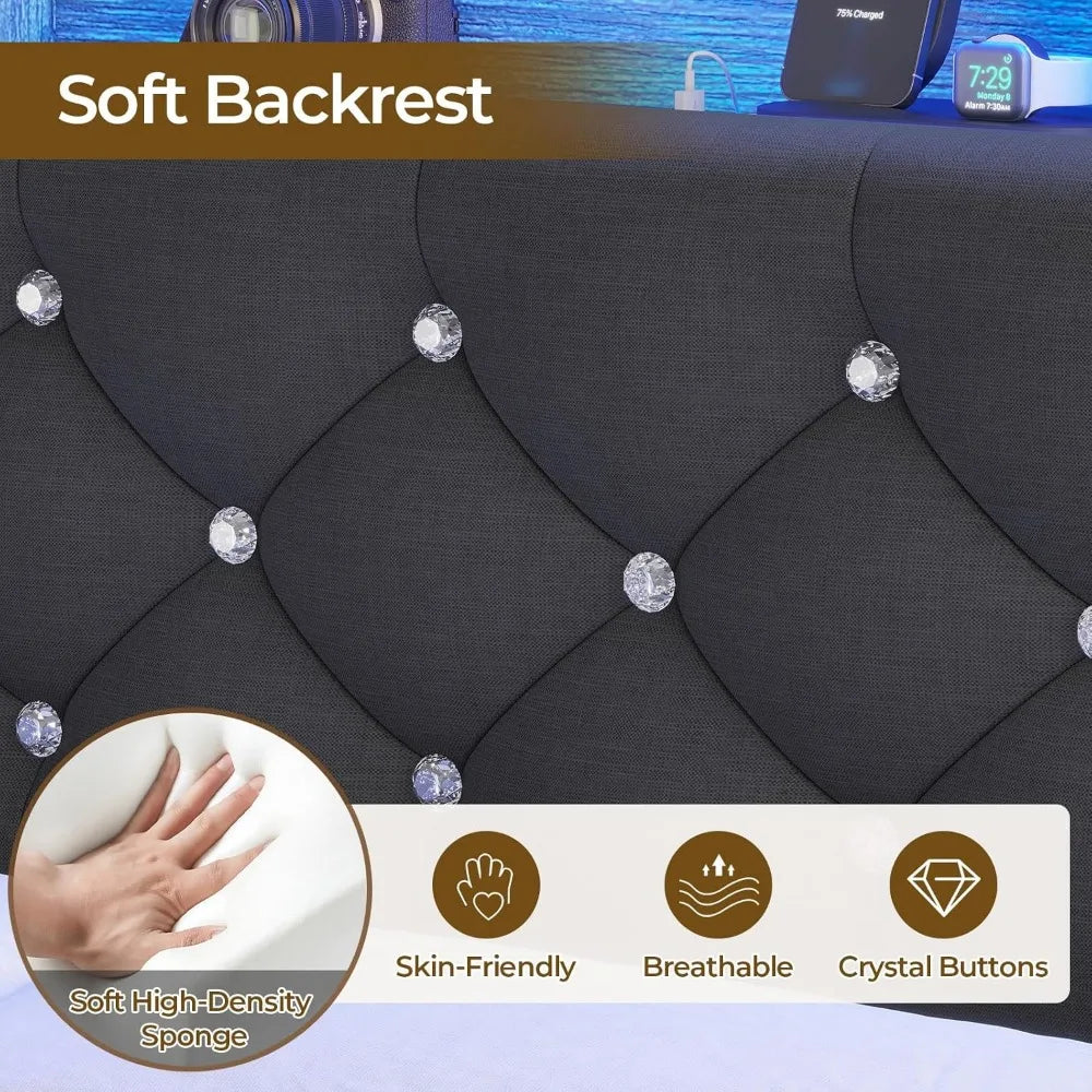 Bed Frame with Charging Station & Hidden Storage Headboard, King with LED Lights, Crystal Button Tufted Upholstered Bed Frame