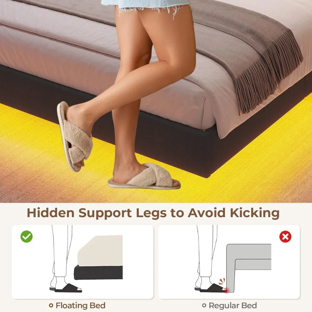 - 【Stylish Floating Bed Frame Design】The supporting legs of the floating bed frame are cleverly hidden under the frame to ensure stability, and the floating design with LED lights creates a visual effect as if it is floating in the air. The unique floating design can also prevent kicking. This stunning floating bed frame will bring an unprecedented sense of modernity and space to your bedroom.
