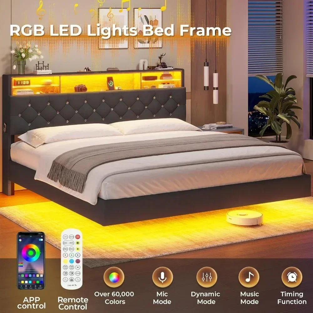 - 【Multi-Function RGB LED Lights】The bed frame has RGB light strips attached to the headboard and under the bed, and the LED lights can be controlled by a mobile app or a remote control. You can freely set the brightness and color (more than 60,000 colors to choose from), and there are control modes such as style mode, music mode, microphone mode, and timing function waiting for you to explore. Let you design a unique light show according to your own preferences.