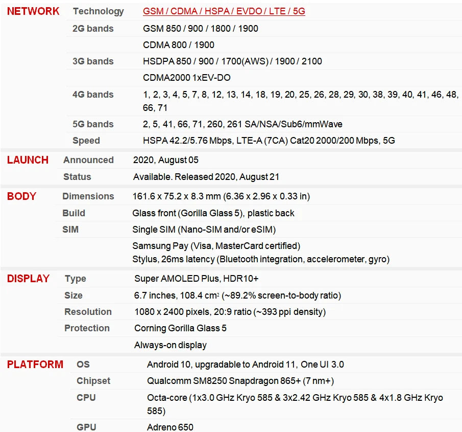 Samsung Model: Galaxy Note20 5G