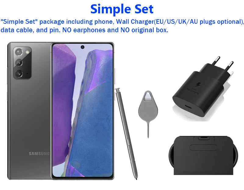 "Simple set" means you will get the Samsung Galaxy Note 20 5G N981U cellphone with wall charger and data cable;