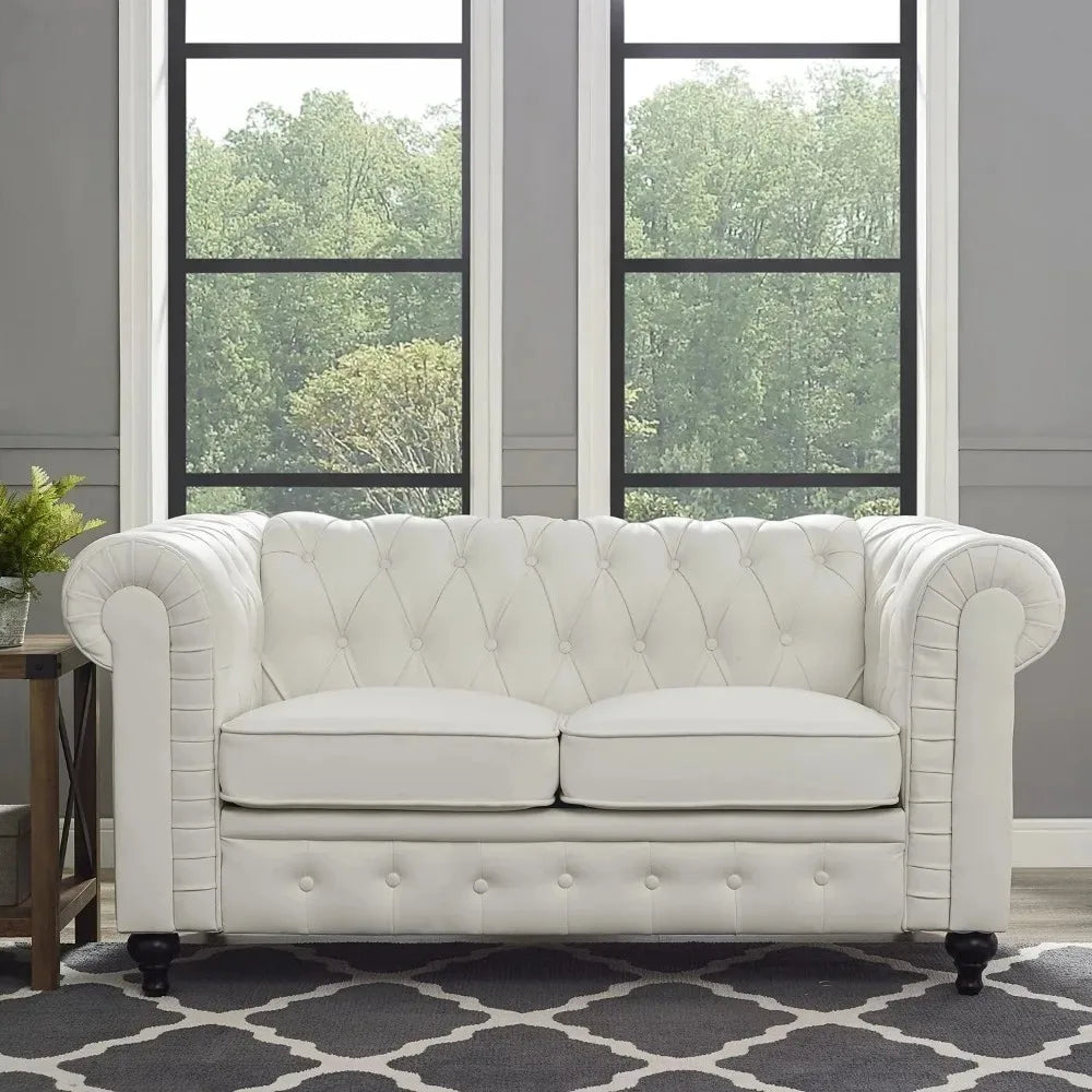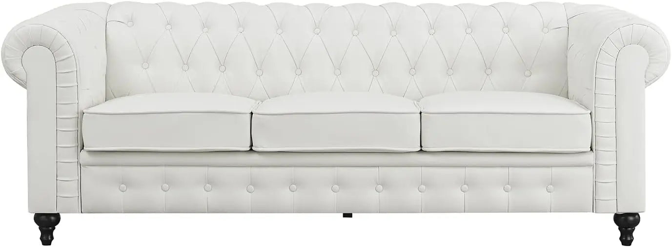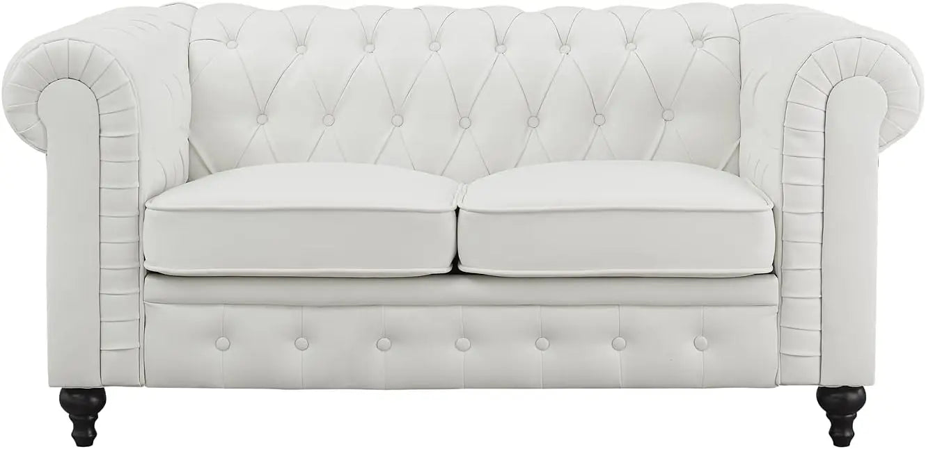 - MODERN CHESTERFIELD LOUNGE: Create a lounge-worthy living room with this modernized Chesterfield sofa. Rich Grey or White leather upholstery, along with a high back and arms, the Faux Leather Sofa just perfect to sit back and read a good book or take a quick power nap.