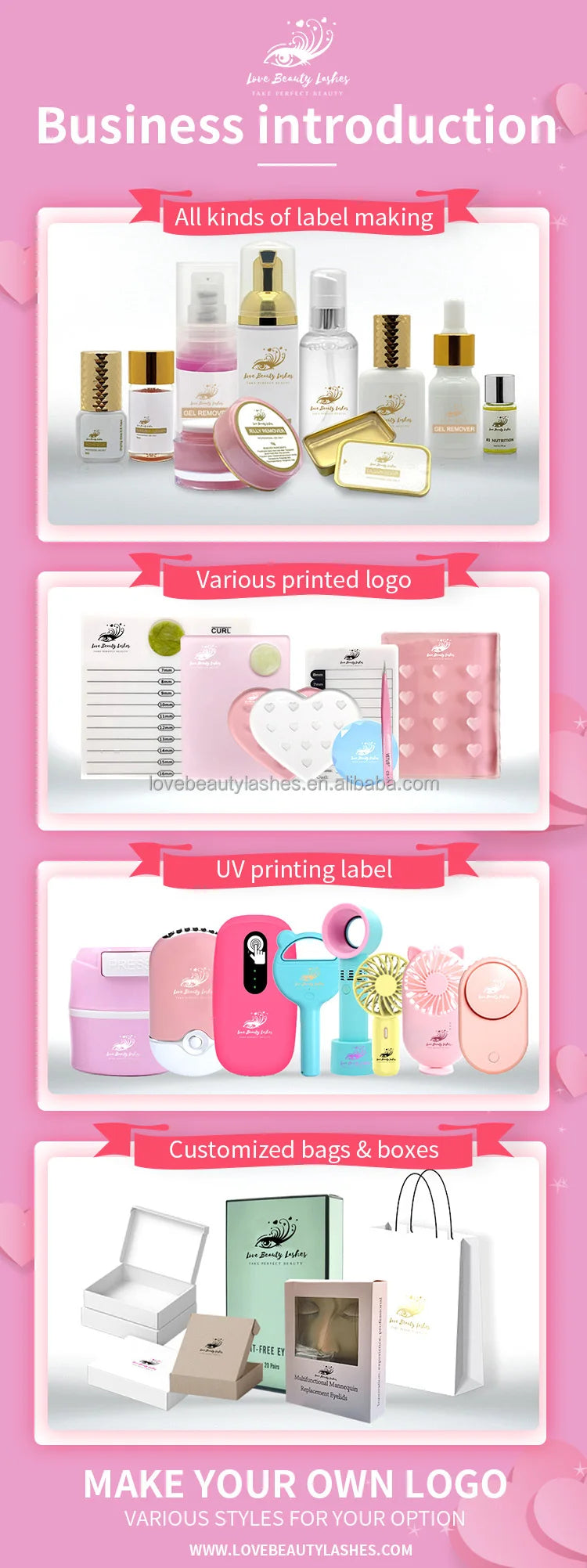 Love Beauty Lashes has been specializing in eyelash extensions and relative tools since 2015. For the eyelash extensions we can supply more than 100 styles of eyelashes extensions and flare clusters in various sizes. They are made of premium PBT Synthetic Fiber, all the raw materials are imported from Korea. For the relative tools, we can supply more than 500 styles to meet your different request on the lash process. All of our productions can be made with your own logo to support you getting the one-stop-shop for all your lashes’needs.