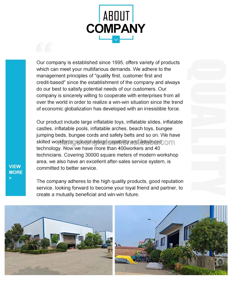 our factory is a professional inflatable amusement equipment manufacturer. We have established since 1995. Our products include water products, large inflatable toys, Inflatable slides, Inflatable castles, Inflatable pools, Inflatable arches, beach toys,bungee jumping beds, bungee cords and safety belts. We have skilled workforce, special design capability and advanced technology. Now we have more than 400 workers and 40 technicians. Covering 30,000 square meters of modern workshop area,we also have an excellent after-sales service system.