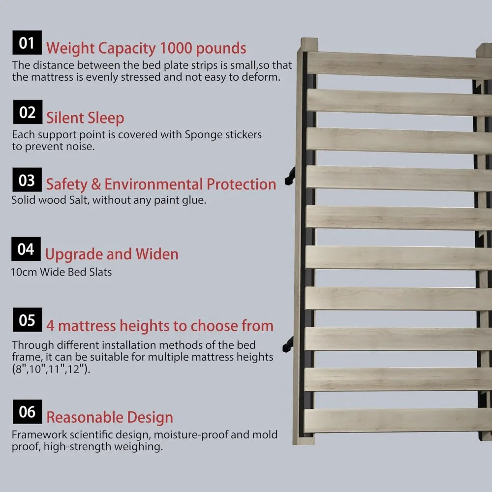 - 【Solid & Sturdy】: The frame and slats are made of solid pine wood, which is hard, firm, corrosion resistant, not easy to deform and crack, and has a long service life. The bed slat structure consists of iron frame and solid wood, 24 widened slats, with a width of about 10cm, providing dense and powerful support for the weight of up to 1000 pounds. The metal feet are scientifically designed to withstand pressure and provide sturdy and stable support without deformation.