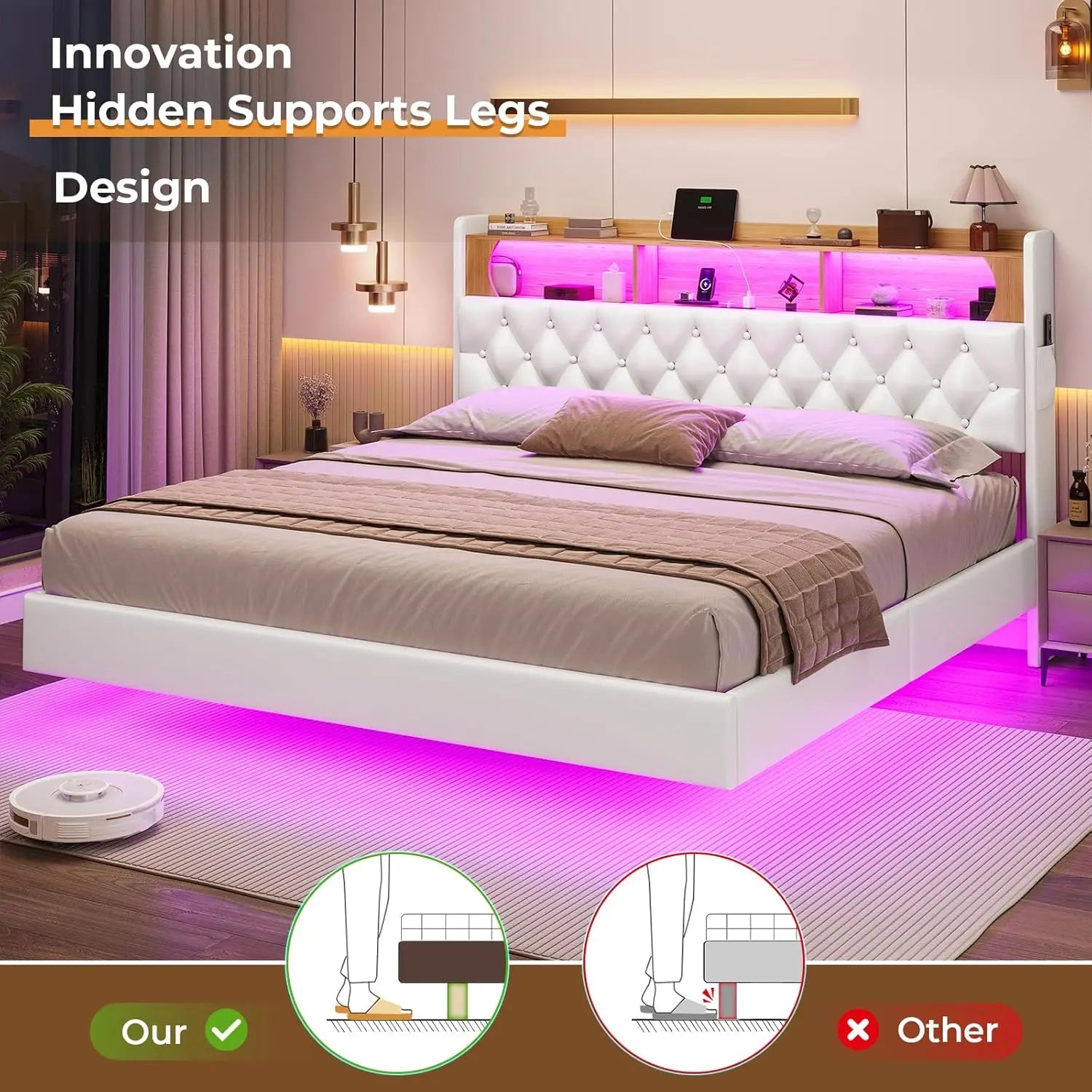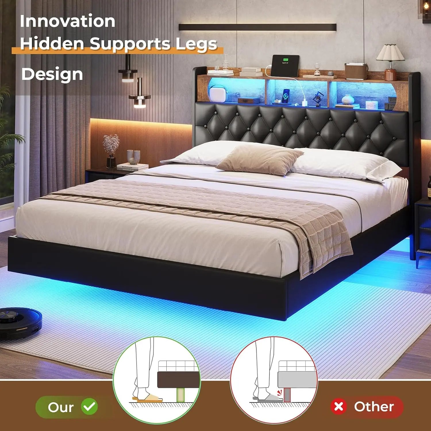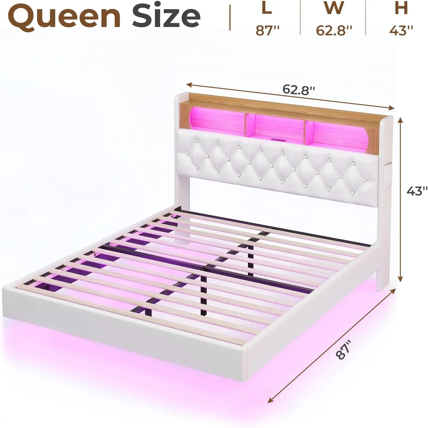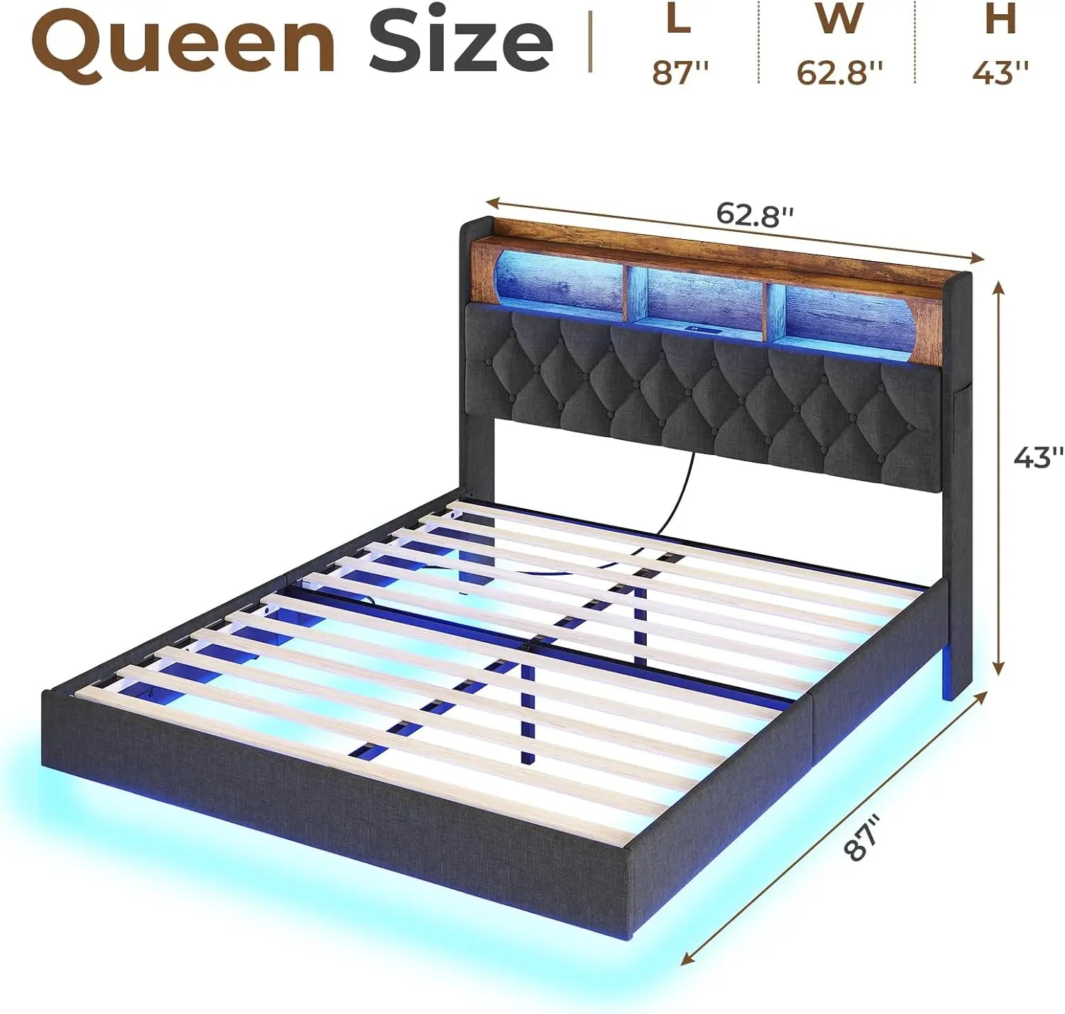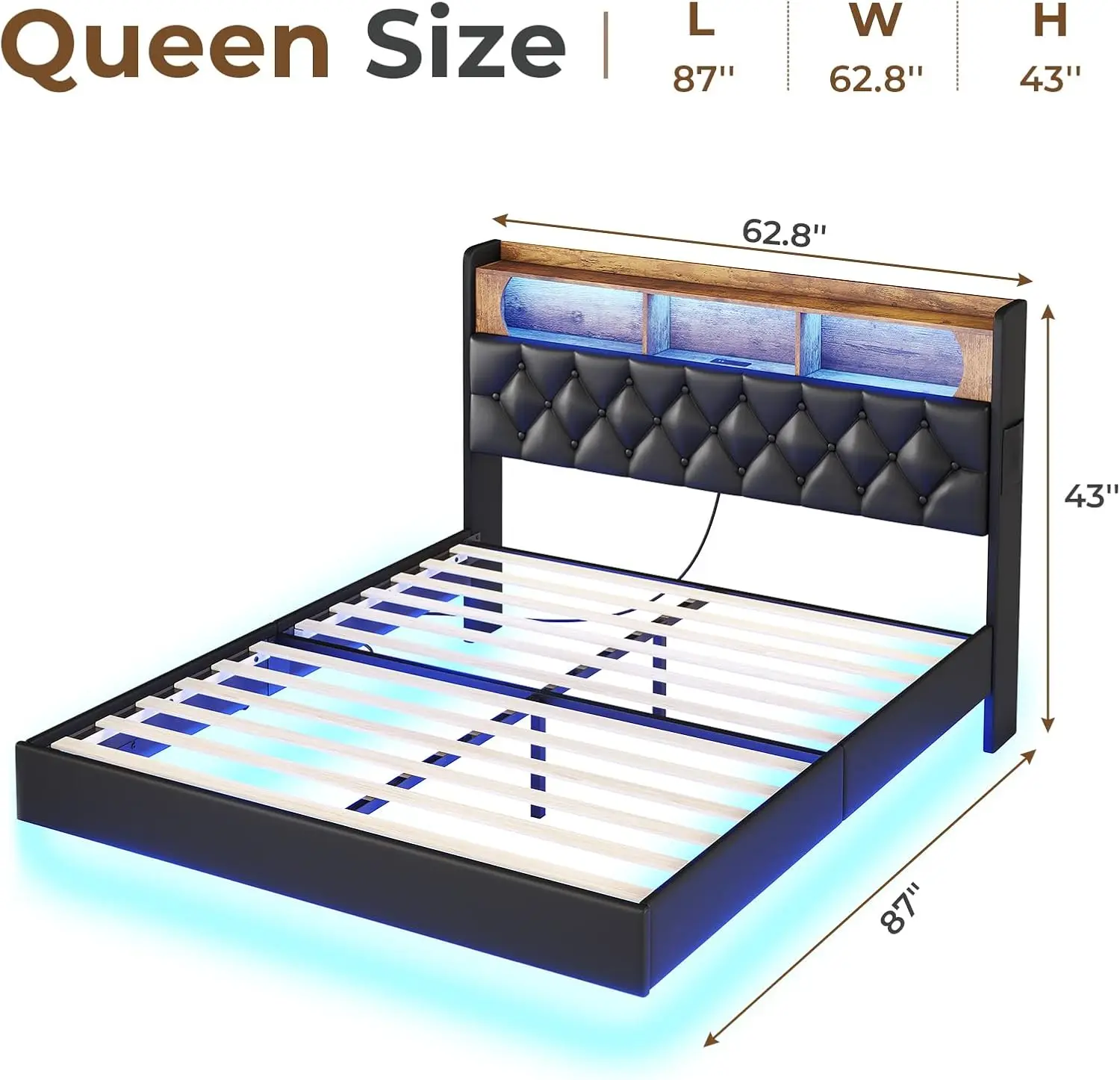 - 【Bed Frame with Charging Station】-The queen floating led bed frame features 2 outlets and 2 USB ports, which is very convenient for you to charge your mobile phone,pad and other electronic devices. Accompanied by a 6.6ft long power supply cord, you can use to charge electronic equipment while you sleep and charge up to three devices at once.