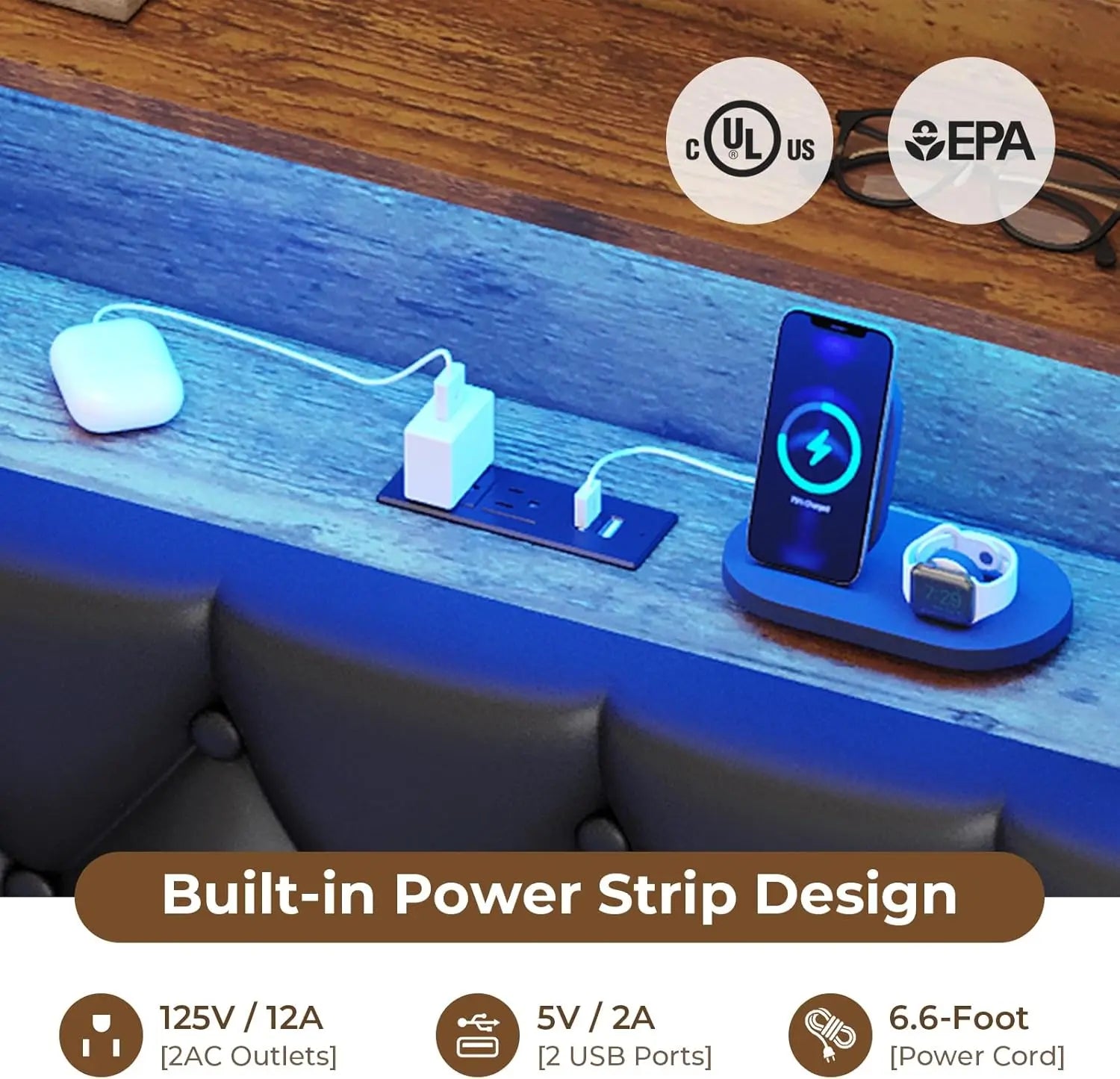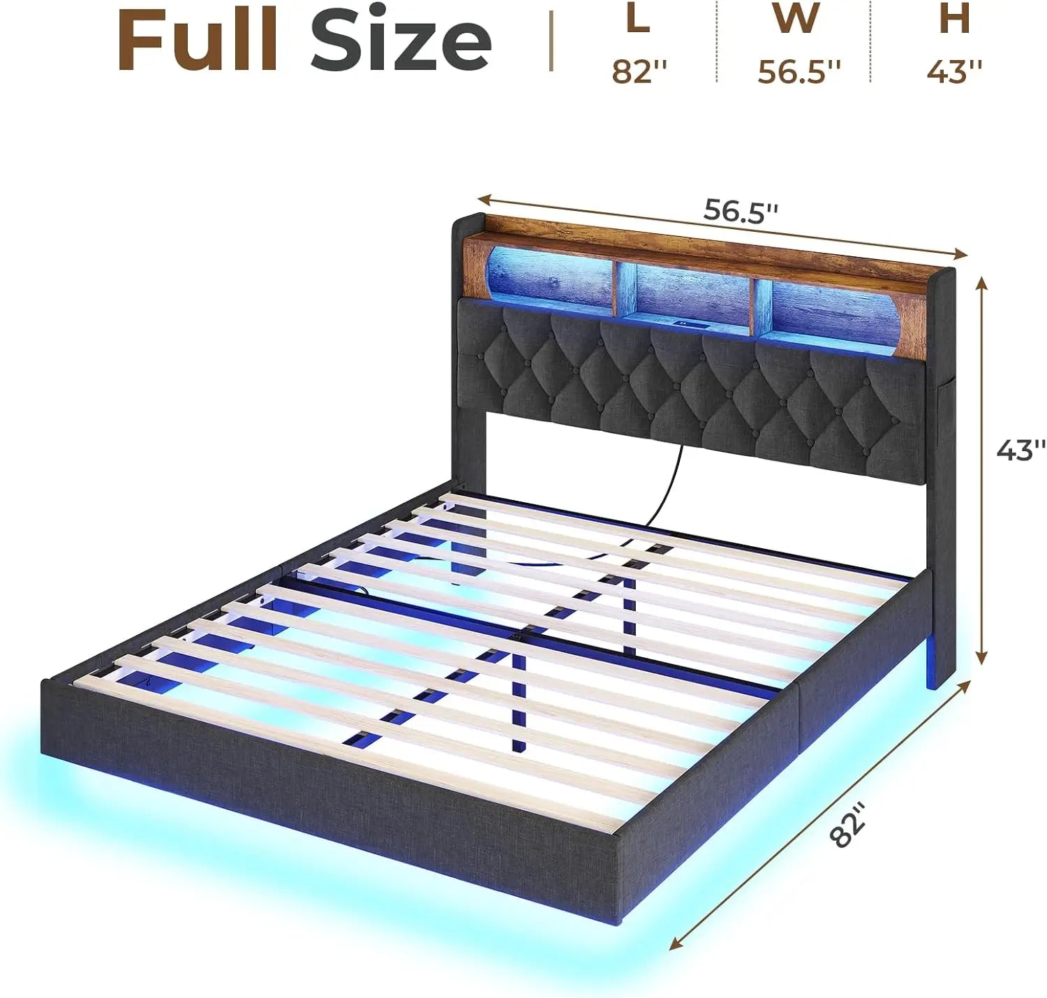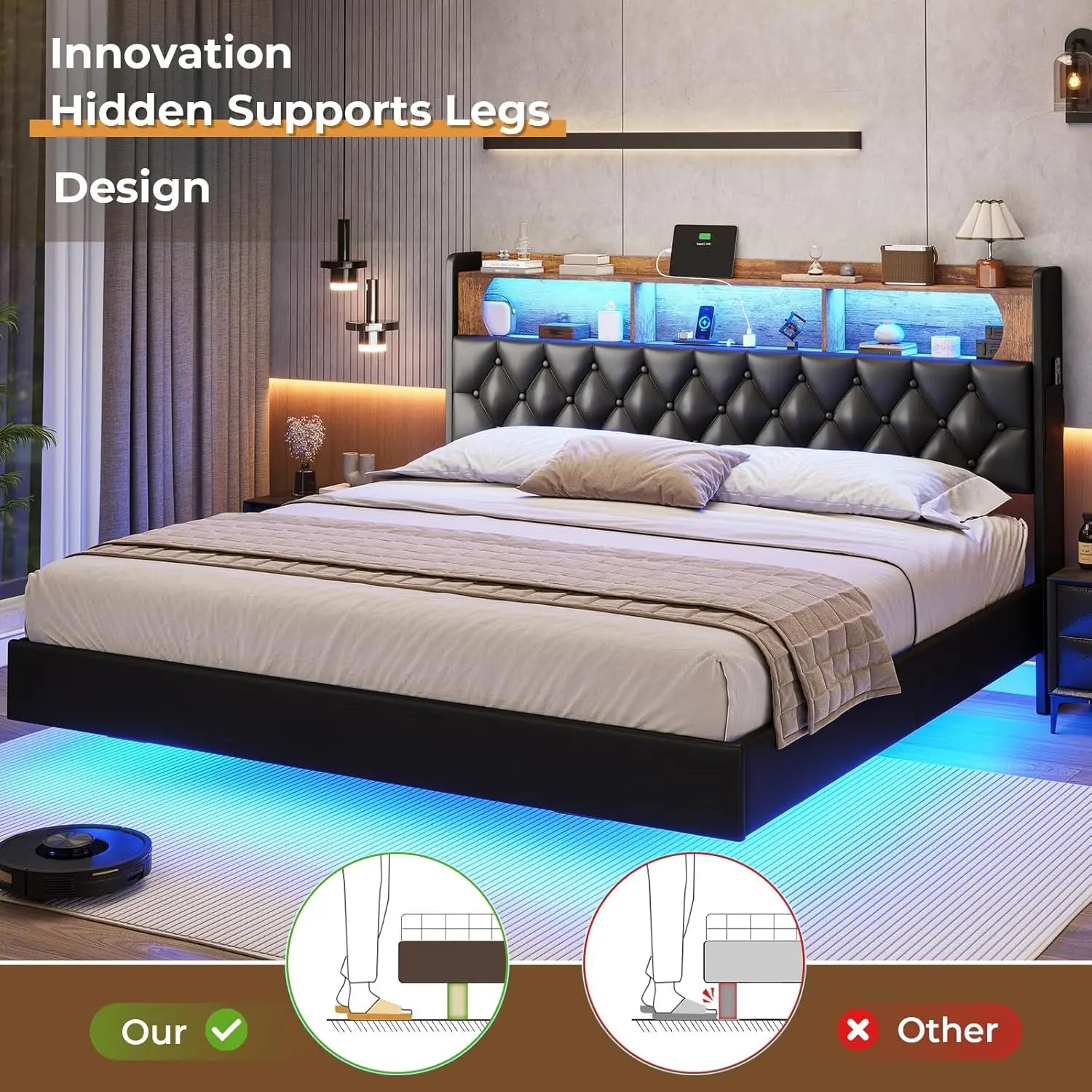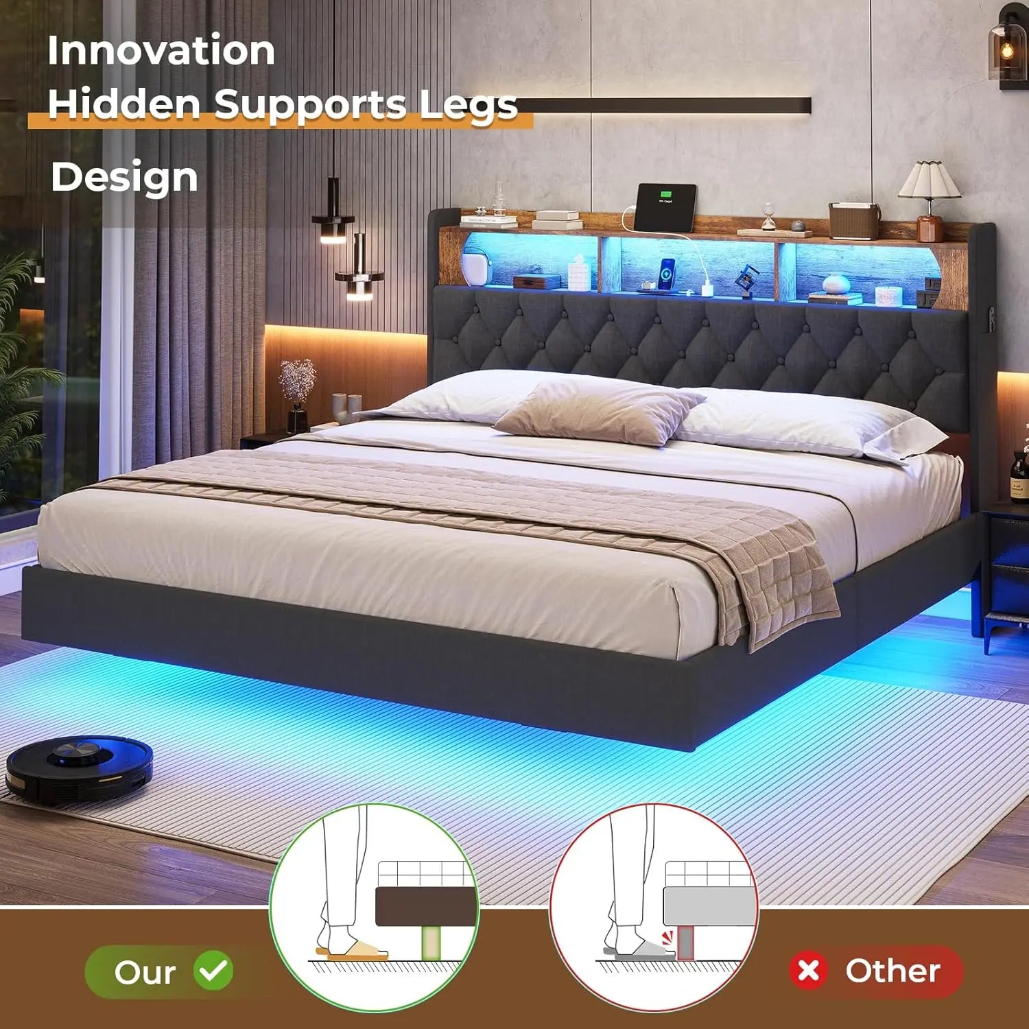 - 【Bed Frame with Charging Station】-The queen floating led bed frame features 2 outlets and 2 USB ports, which is very convenient for you to charge your mobile phone,pad and other electronic devices. Accompanied by a 6.6ft long power supply cord, you can use to charge electronic equipment while you sleep and charge up to three devices at once.