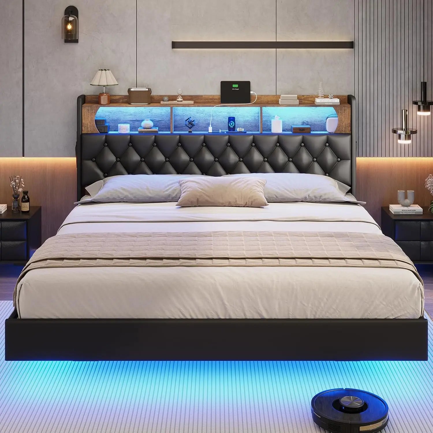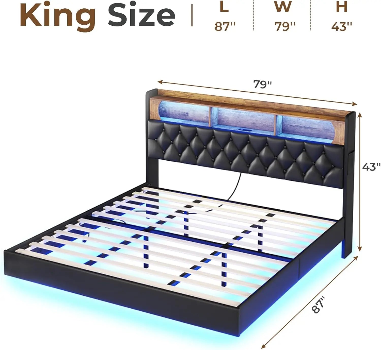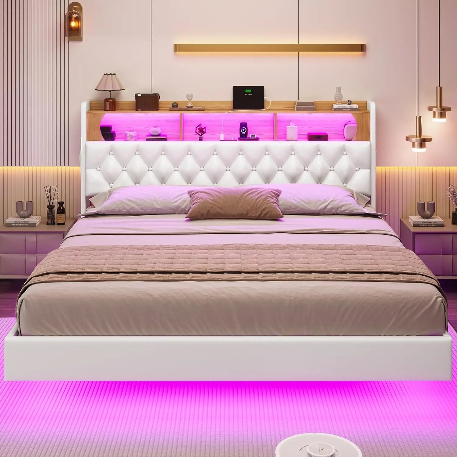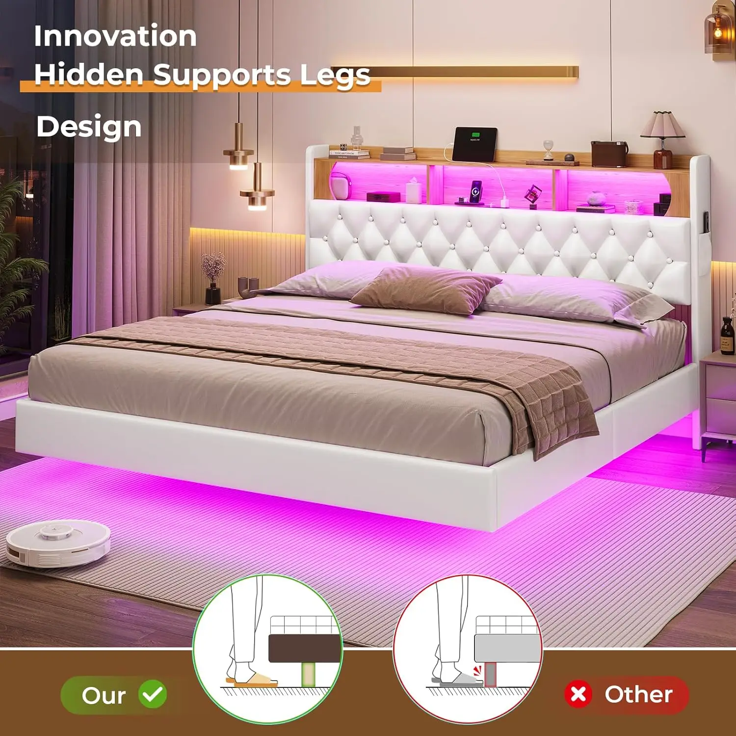 Floating Bed Frame, Floating Platform Bed with Charging Station with LED Lights & Storage Headboard, Modern LED Floating Bed