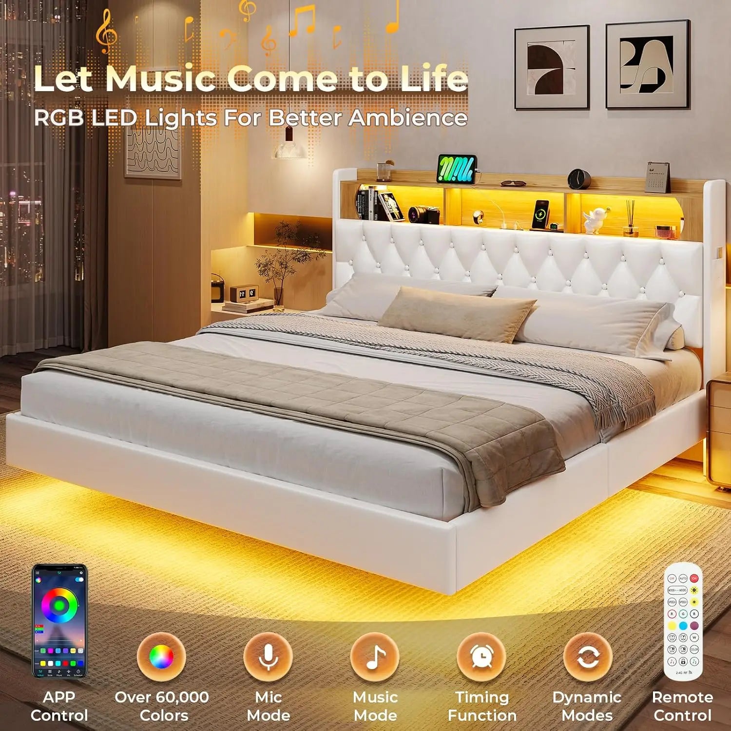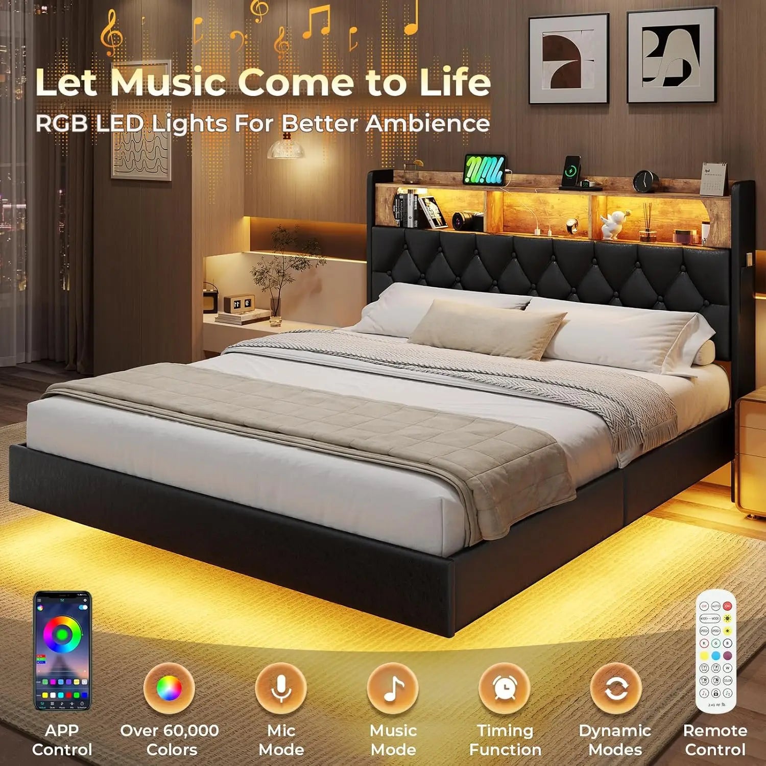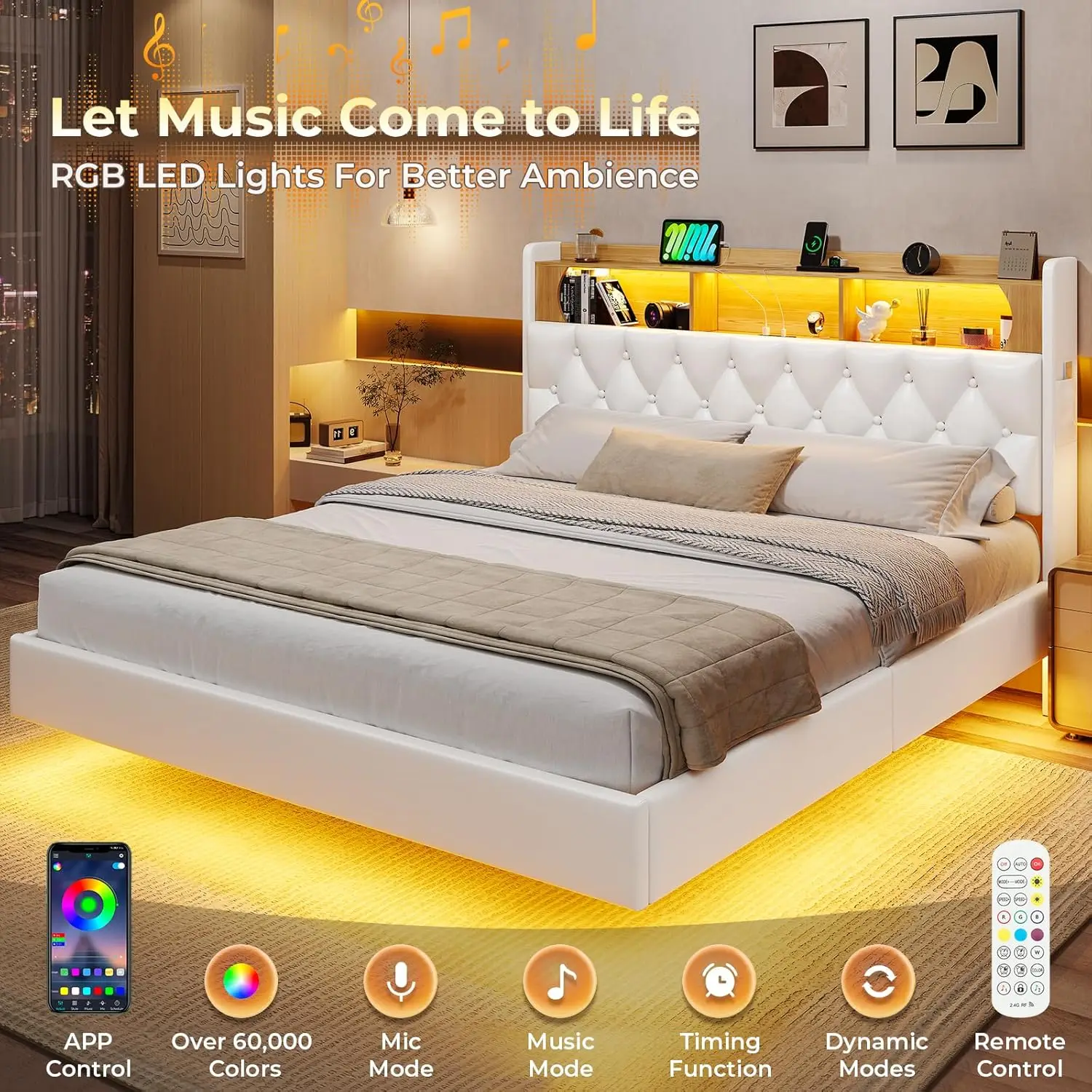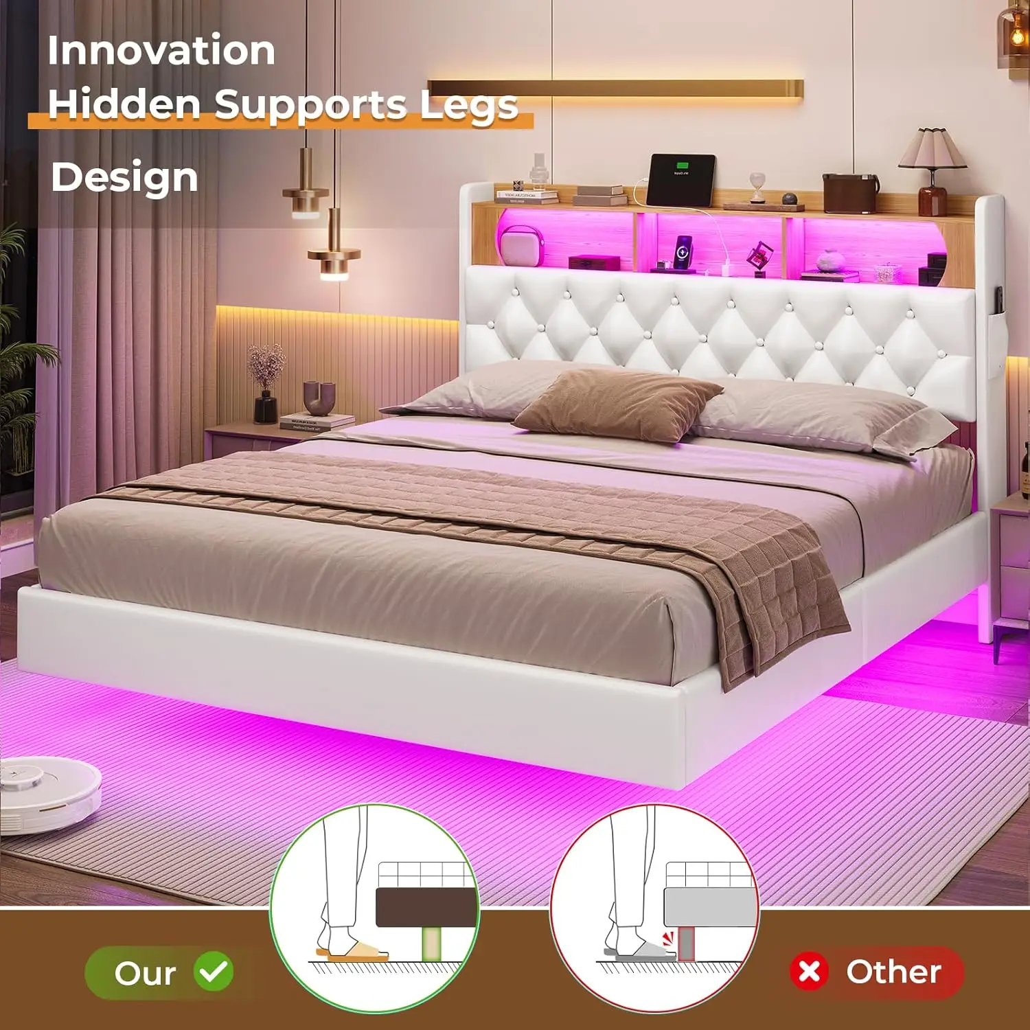 Floating Bed Frame, Floating Platform Bed with Charging Station with LED Lights & Storage Headboard, Modern LED Floating Bed