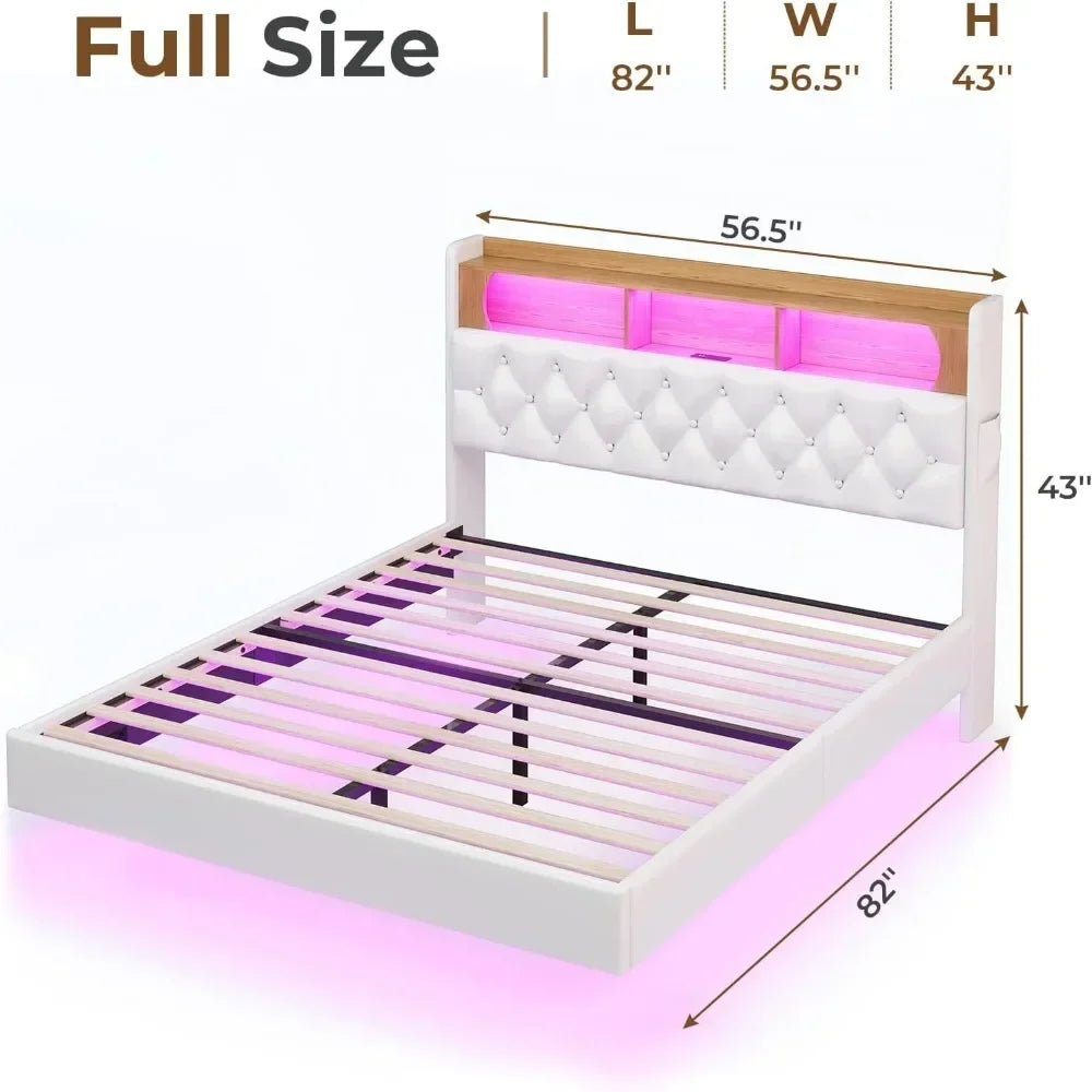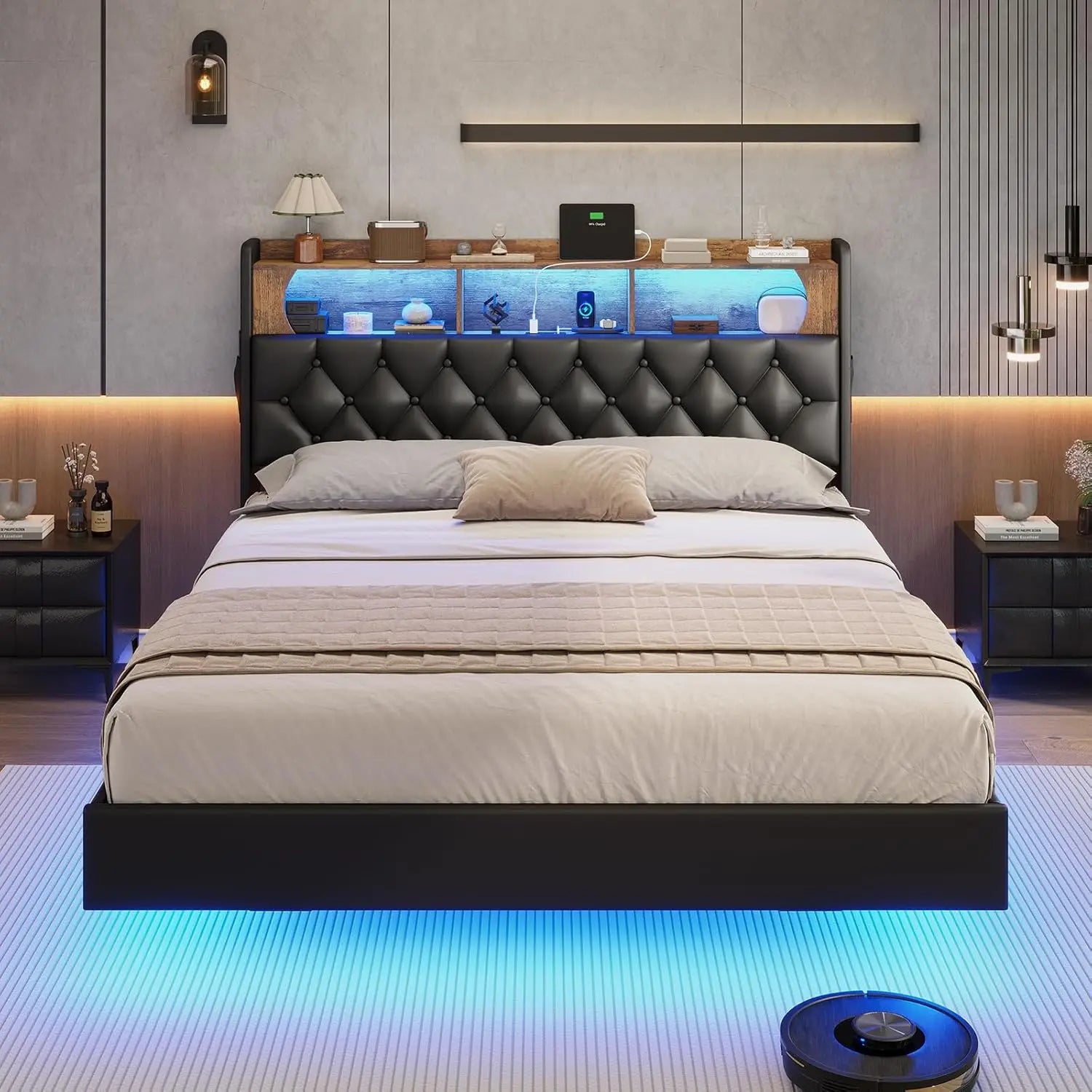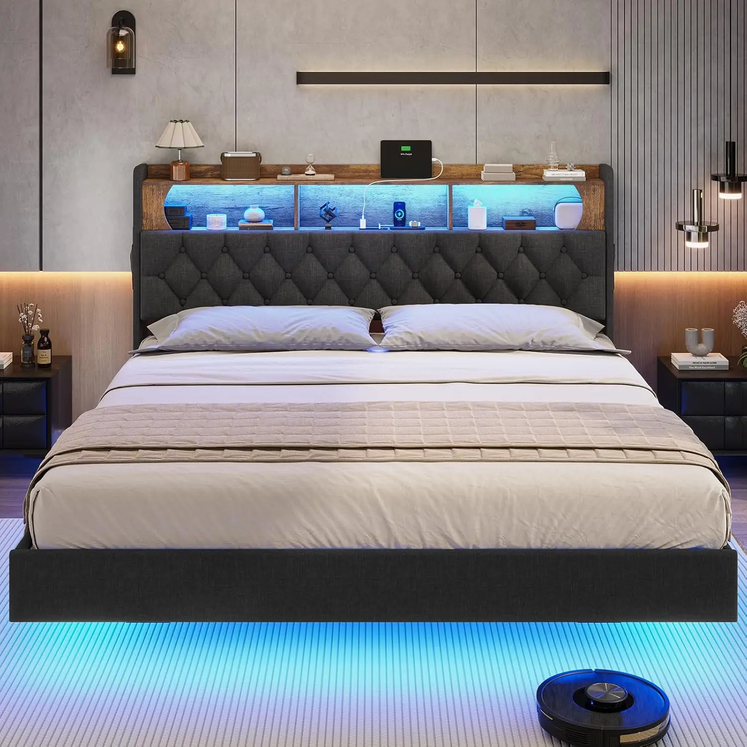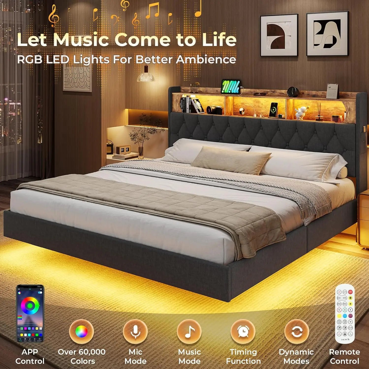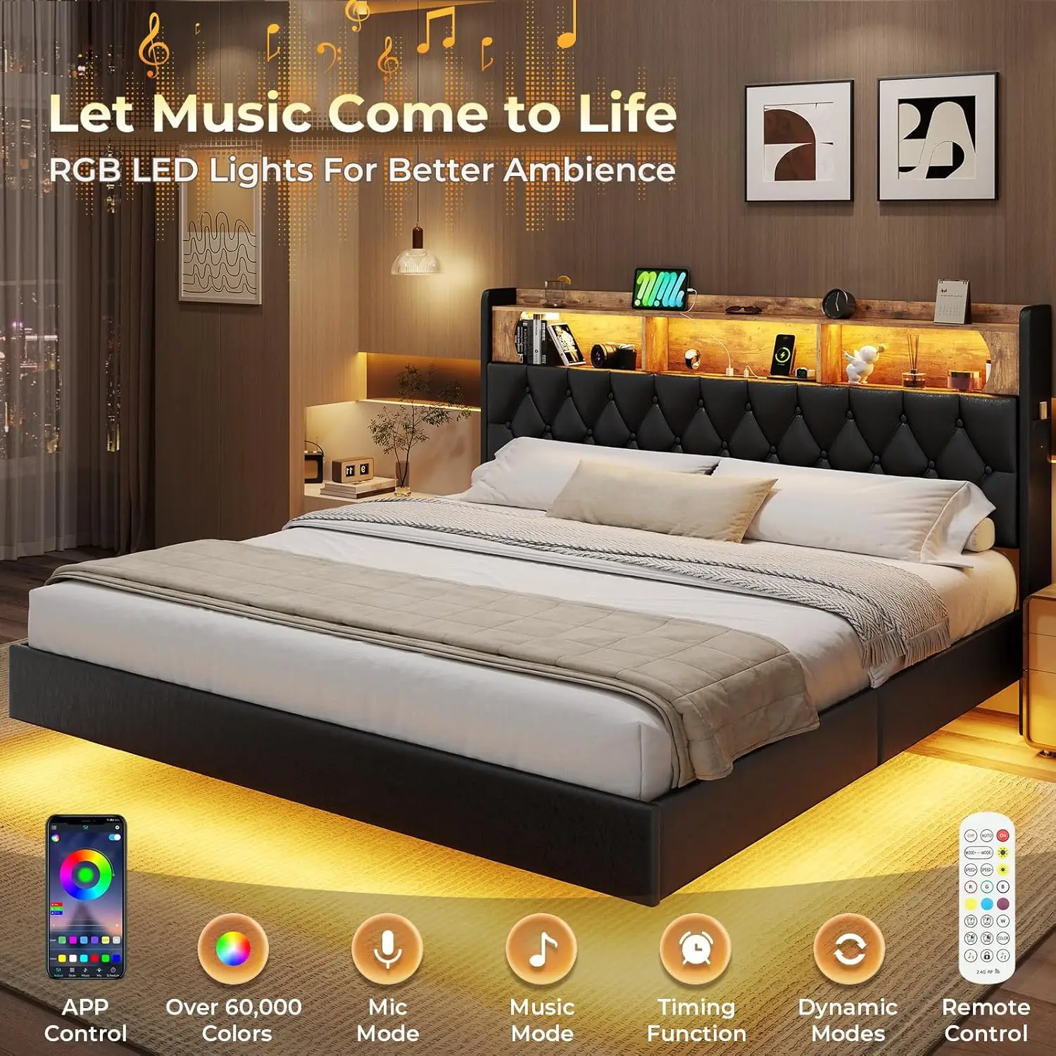 Floating Bed Frame, Floating Platform Bed with Charging Station with LED Lights & Storage Headboard, Modern LED Floating Bed