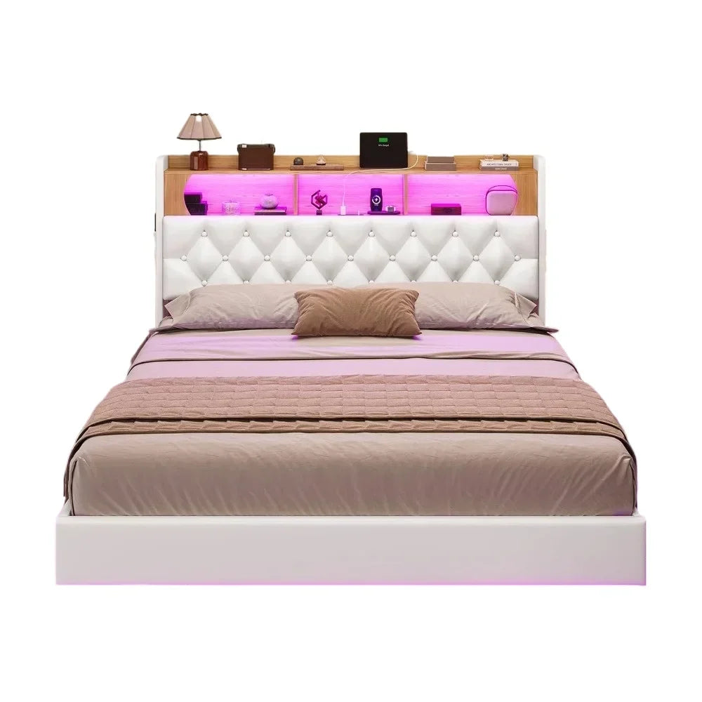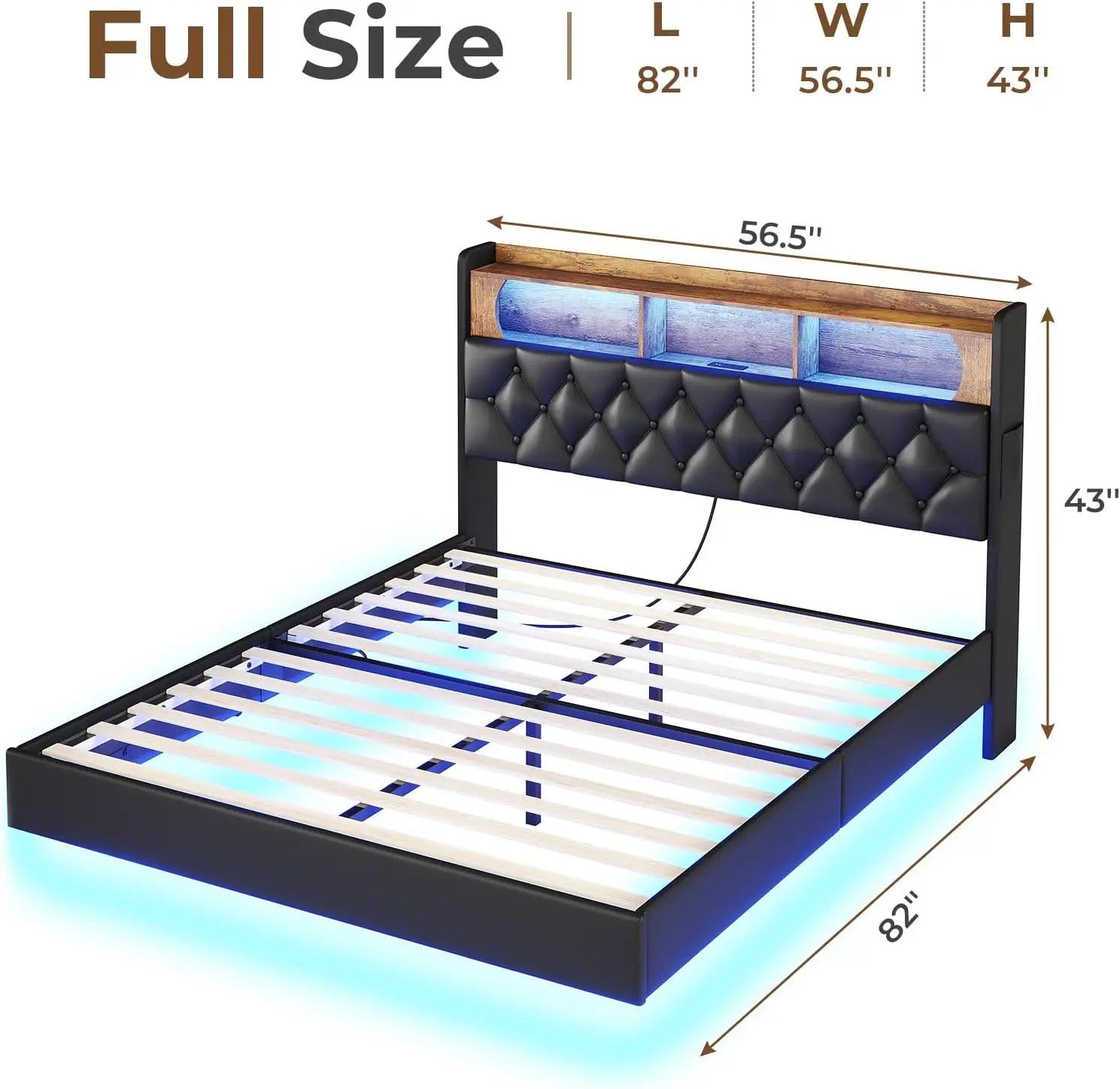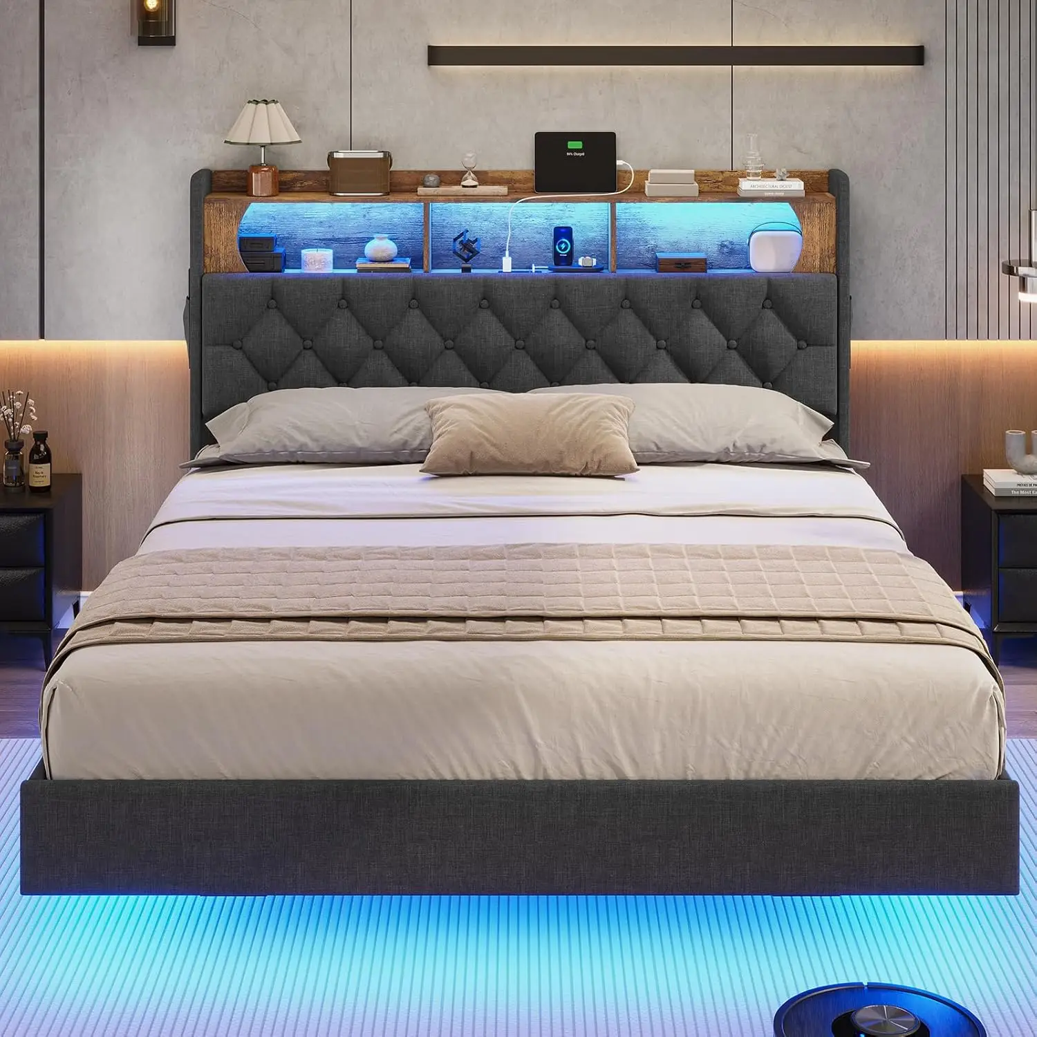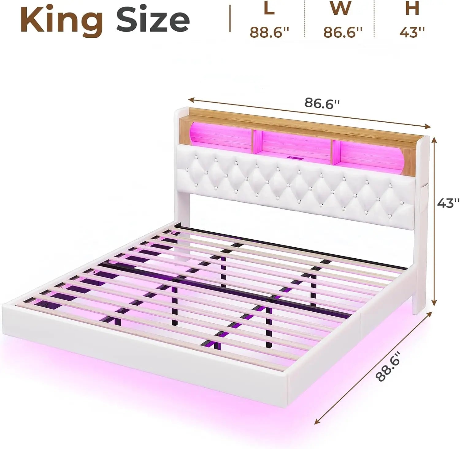 Floating Bed Frame, Floating Platform Bed with Charging Station with LED Lights & Storage Headboard, Modern LED Floating Bed