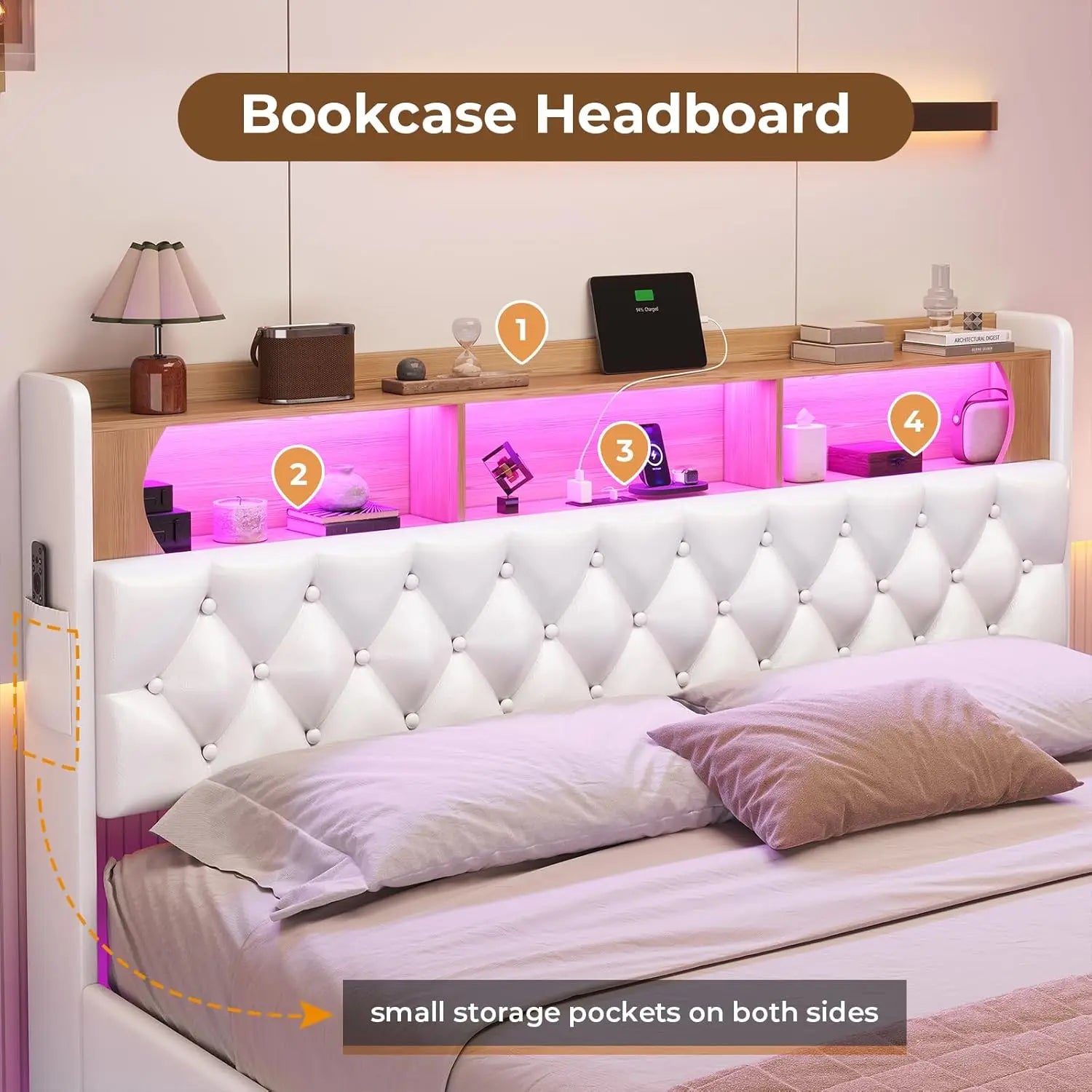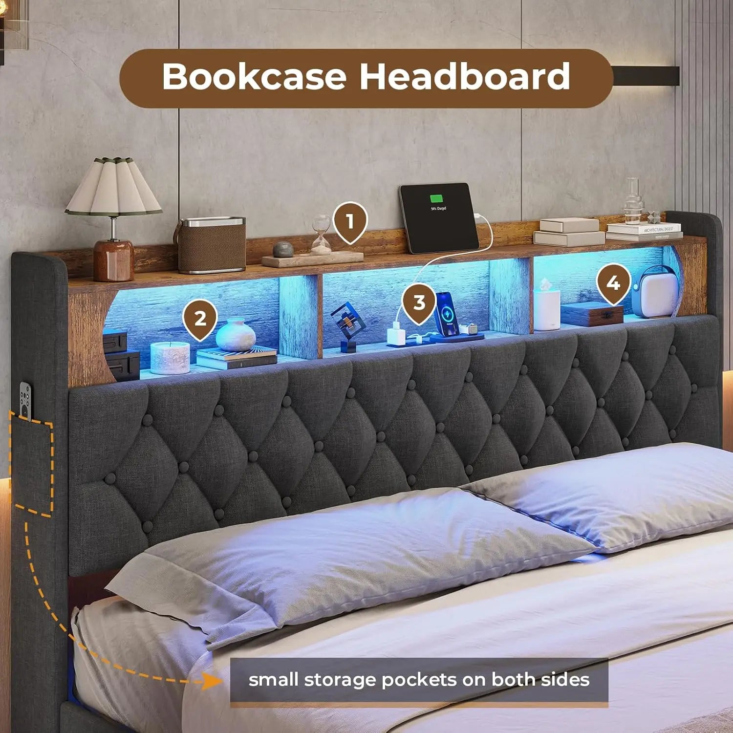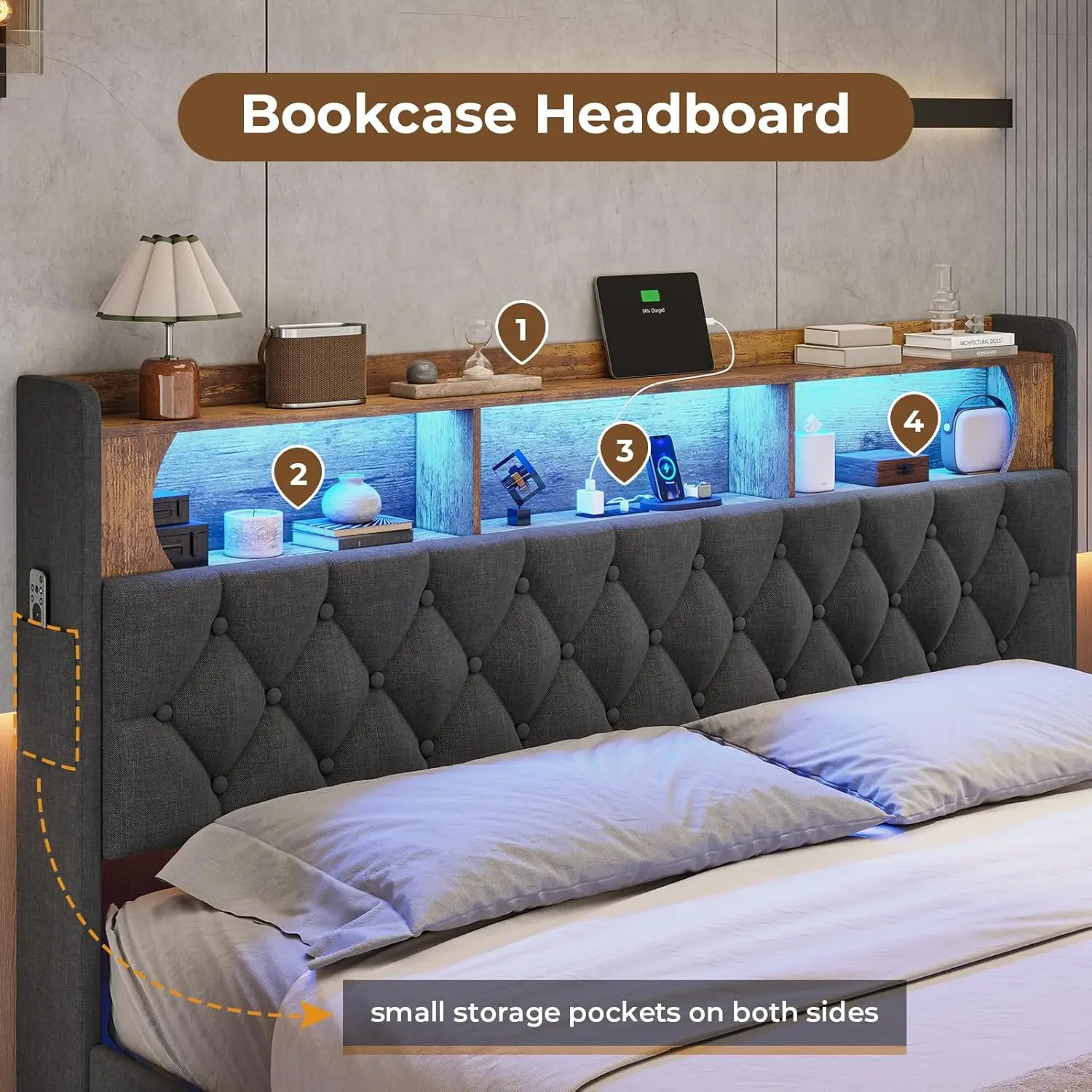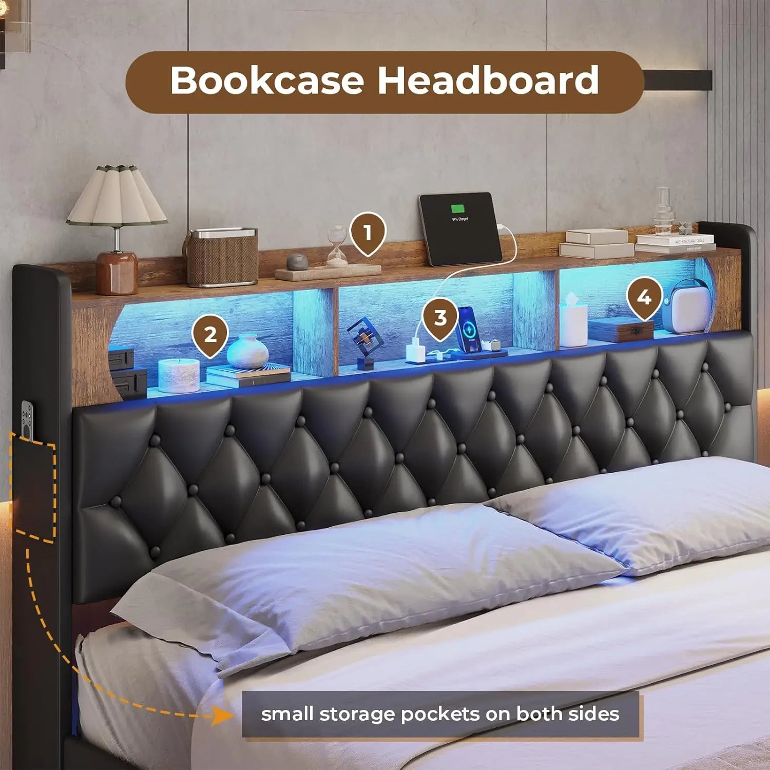 - 【Queen Bed Frame with Bookcase Headboard】-Headboard has 3 compartments, and the top leaves enough space as storage shelf to place your glasses, phone and remote, etc. Headboard is made of soft-to-touch PU Leather, built in memory foam with high resilience, bringing your back optimal support and comfort.