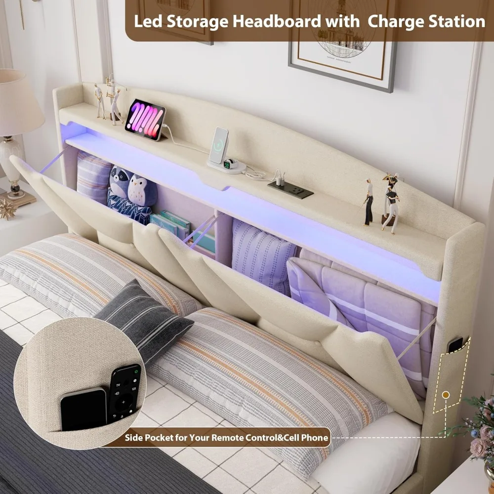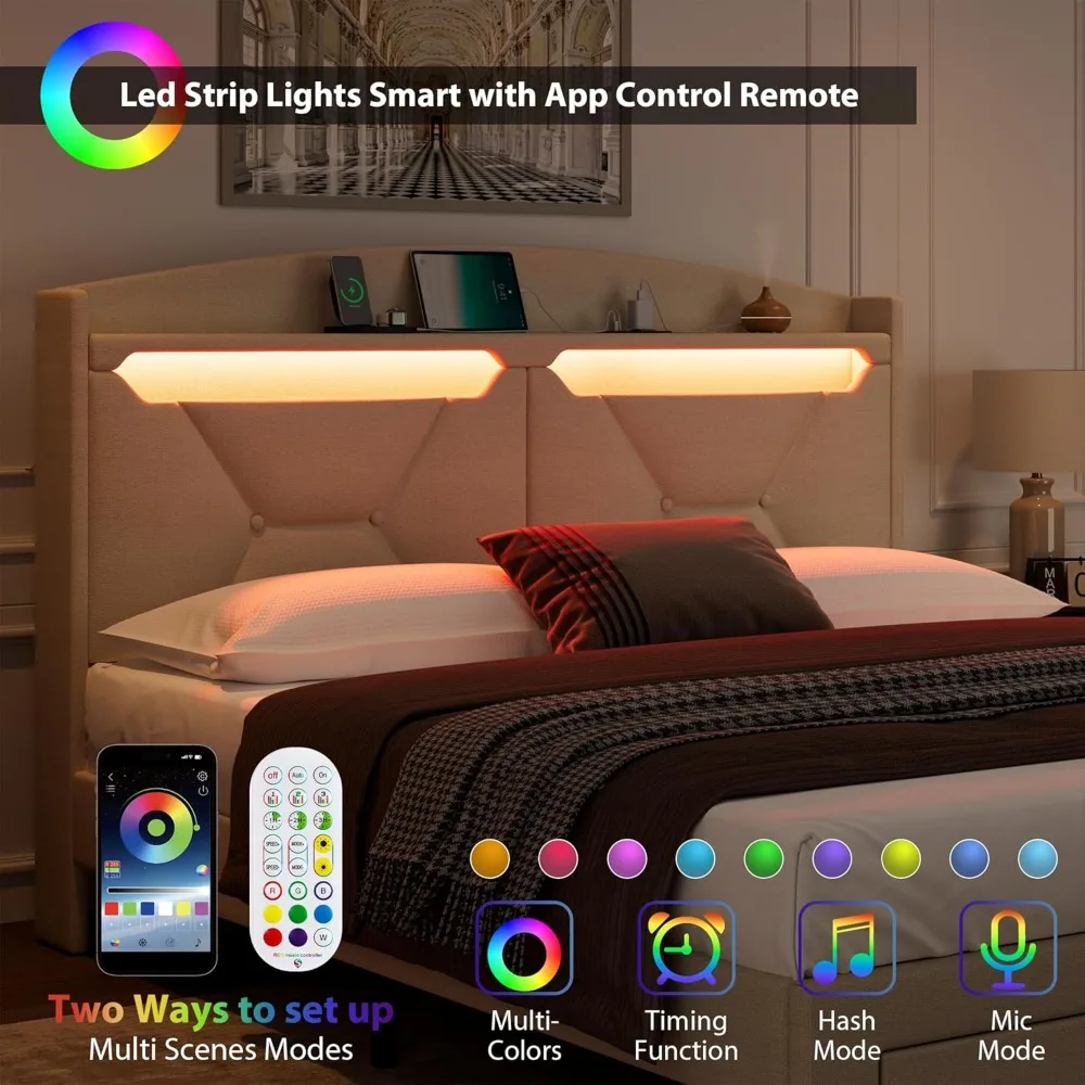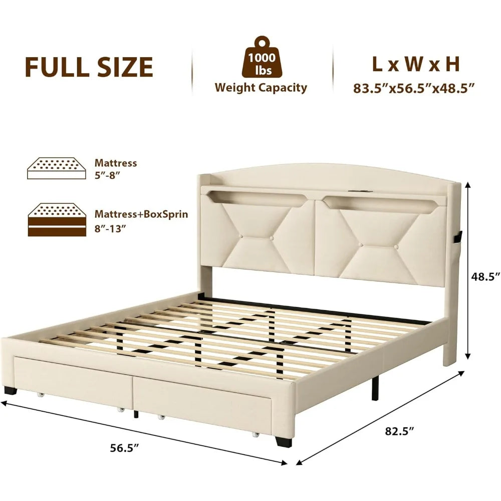 Full Bed Frame with Storage Headboard, Upholstered LED Bed Frame with 2 Storage Drawers Charging Station,Wood Slats Support
