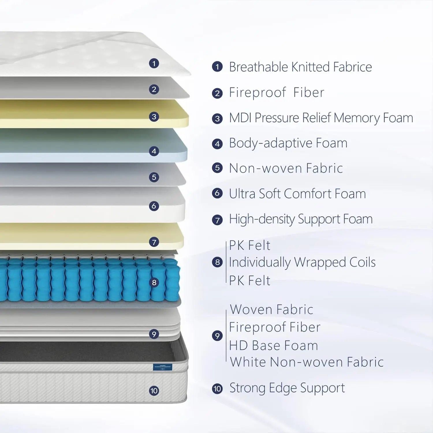 - Memory Foam Hybrid Construction: Experience Memory Foam Hybrid Mattress. This innovative design incorporates memory foam for personalized comfort, contouring to your body's unique shape, and a 7-Zone Individual Pocket Springs Mattress for targeted support, promoting optimal spinal alignment.