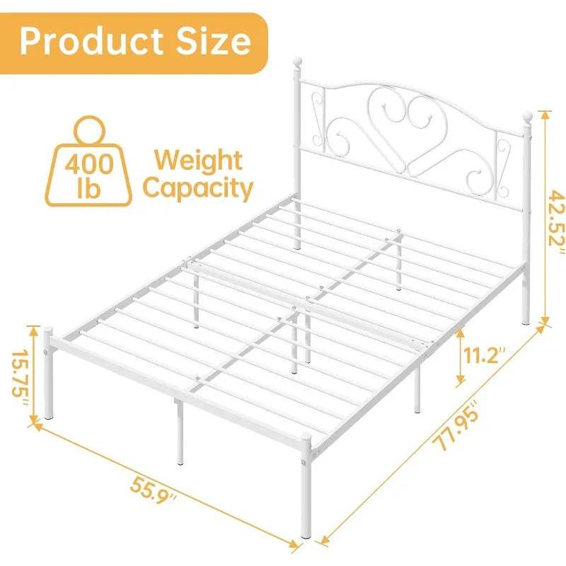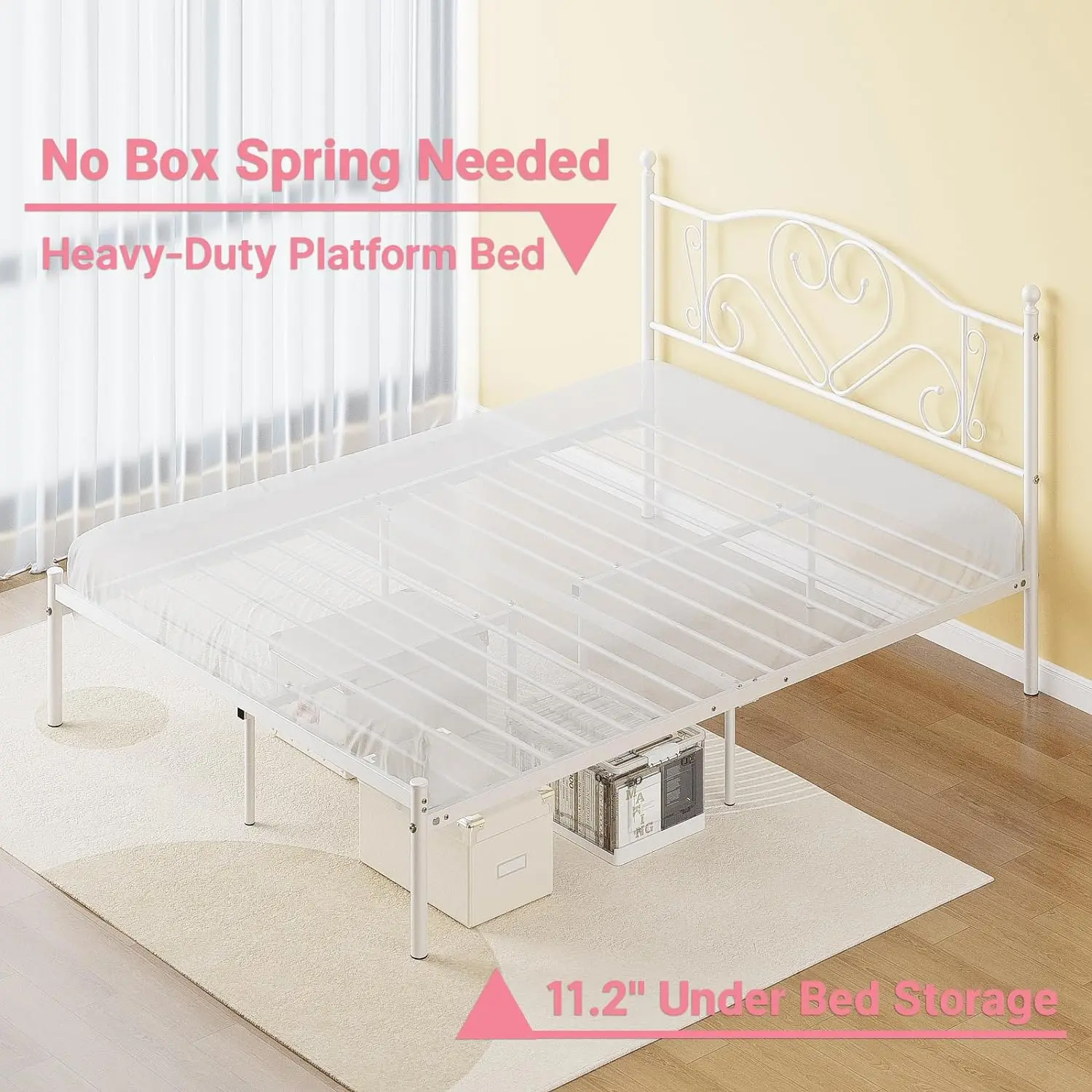 Full Size Bed Frame with Headboard, Heavy Duty Steel Slat Support Platform Under Bed Storage Space No Box Spring Needed, White