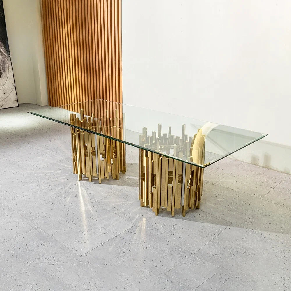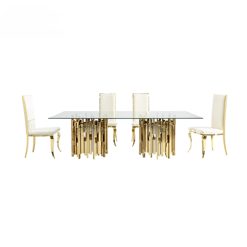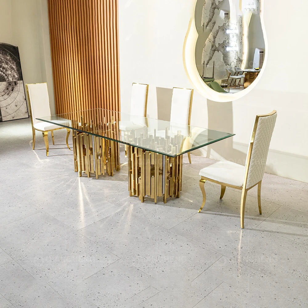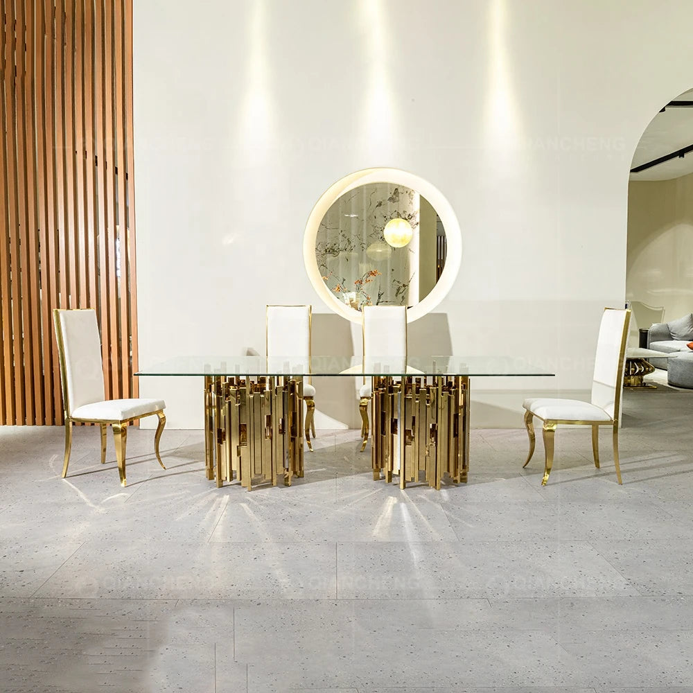 Gold and silver stainless steel metal dinning table and chair set for 4 6 seater luxury malaysia tempered glass top dining table