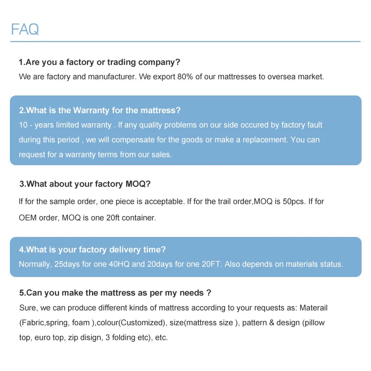 Foshan Rucas Furniture Co.,Ltd. was founded in 2014 .Located in Shunde,Foshan,Guangdong, China. Has got 10+ years experience focus in mattress OEM&ODM business.Professionally prodces Foam mattress and spring mattress. With 10000 square metre factory and 100 staffs , 15000pcs production per month. Build business relationship with 95 partners over 50 countries in the world. Our brand has online shop on US Amazon , Alibaba.com,together selling 40 -80pcs per day online .We also attend CIFF Guangzhou and Shanghai every year.Rucas is a company that strong in design and product ,and it's looking for partners all over the world (retailors , wholesalers and distributors)that seeking for nice product that fits their market. Rucas provide professional 1 to 1 sales service,to help our partners to build a hot sale product , expand to a famous hot sale product series , beating their local competitor ,increase you mattress market share and become the largest mattress business owner in your country! Please contact us and start your mattress business righ away!