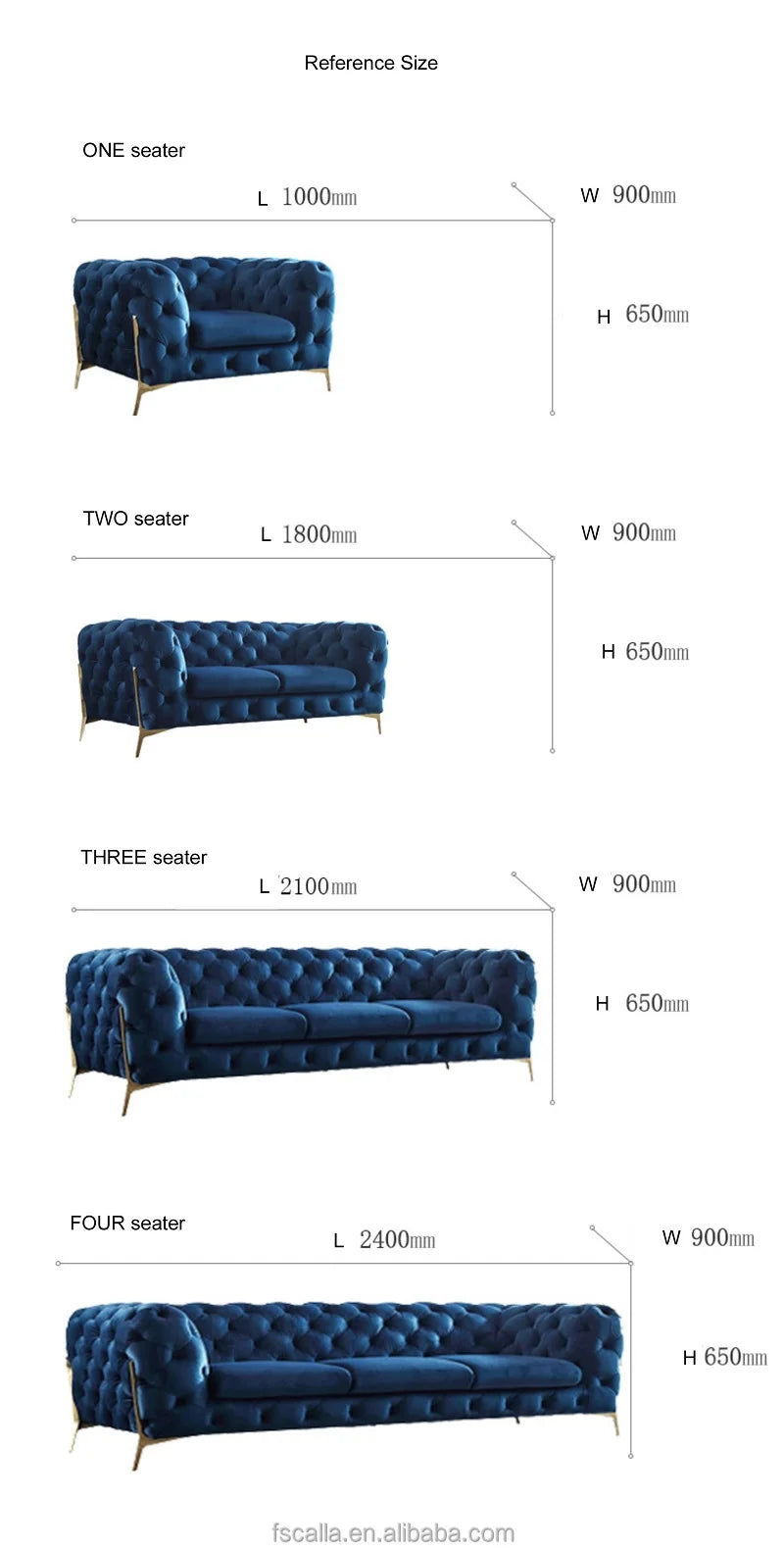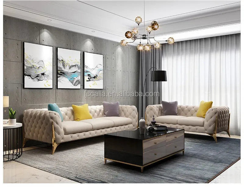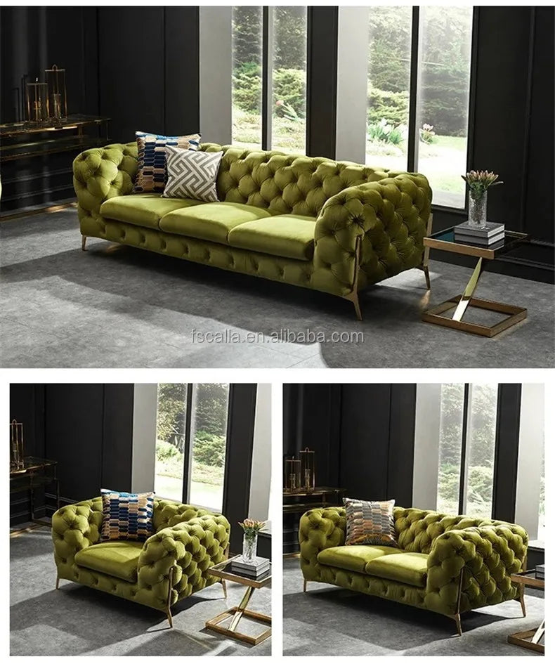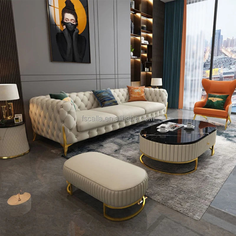 Home Furniture Chesterfield Design Royal Luxury Gold Foot Living Room Genuine Leather Velvet Sofa Set