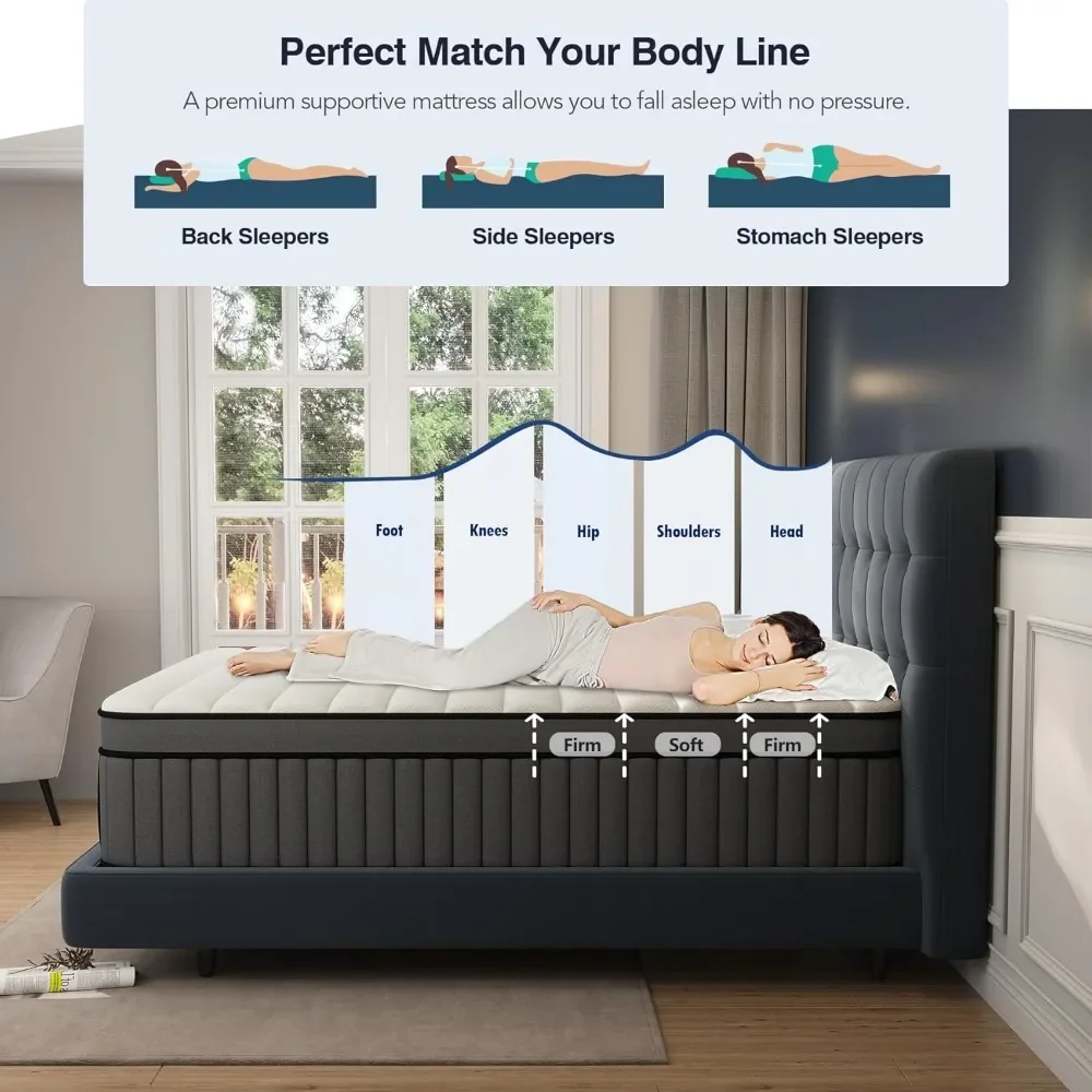 - Pressure Relief - Hybrid mattress Queen is topped with skin-friendly knitted fabric top layer, breathable and moisture-absorbent.The hybrid mattress Queen is made from multiple layers of memory foam that mold to the shape of your body, which will providing support for every part of your body and allowing you to maintain a comfortable sleep position,relieve back pain. Memory foam mattress Queen helping to relieve back pain and caring your spine