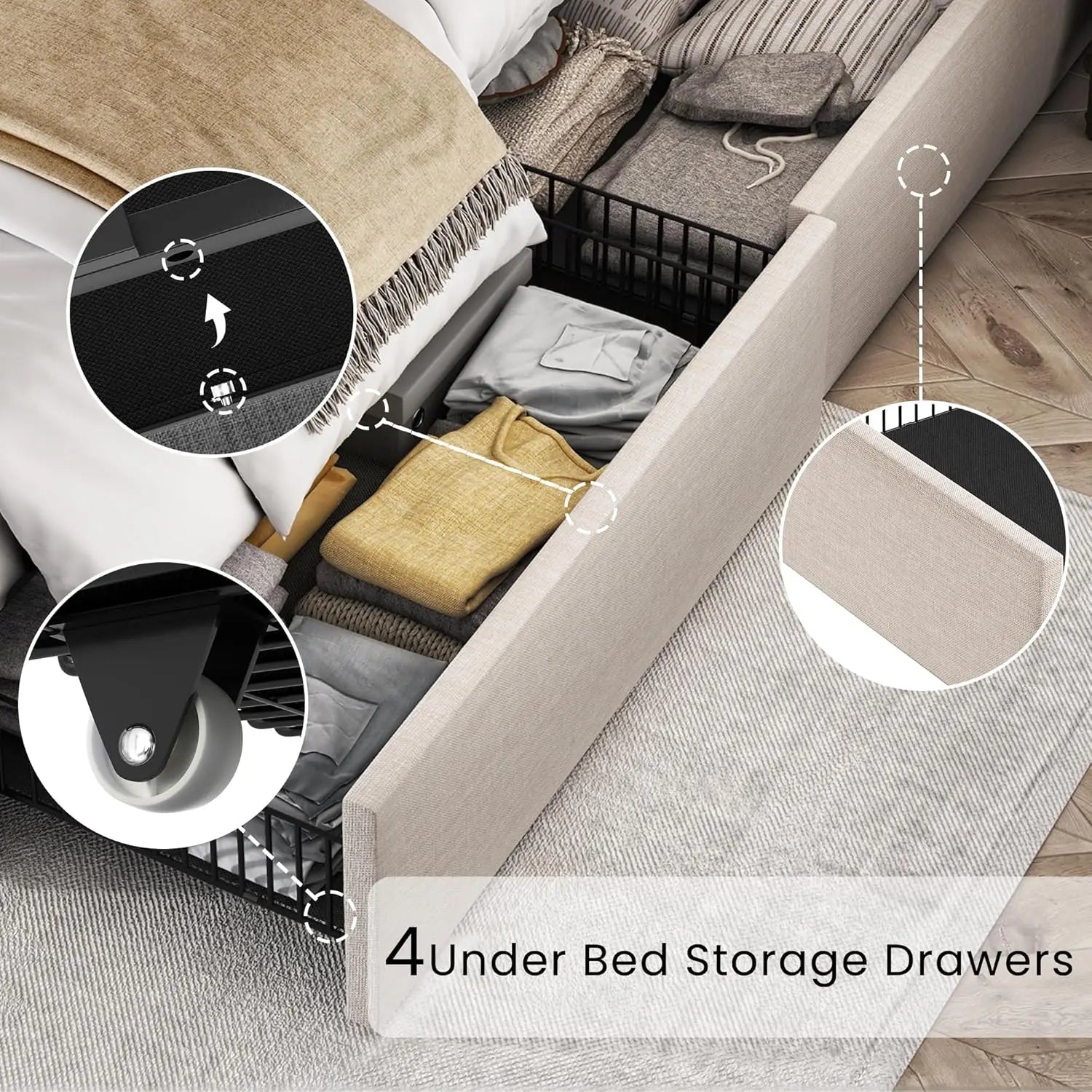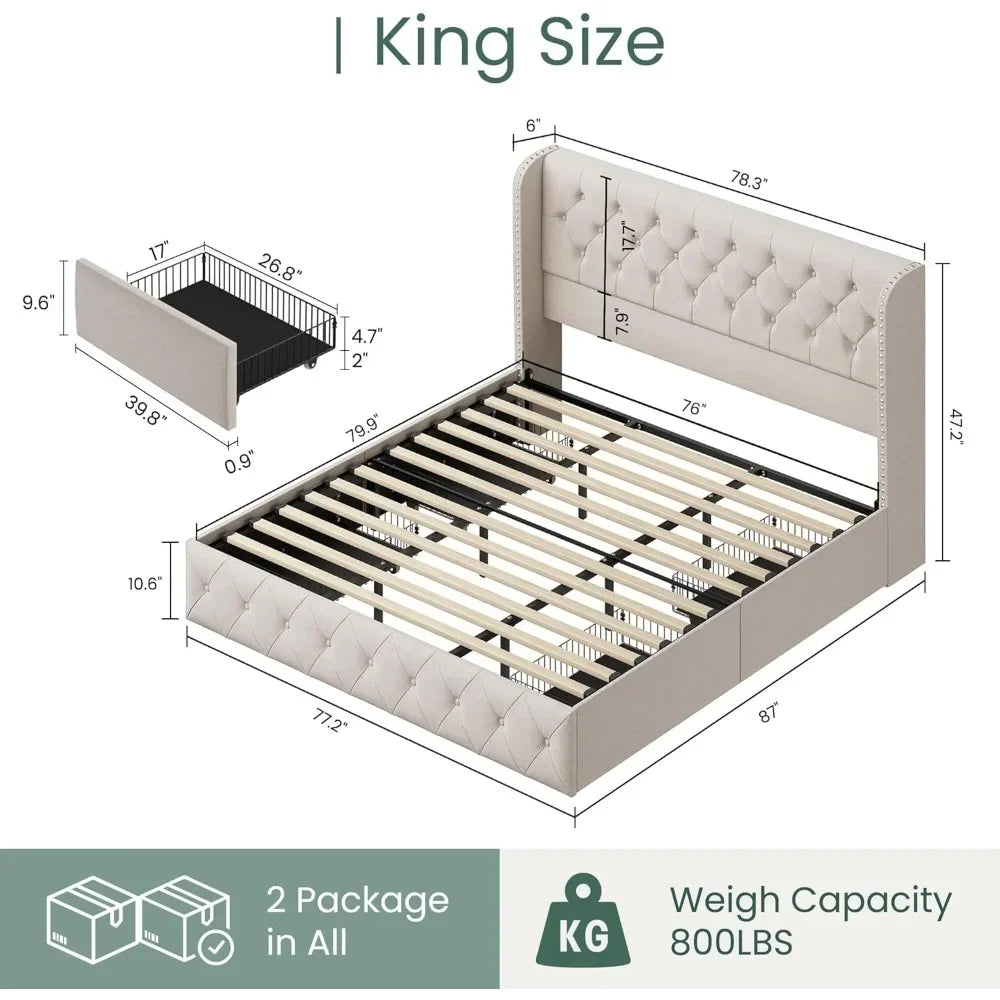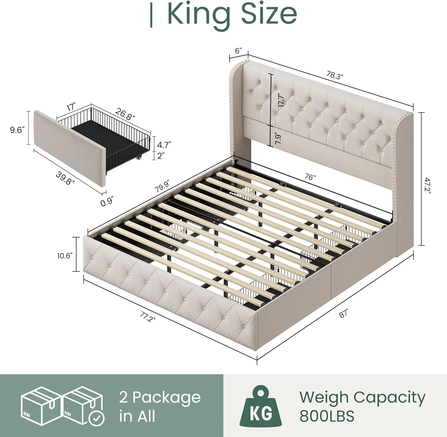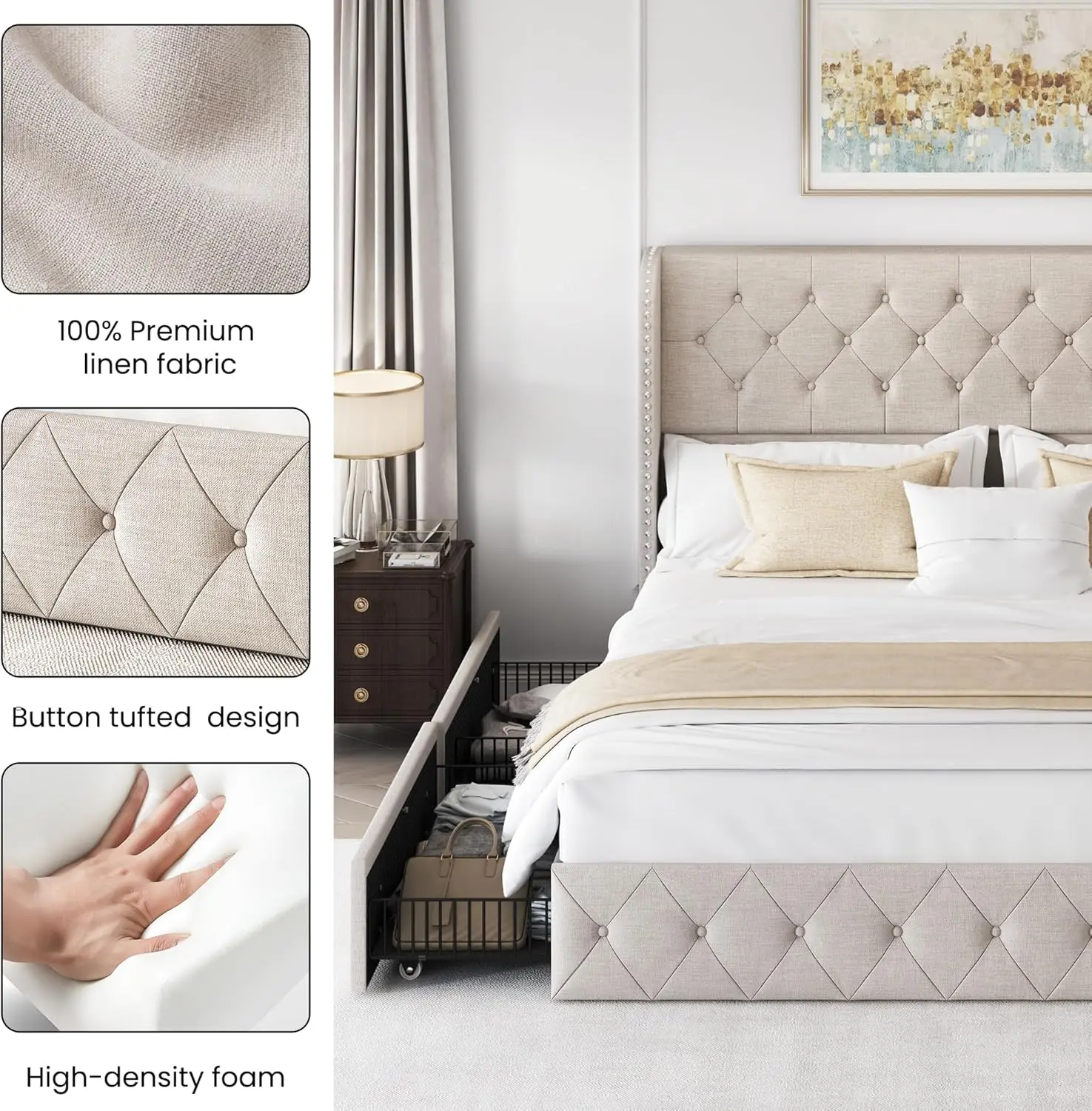King Size Bed Frame with 4 Storage Drawers and Tufted Headboard Linen Upholstered Platform Bed Frame Wingback Beds.